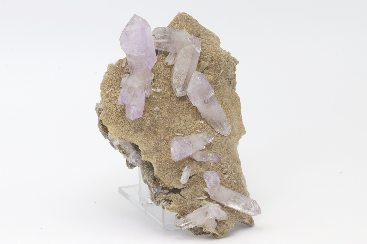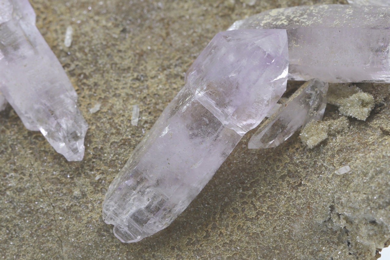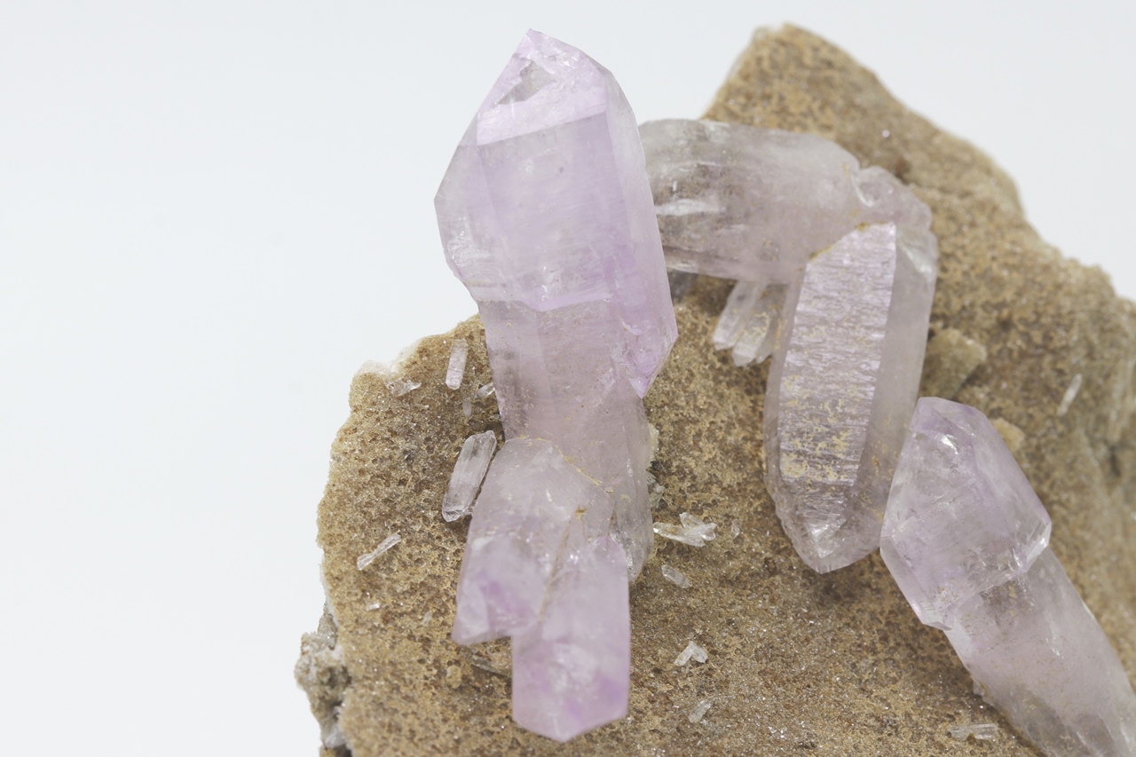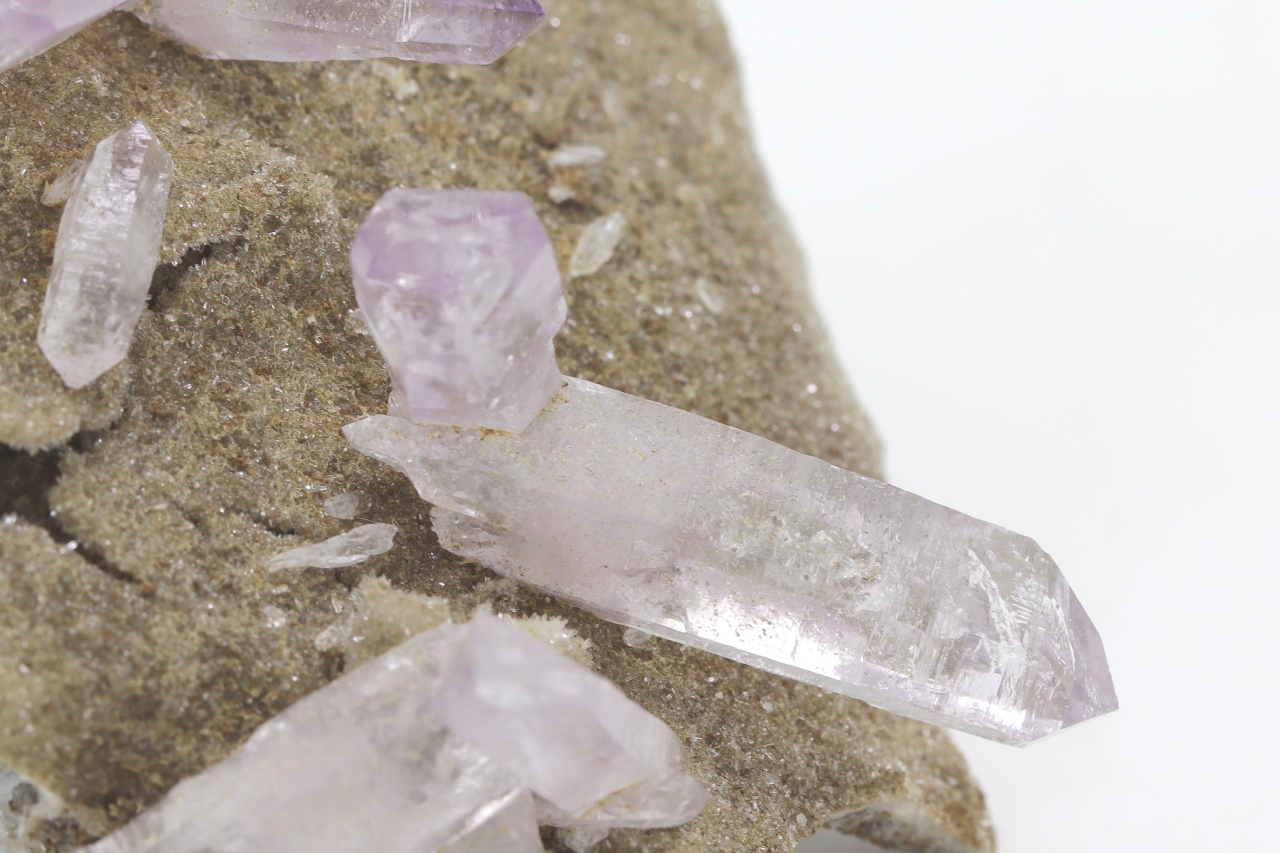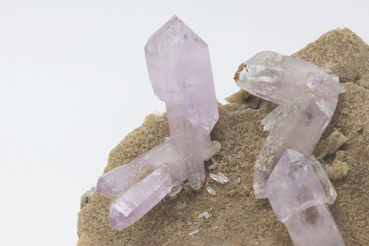Zepter crystals – some double-terminated – very clear, purple amethyst grown on a contrasting beige base. The largest crystal is 4 cm big.
