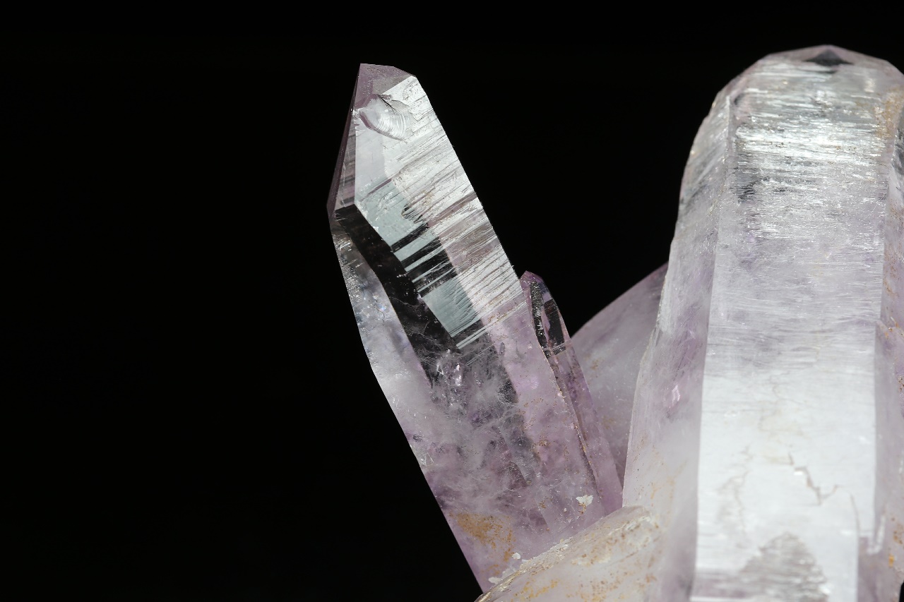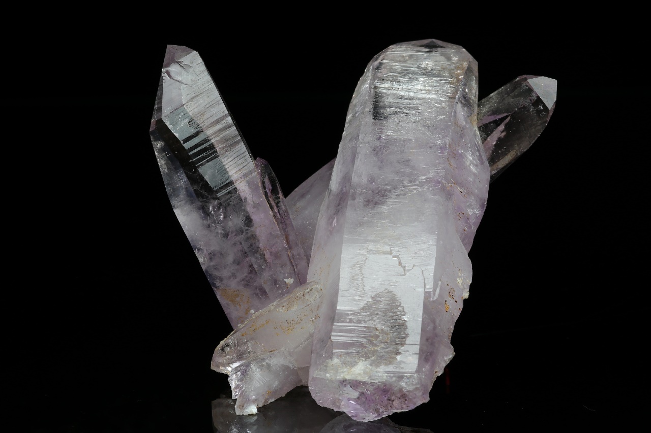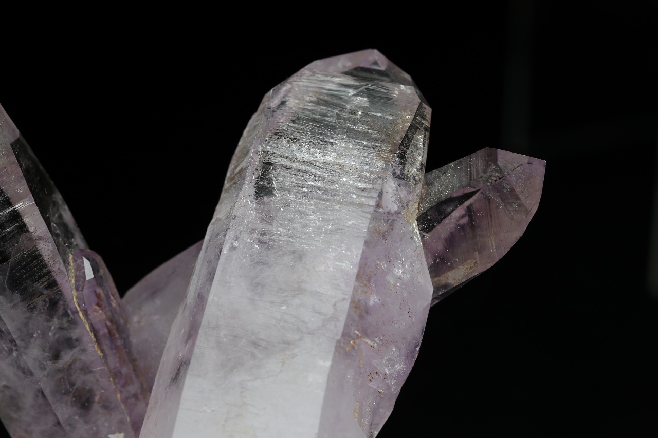 Clusters of very pure, shiny, light purple amethyst crystals. The largest crystal (on the right) is 9.5 cm large.