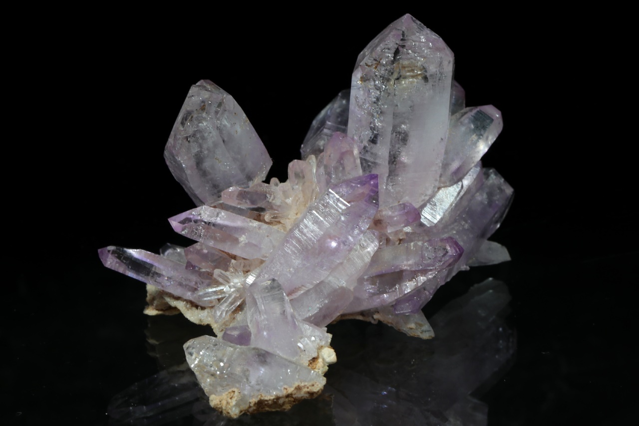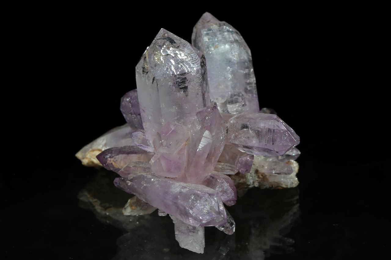 Cluster of very pure, shiny amethyst crystals, of which the two largest are so-called scepter-shaped. The largest crystal is 4 cm big.