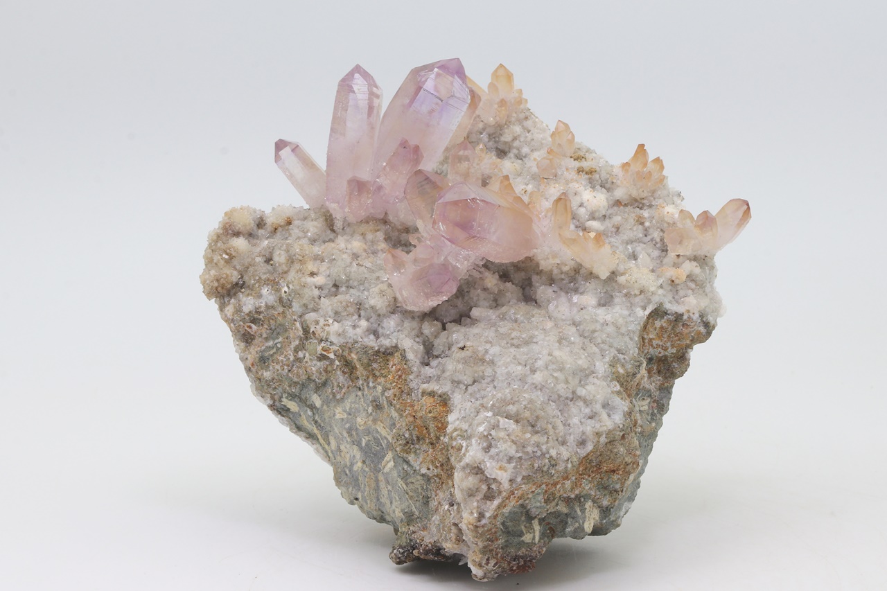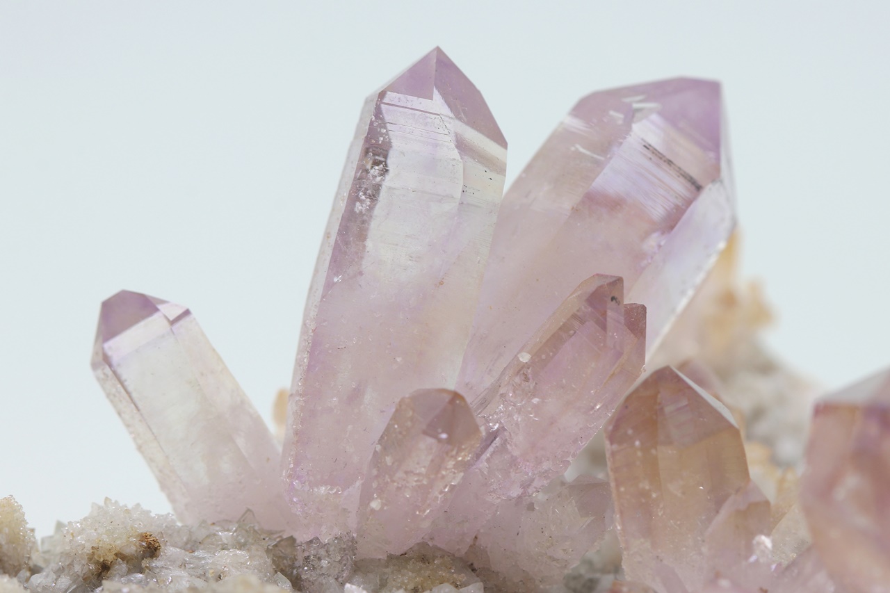 Crystals of very pure, light purple amethyst grown on a substrate. The largest crystal is 3.5 cm big.
