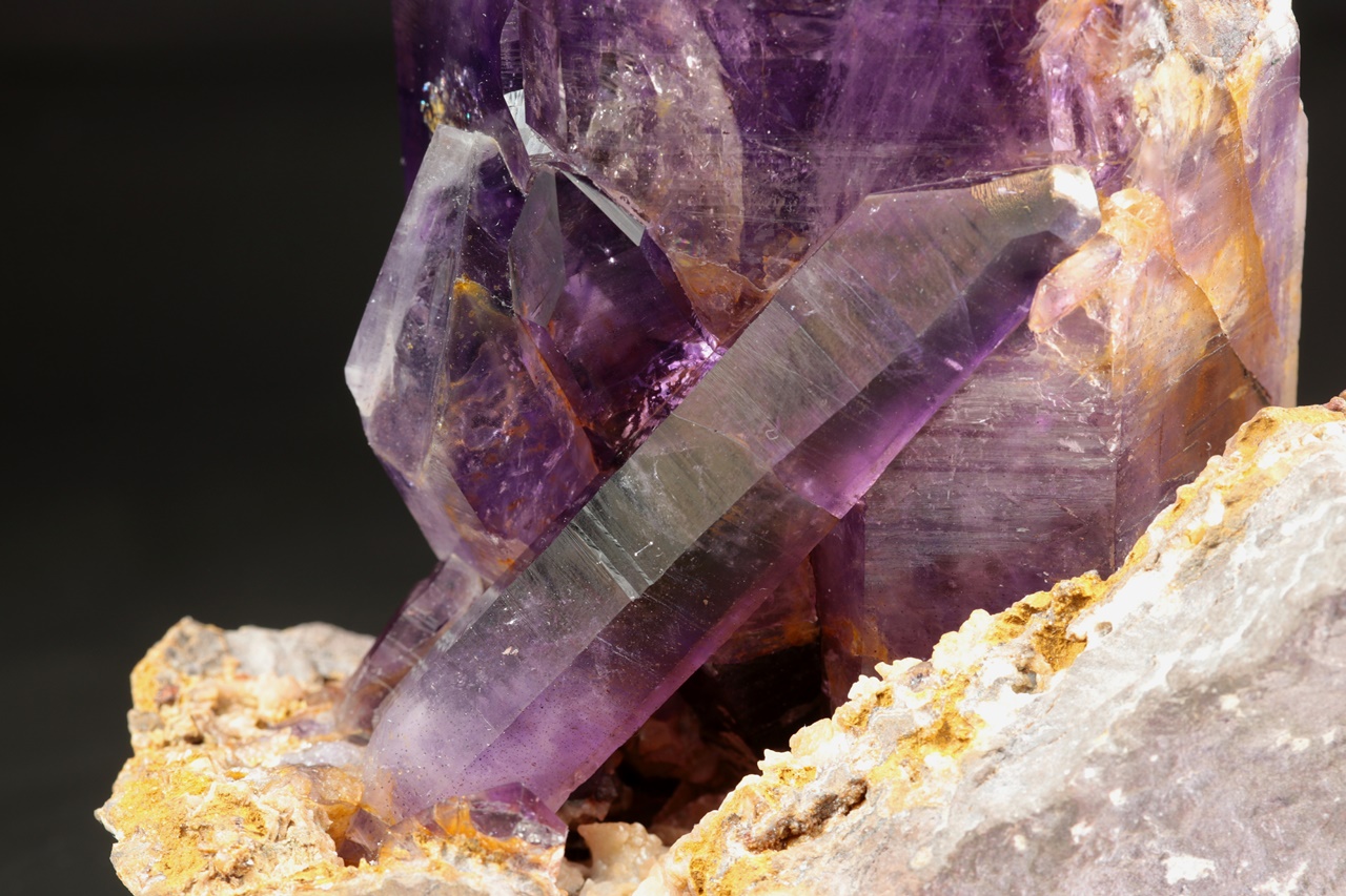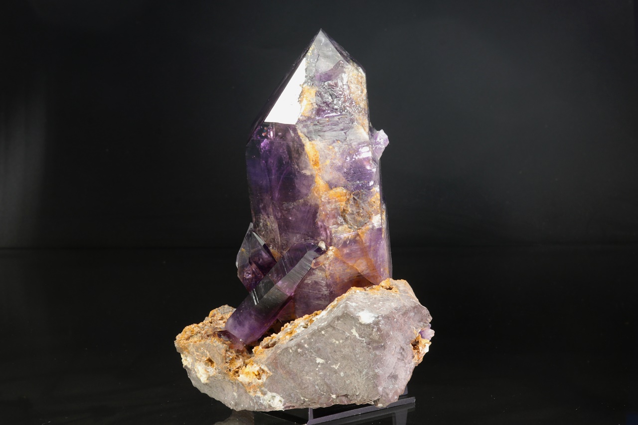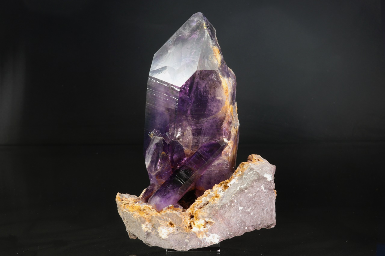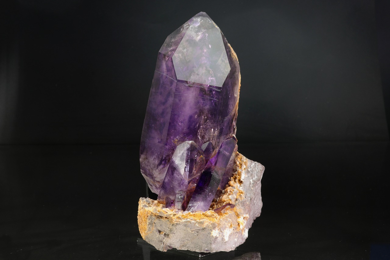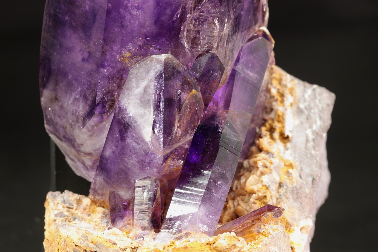Nádherná ukázka sytě fialových krystalů ametystu narostlých do dutiny, kde vyniká 14 cm velký krystal, který je ve směru do dutiny velmi lesklý. Špička největšího krystalu byla původně lehce poškozená a poté profesionálně domodelována.