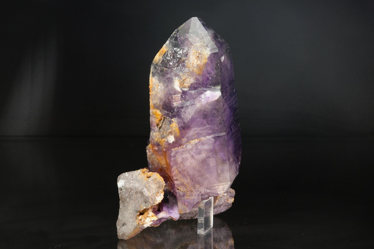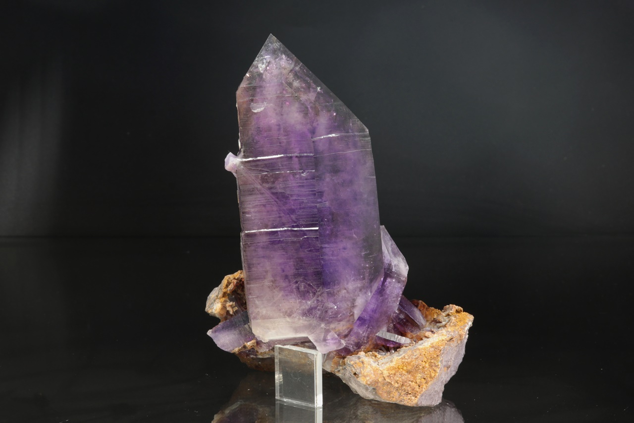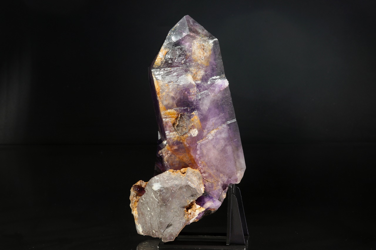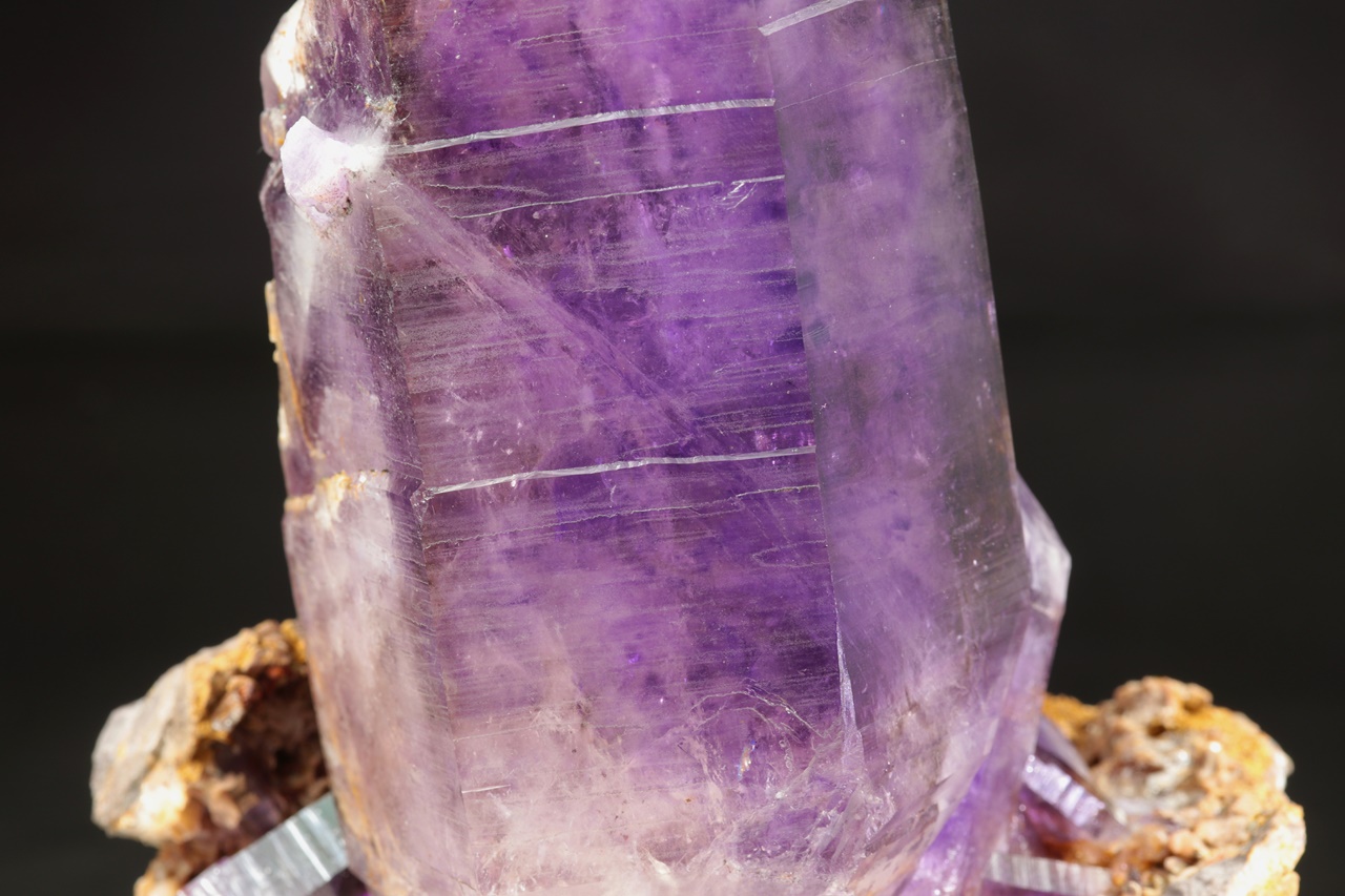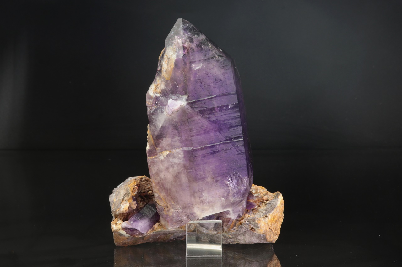 Nádherná ukázka sytě fialových krystalů ametystu narostlých do dutiny, kde vyniká 14 cm velký krystal, který je ve směru do dutiny velmi lesklý. Špička největšího krystalu byla původně lehce poškozená a poté profesionálně domodelována.