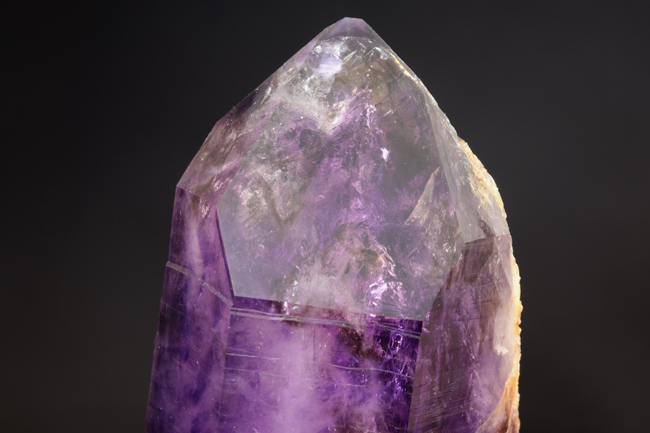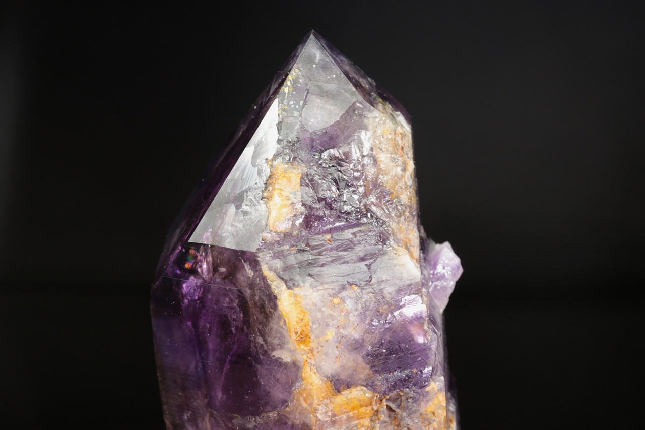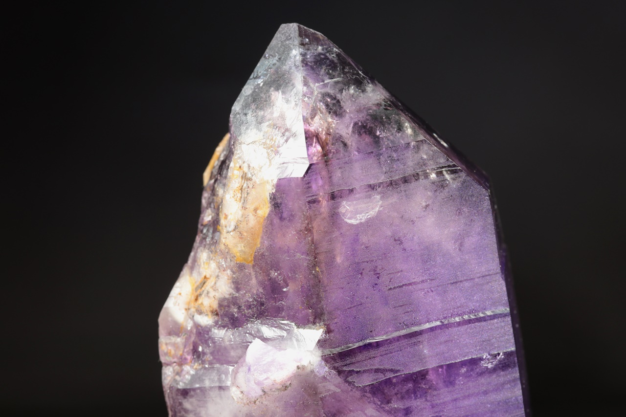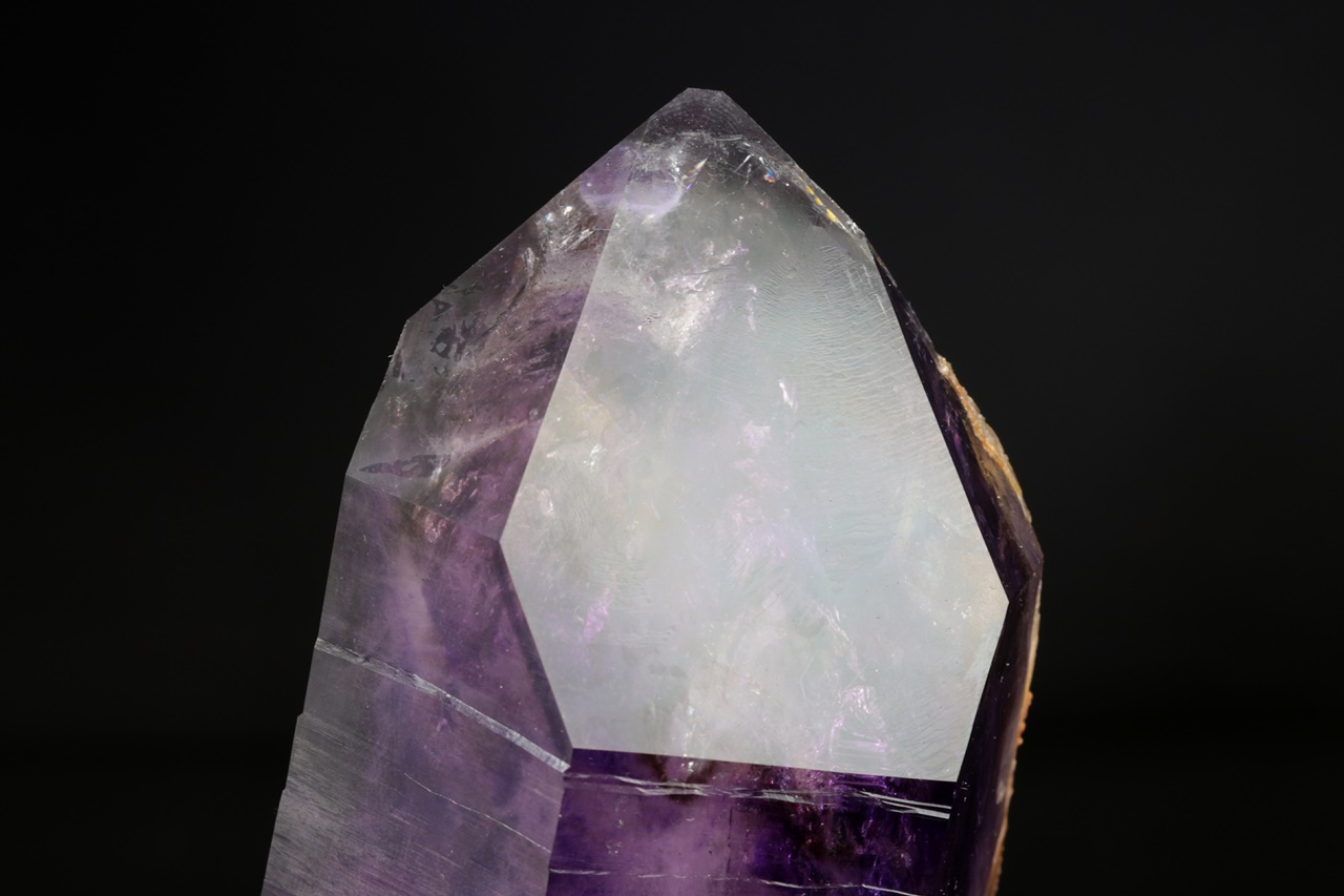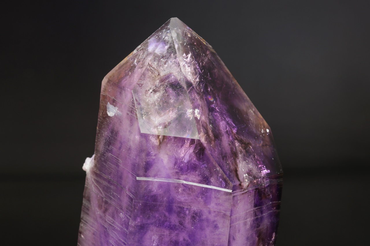 Nádherná ukázka sytě fialových krystalů ametystu narostlých do dutiny, kde vyniká 14 cm velký krystal, který je ve směru do dutiny velmi lesklý. Špička největšího krystalu byla původně lehce poškozená a poté profesionálně domodelována.