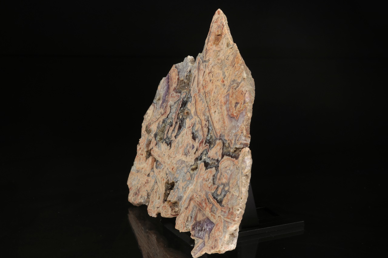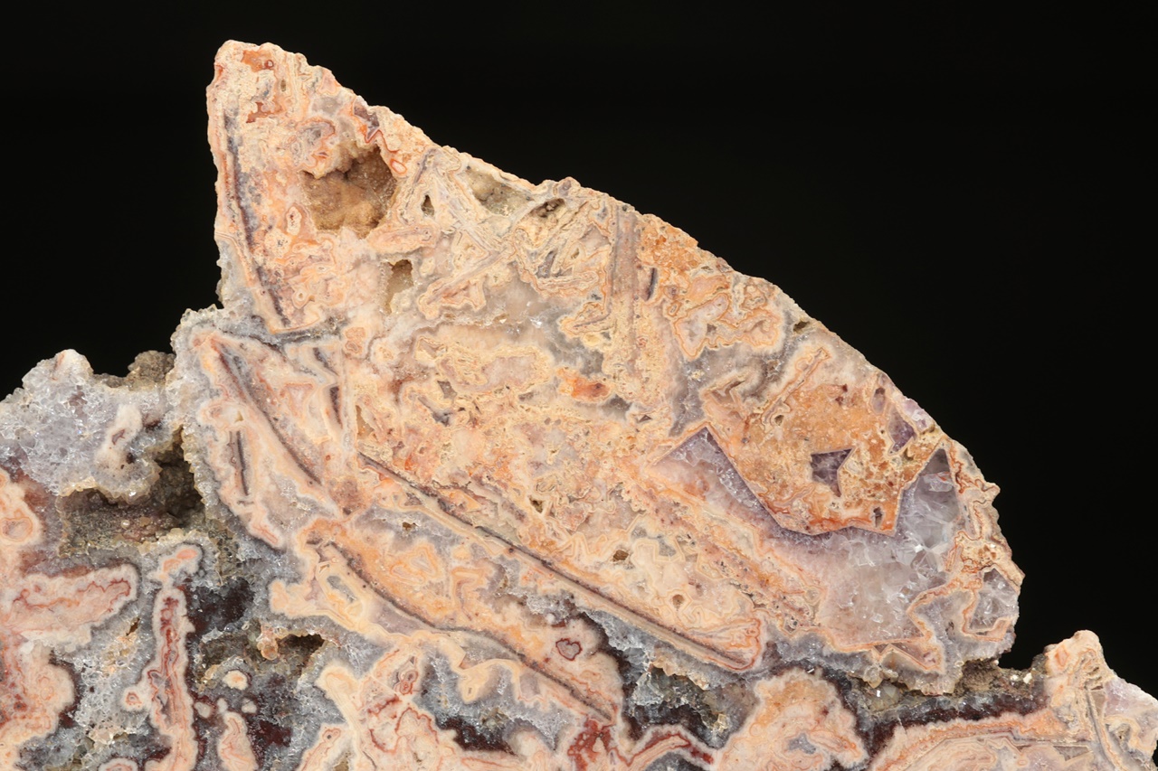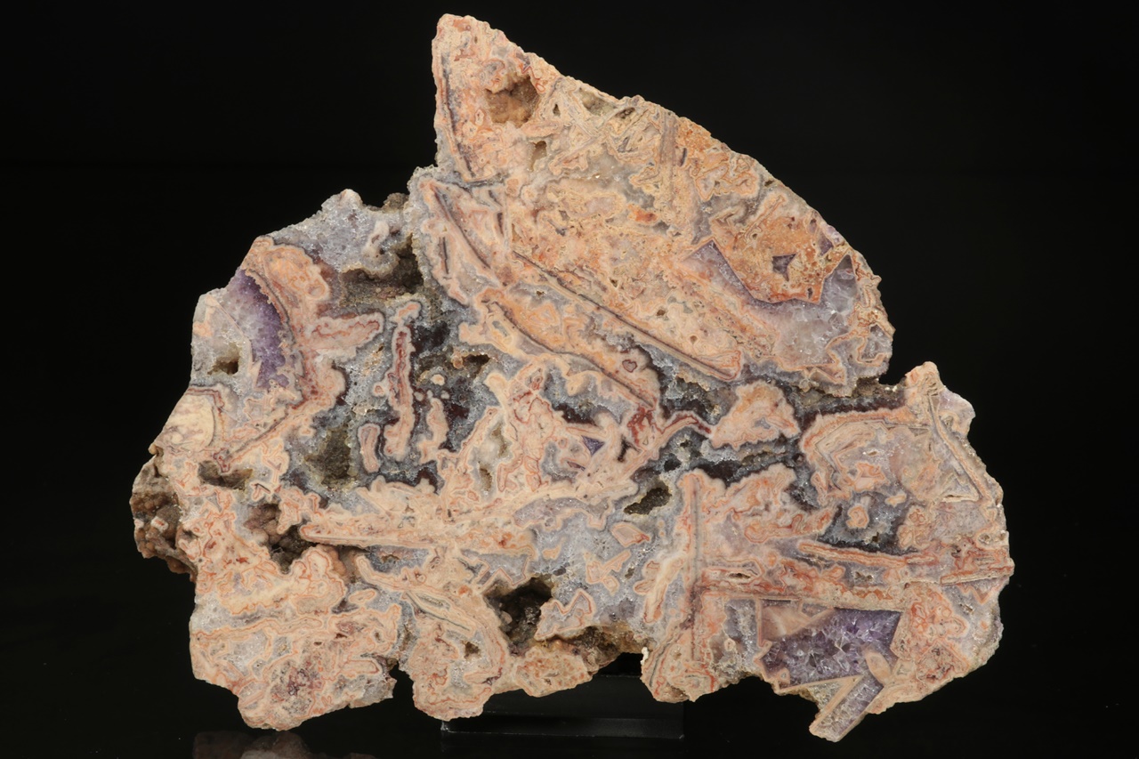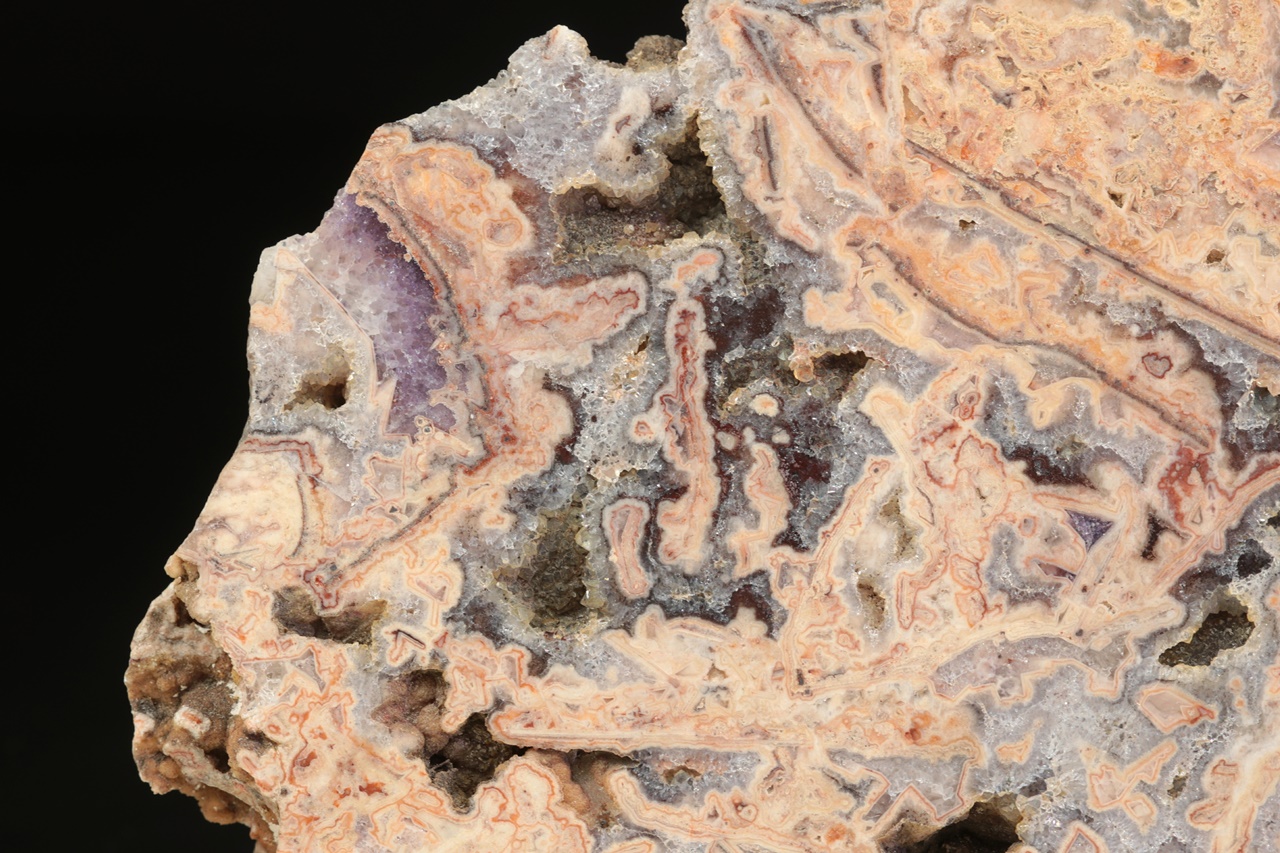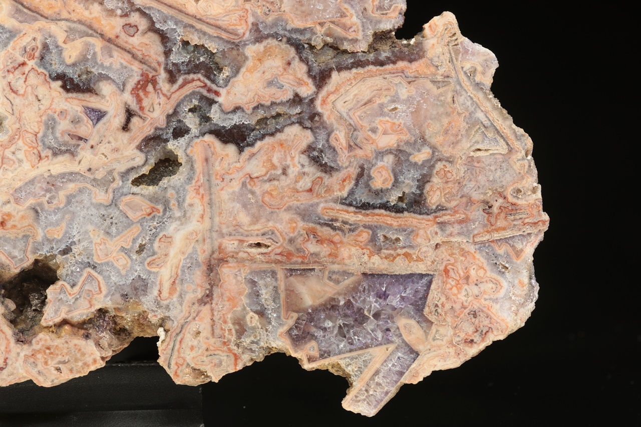 Bílo růžový achát s dutinami vyplněnými drobnými krystaly ametystu.