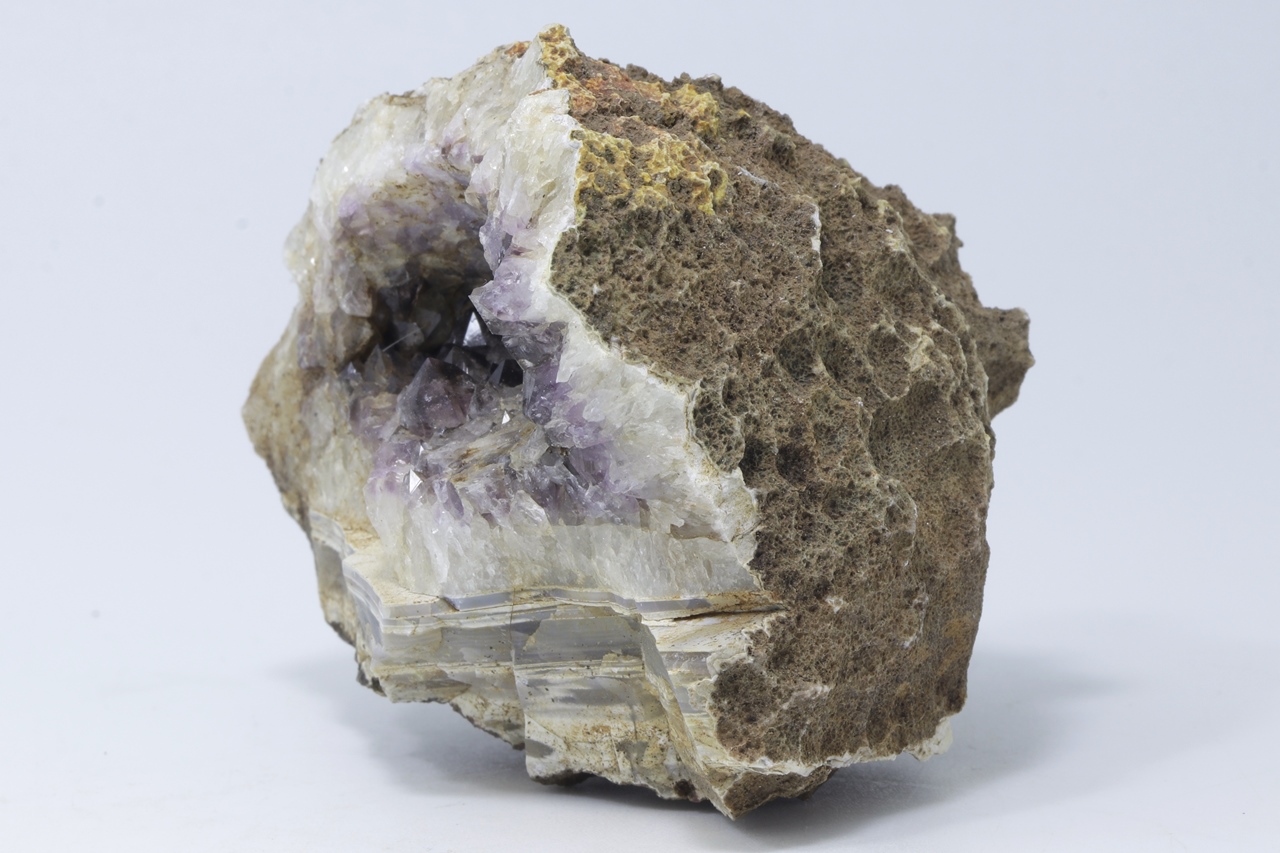 A completely unique banded agate from Rašovka. A four-centimeter cavity of quartz transitioning into amethyst, with the lower part filled with parallel-banded agate.