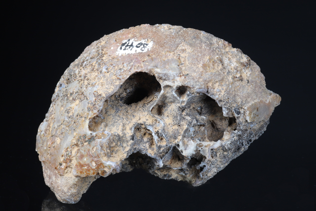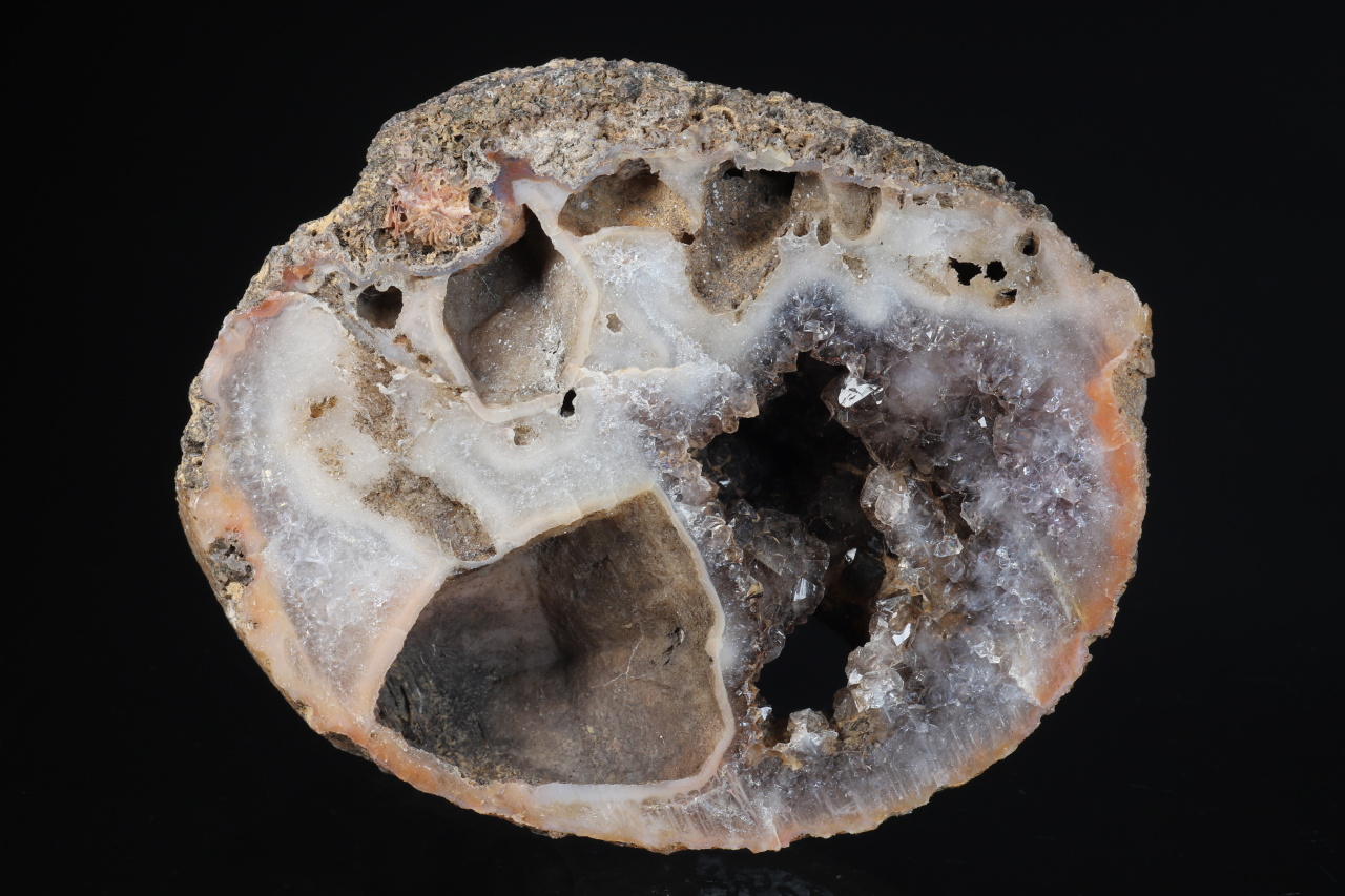 Neobvyklá ukázka křemenné pecky s krystaly ametystu až záhnědy a perimorfózami patrně po krystalech kalcitu. Geneticky zajímavý vzorek leštěné pecky ze slavného naleziště Rašovka.