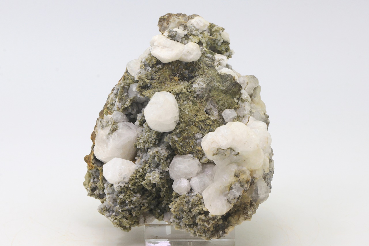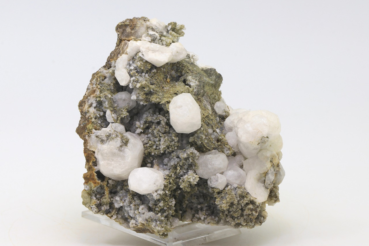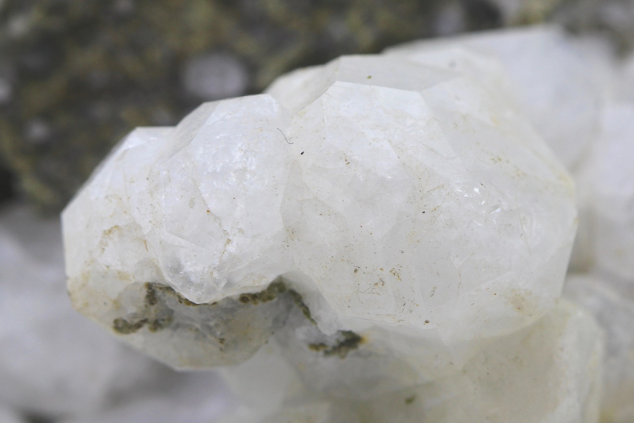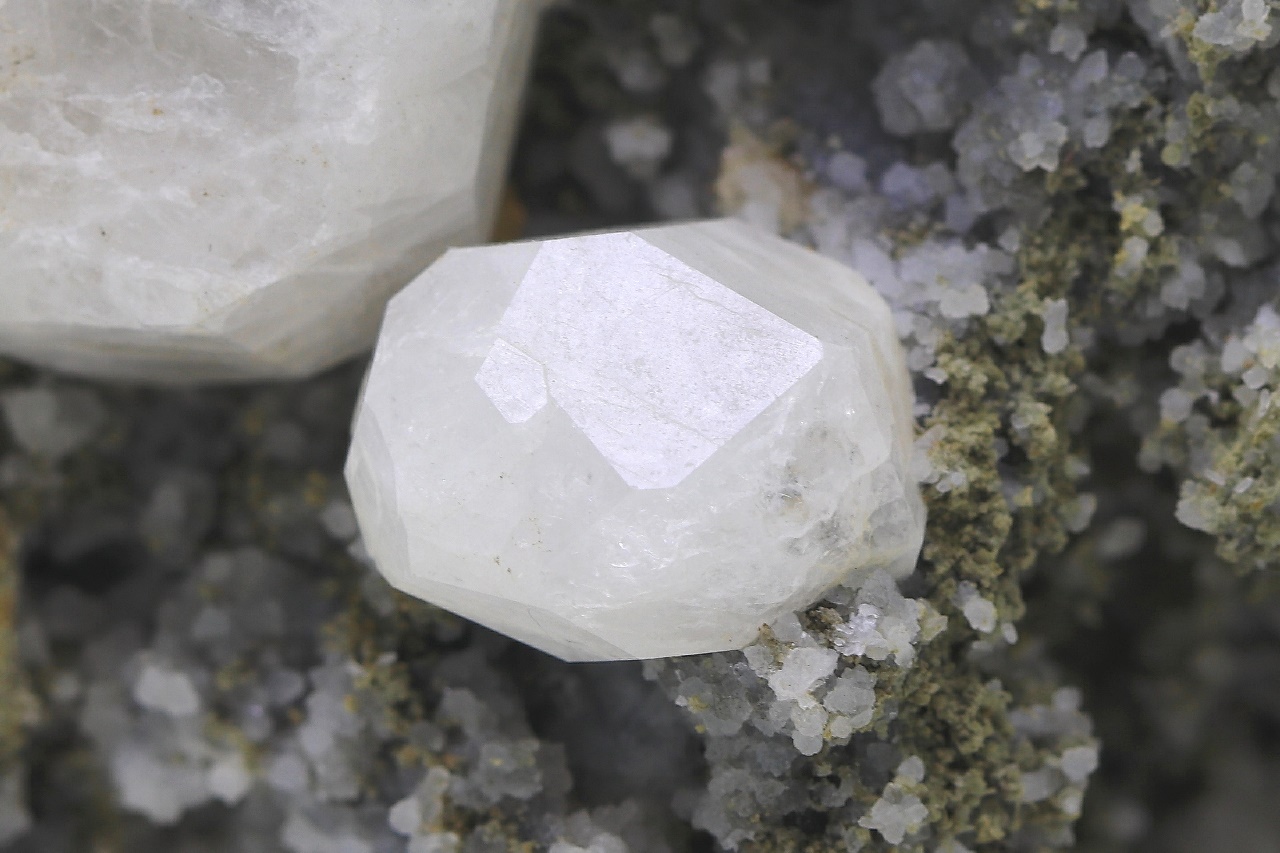 White, unusually large trapezohedral crystals of analcime. The largest crystal is 2 cm in size.