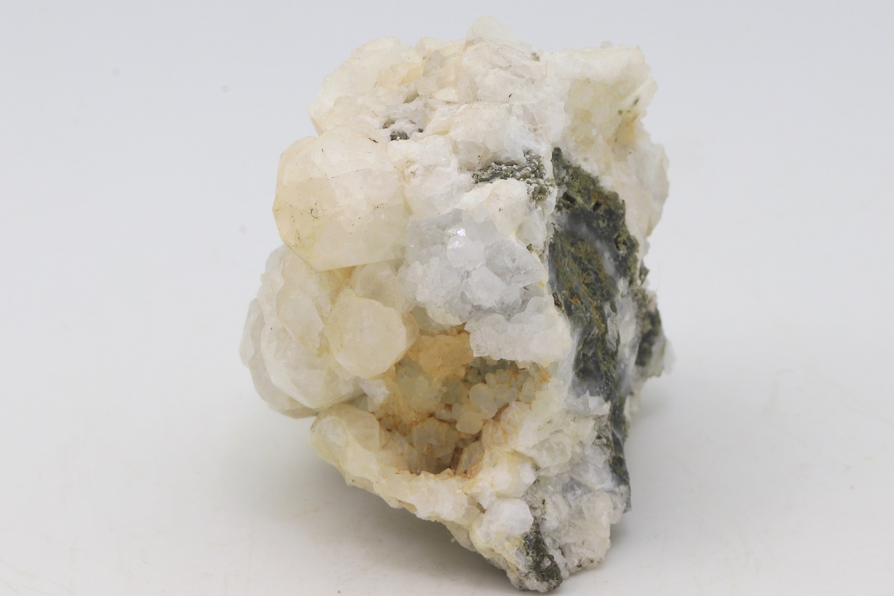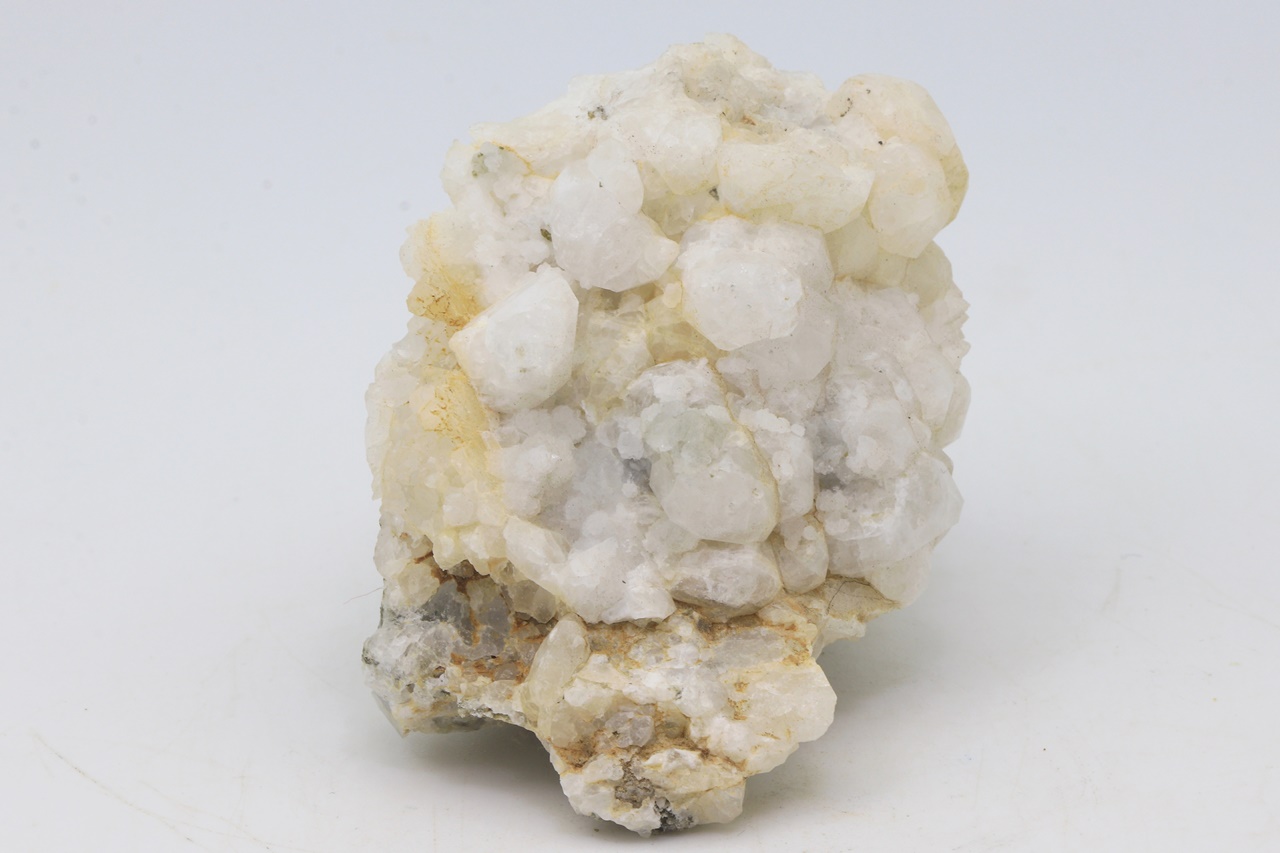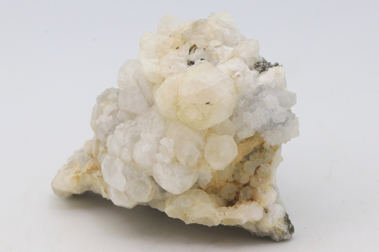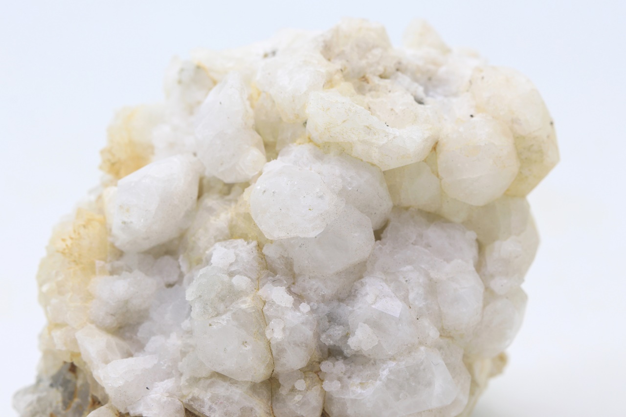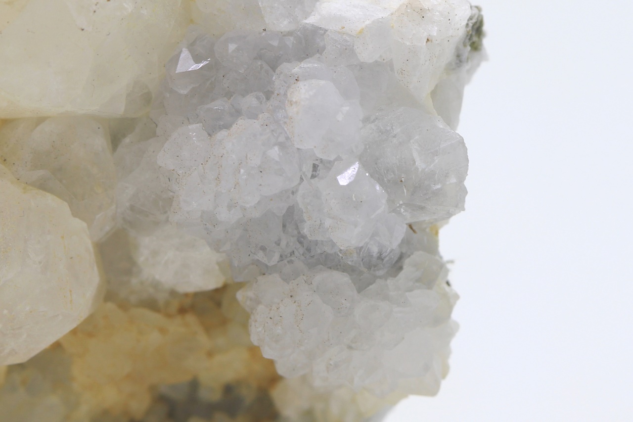 Rich druse of white, shiny, trapezohedral crystals of analcime with a druse of quartz grown from the side of the sample. The largest crystal of analcime is 1.3 cm big.