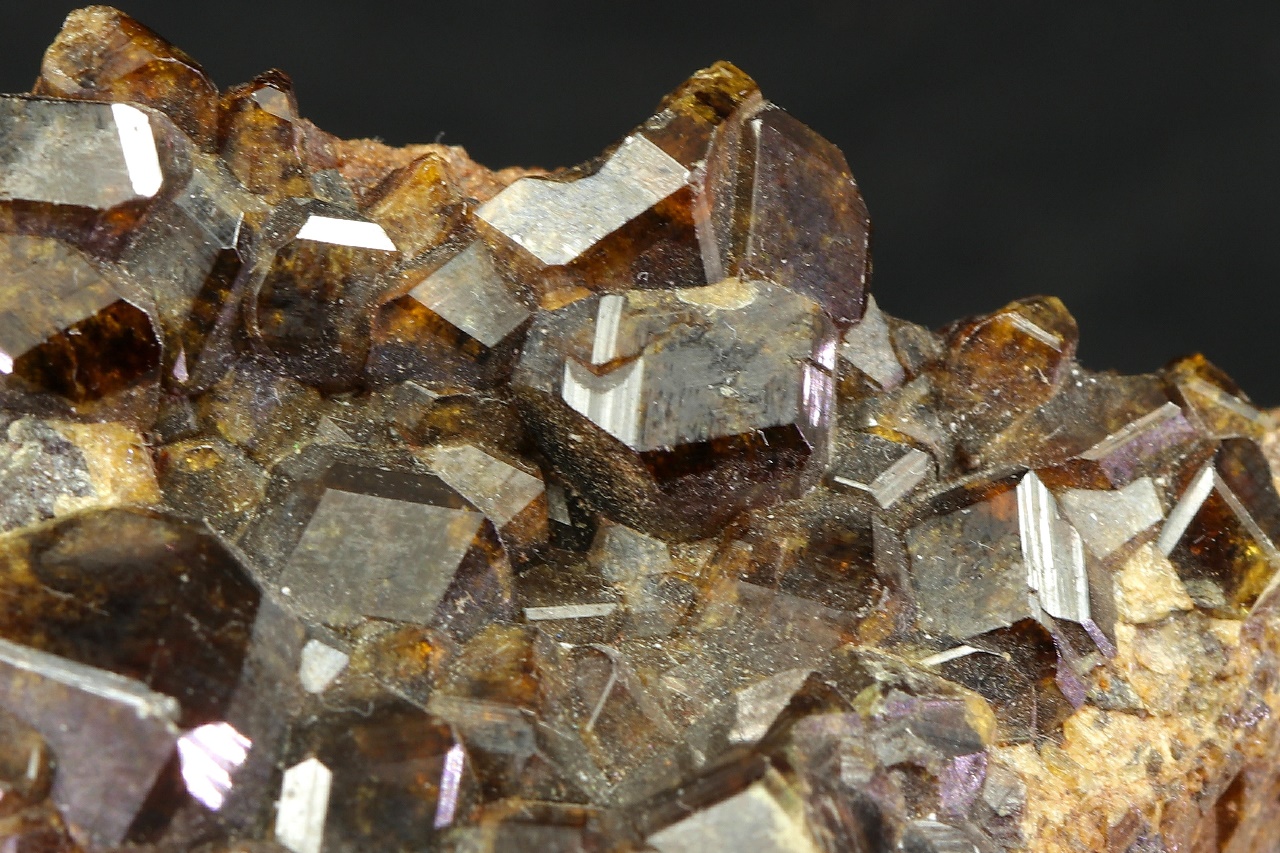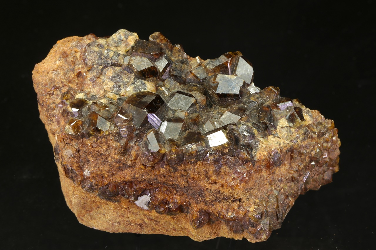Druze of very shiny, dark brown crystals of andradite. The largest crystal is 1 cm in size.