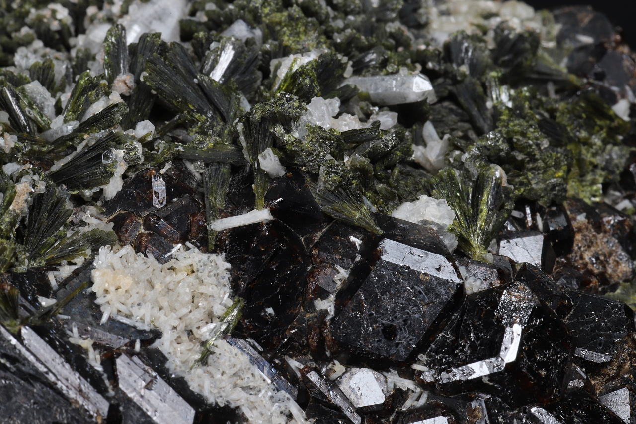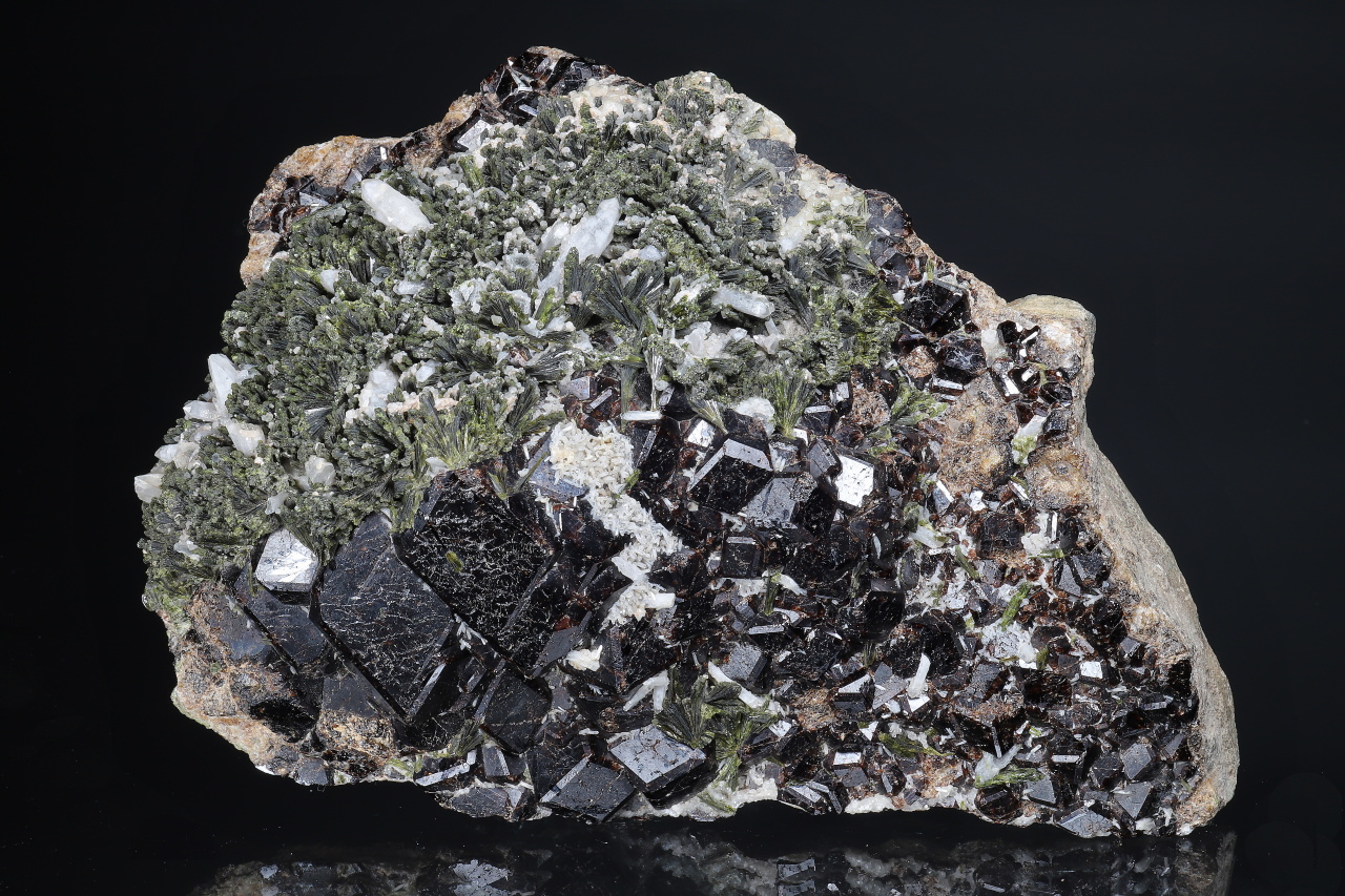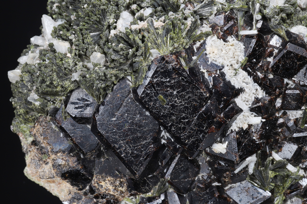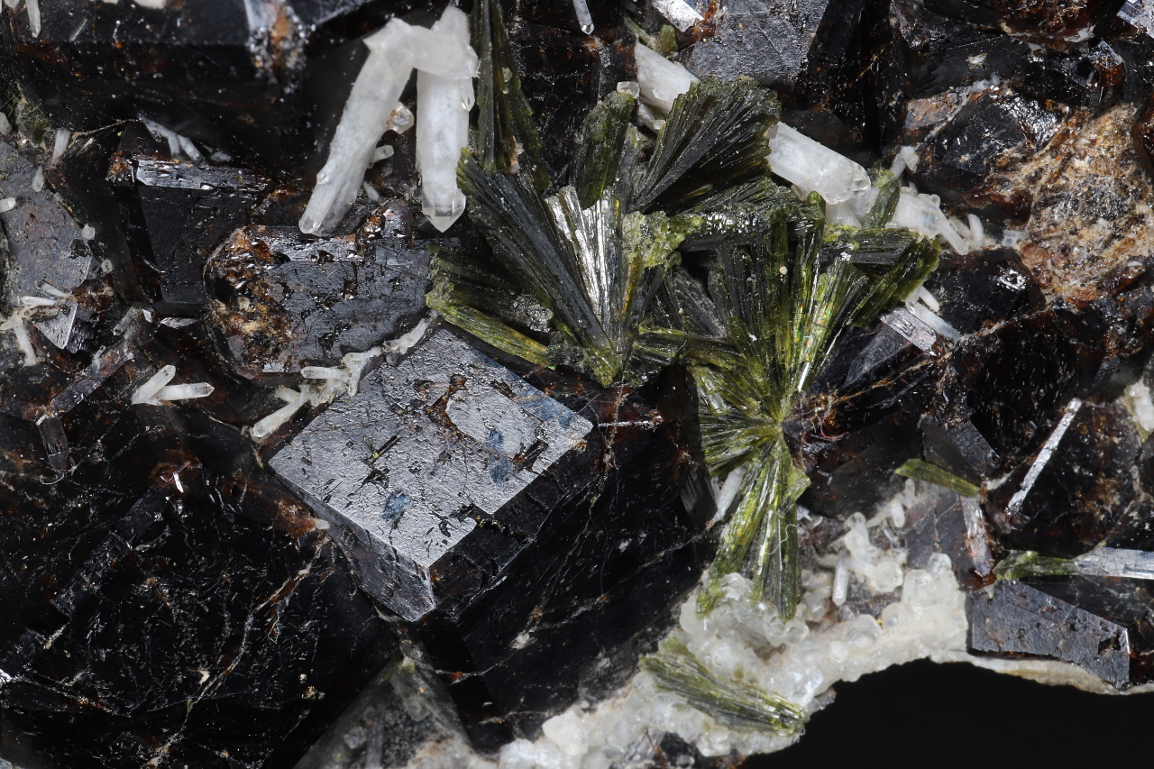 A very aesthetic specimen featuring perfectly terminated dark brown andradite crystals up to 33 mm in size, with growing green epidote crystals and white quartz crystals.