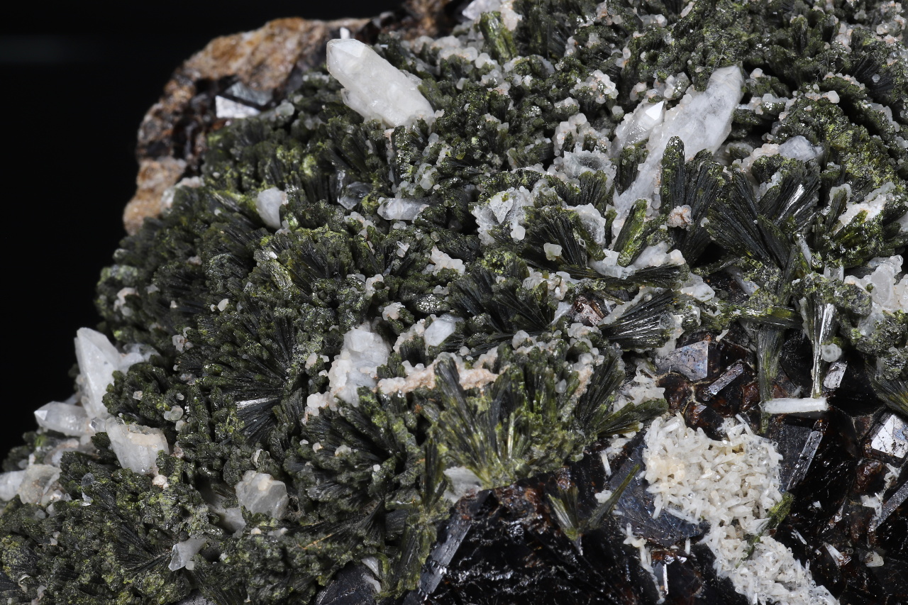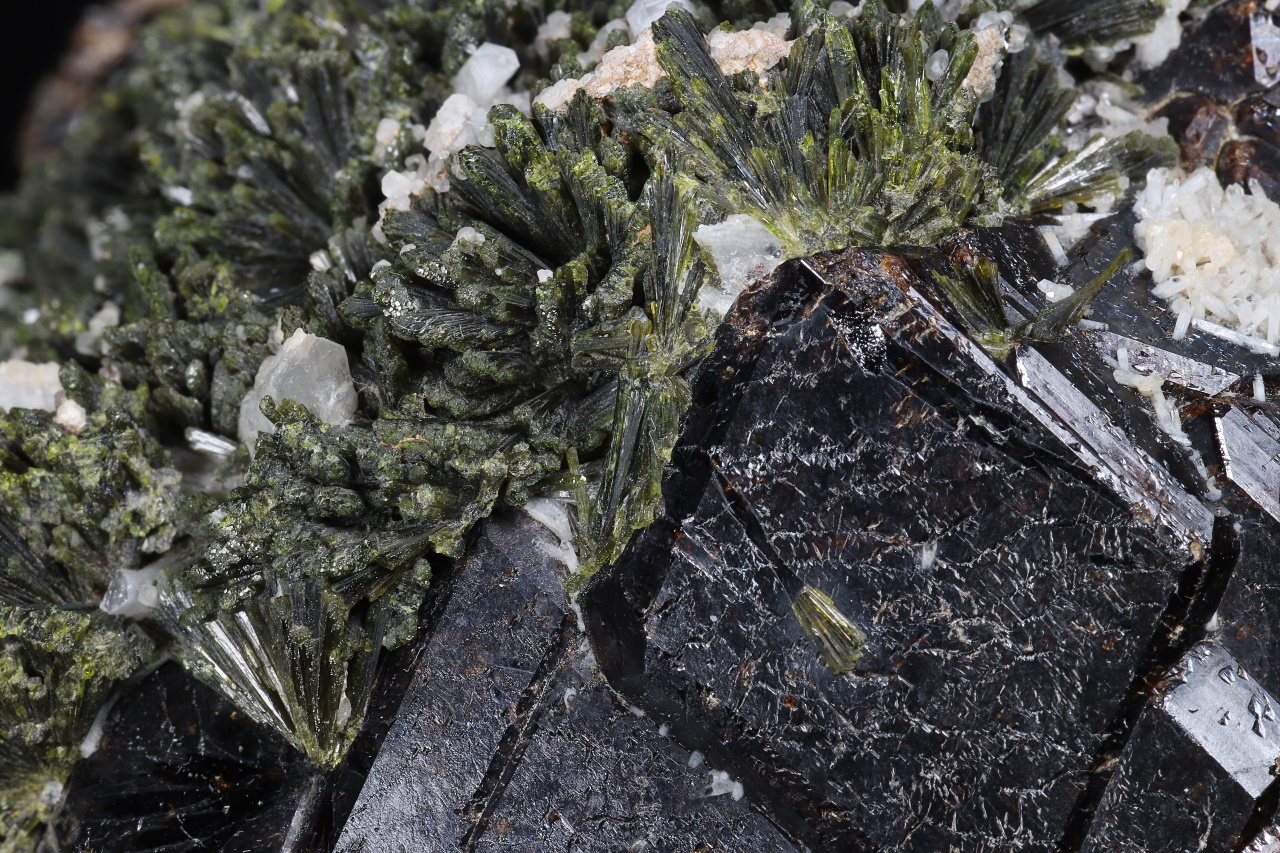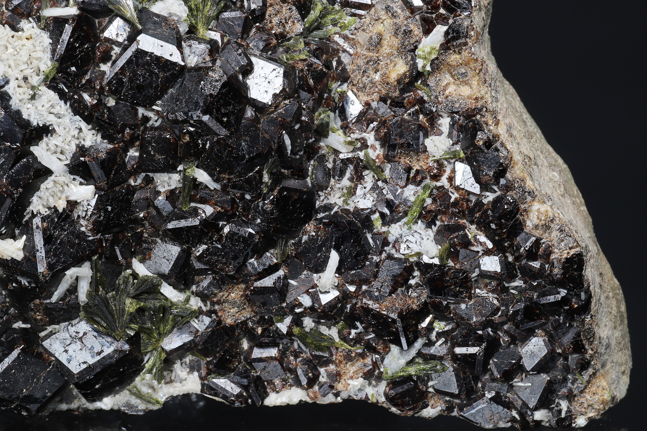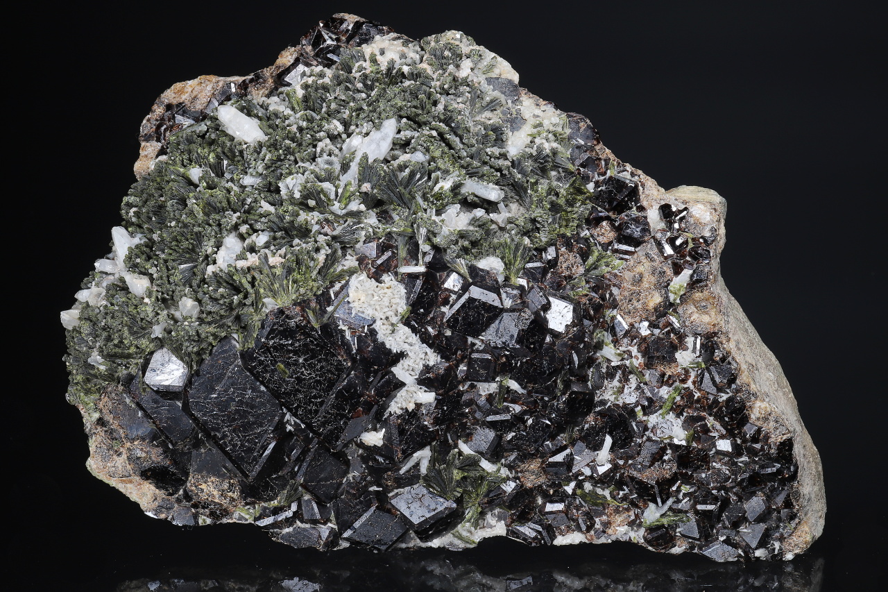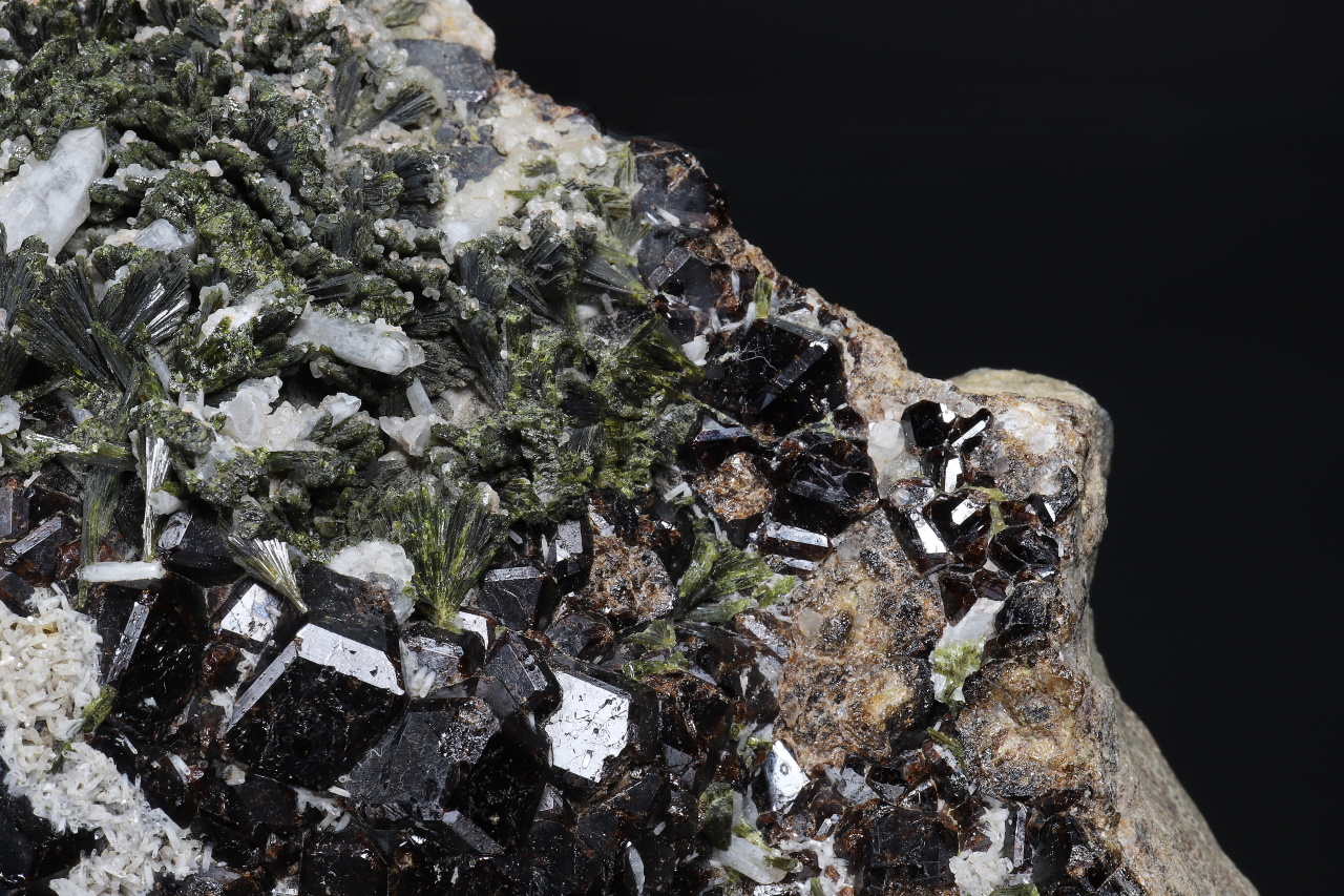 A very aesthetic specimen featuring perfectly terminated dark brown andradite crystals up to 33 mm in size, with growing green epidote crystals and white quartz crystals.