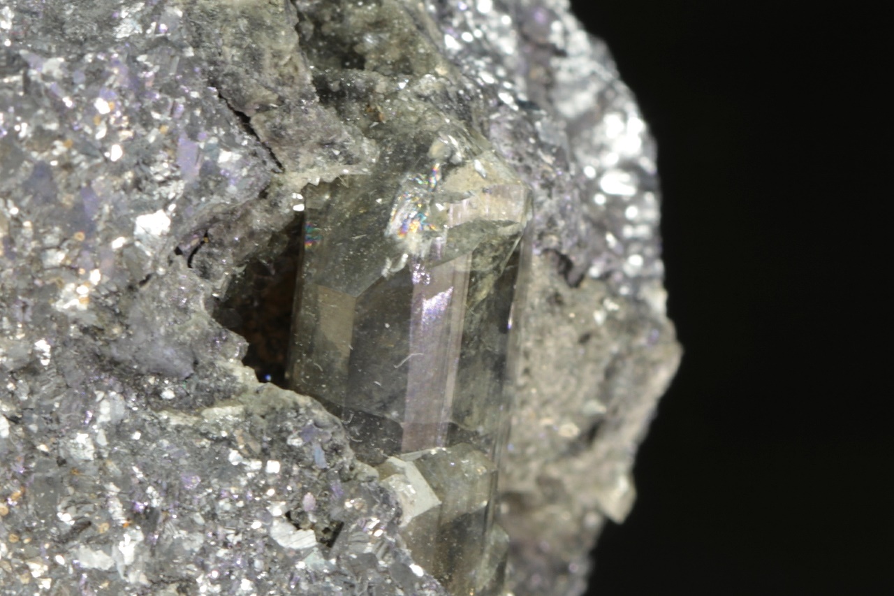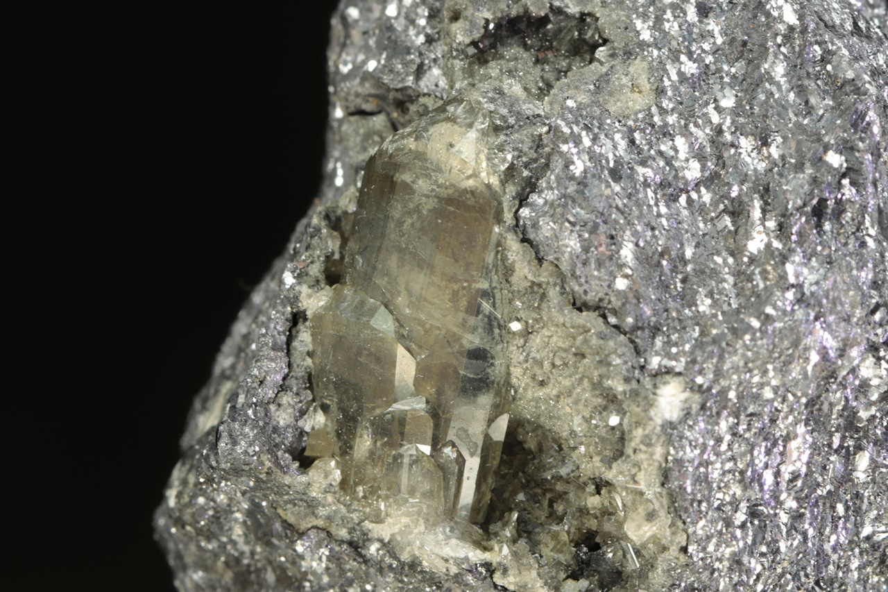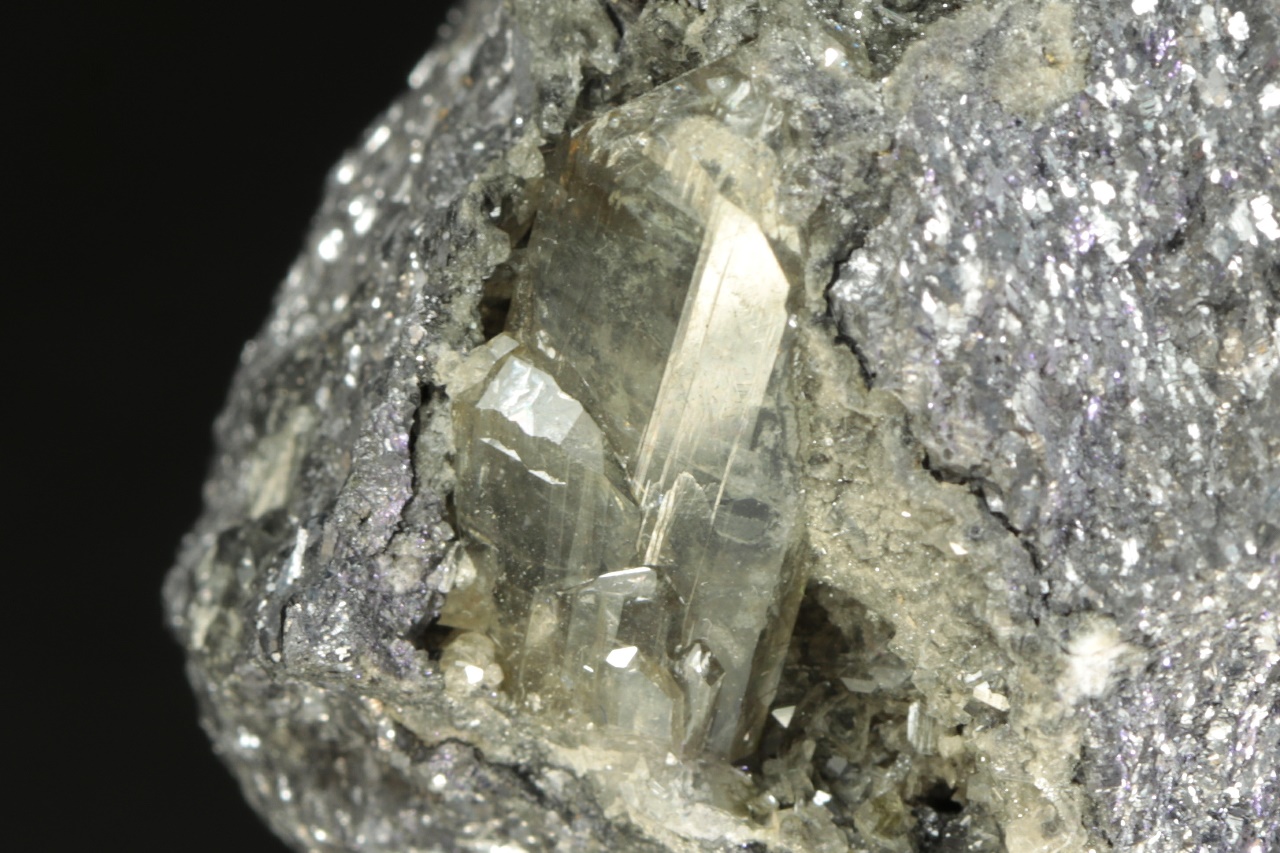 Two centimeters long, a shiny crystal of translucent anglesite grown in the cavity of massive galenite.