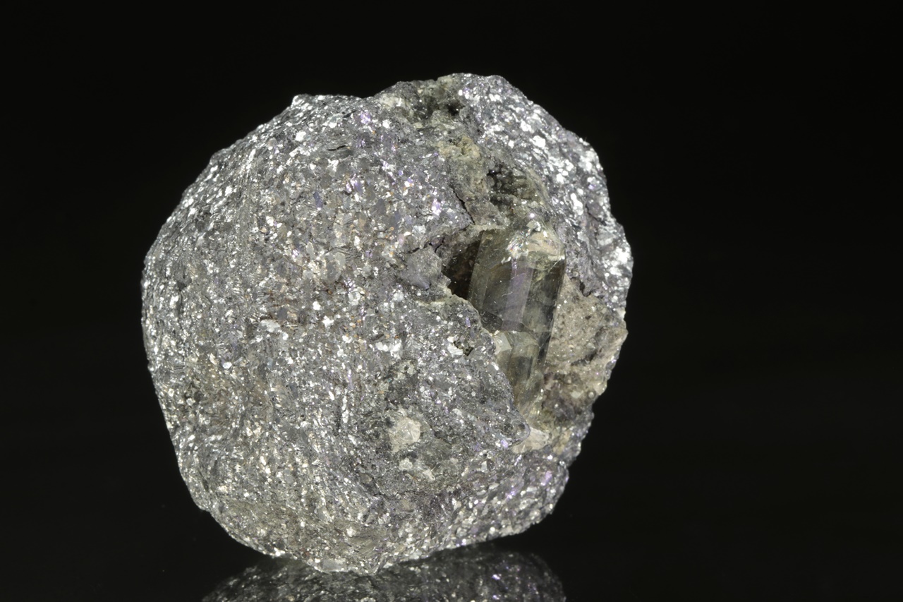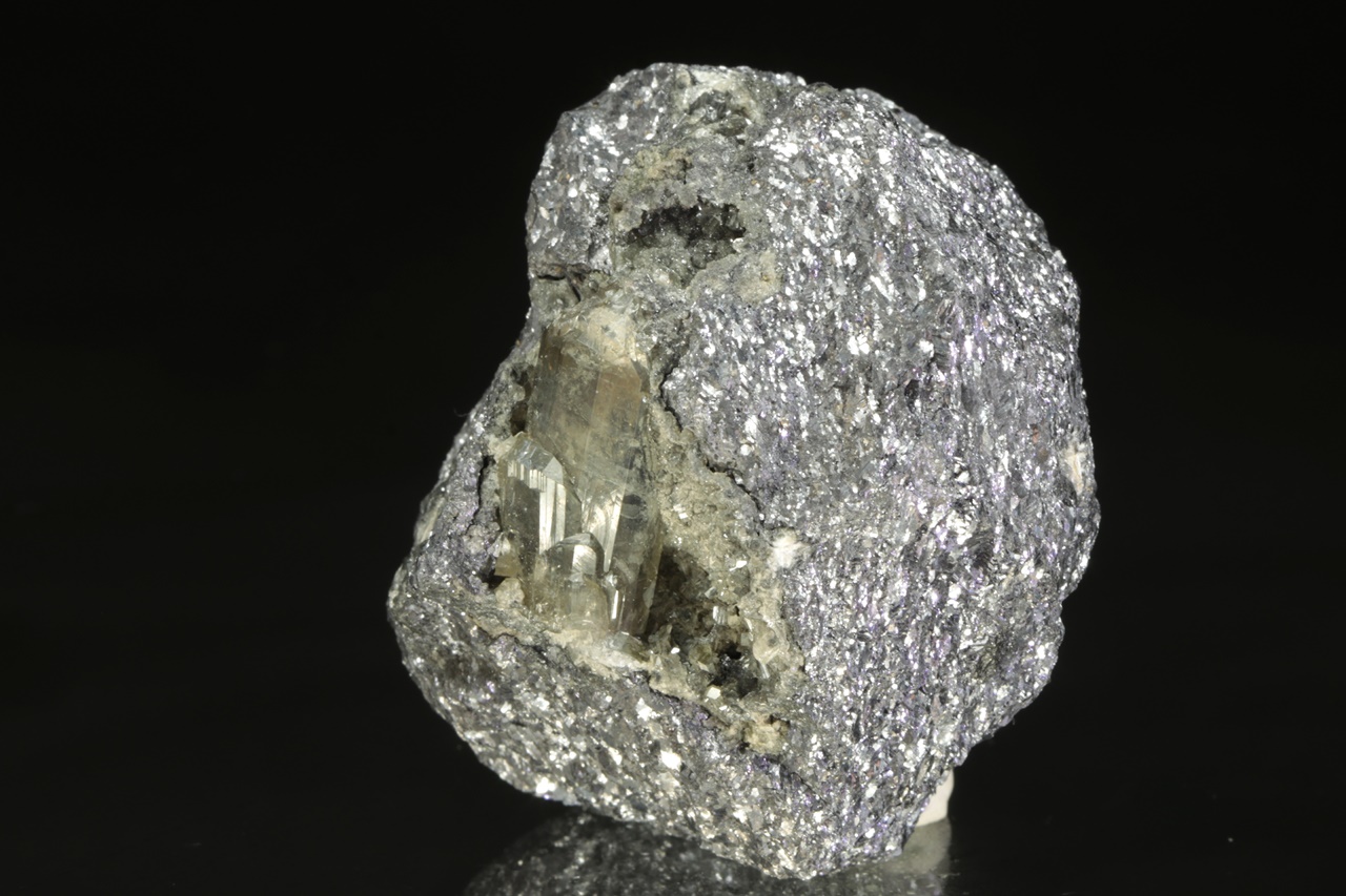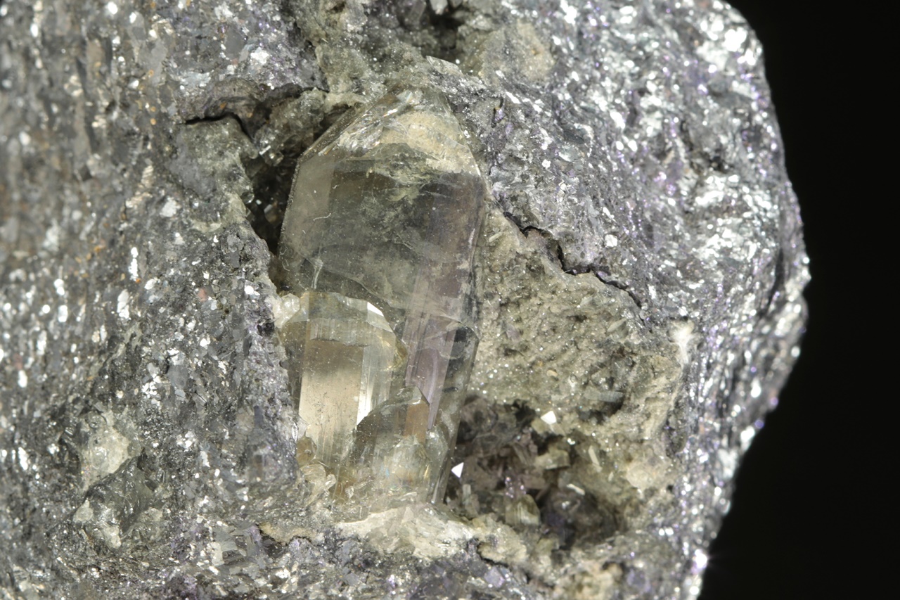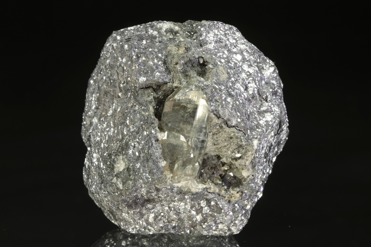 Two centimeters long, a shiny crystal of translucent anglesite grown in the cavity of massive galenite.