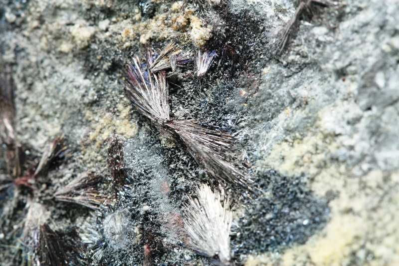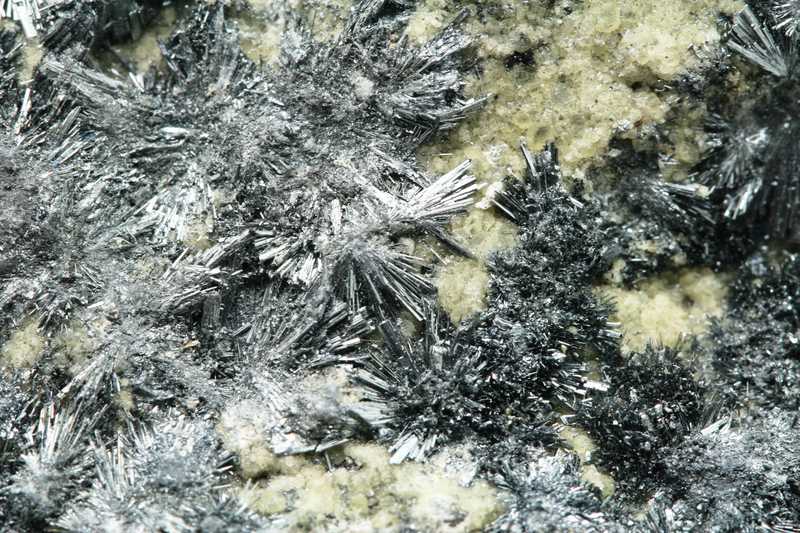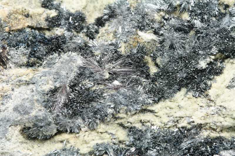 A beautiful specimen of stibnite and kermesite from the locality Pezinok, Slovakia A specimen of metallic shiny ray-shaped crystals of antimonite and kermesite up to 11 mm long. The specimen is intact, massive and very well preserved.
