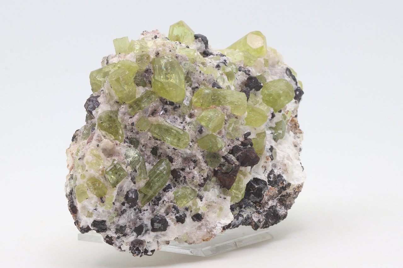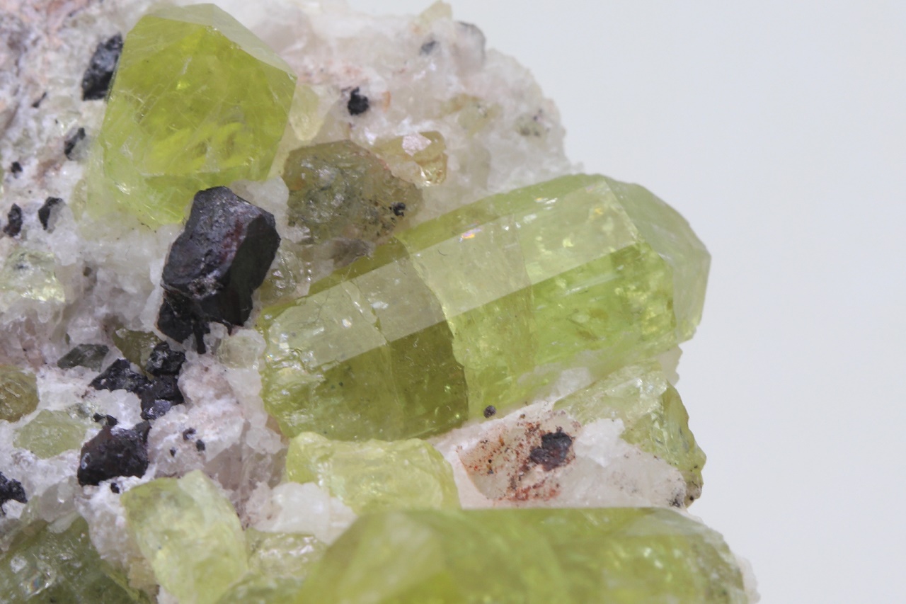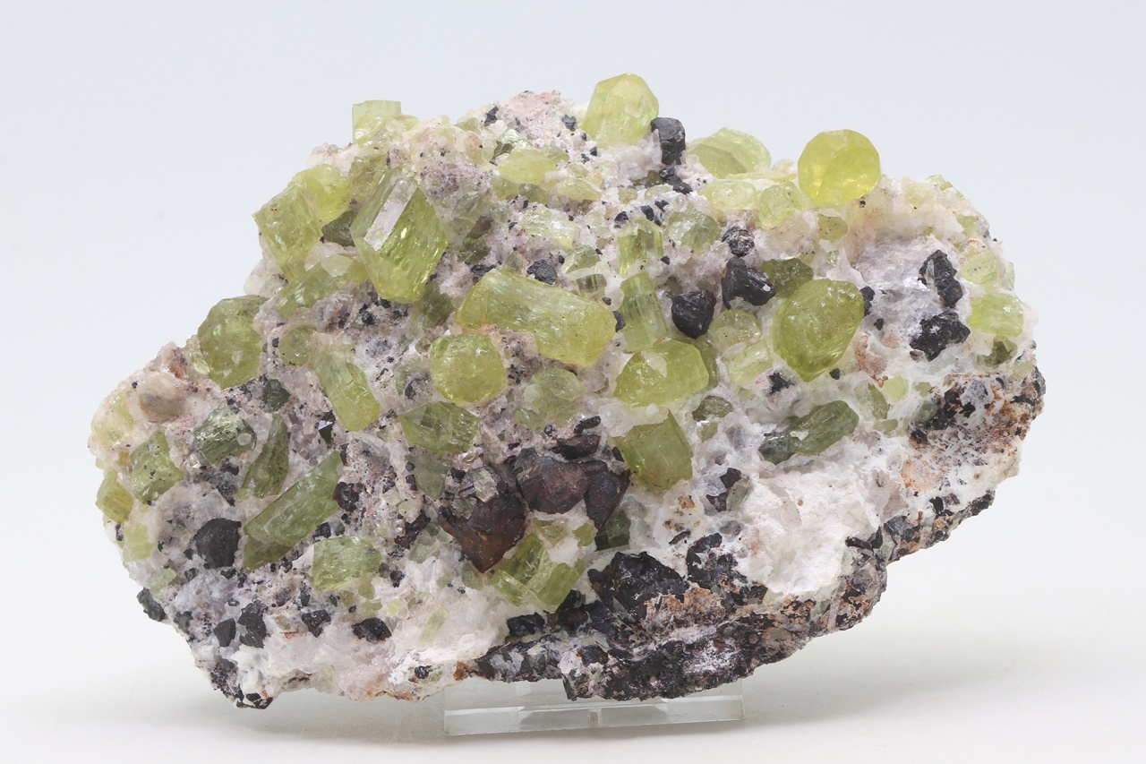 A rich sample of intensely yellow, clear, well-defined apatite crystals with martite (pseudomorph of hematite after magnetite). The largest crystal is 2.5 cm in size.
