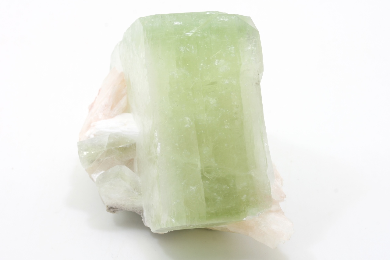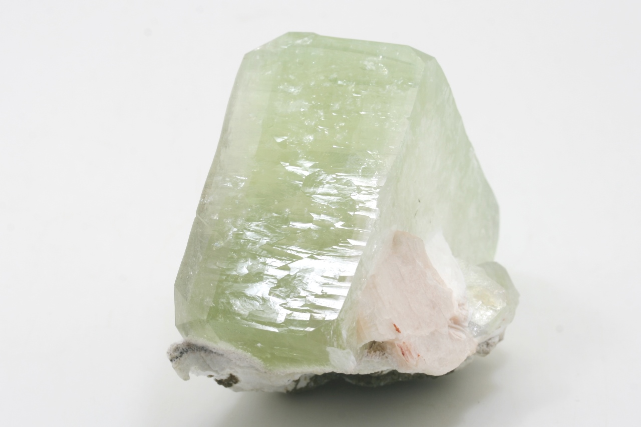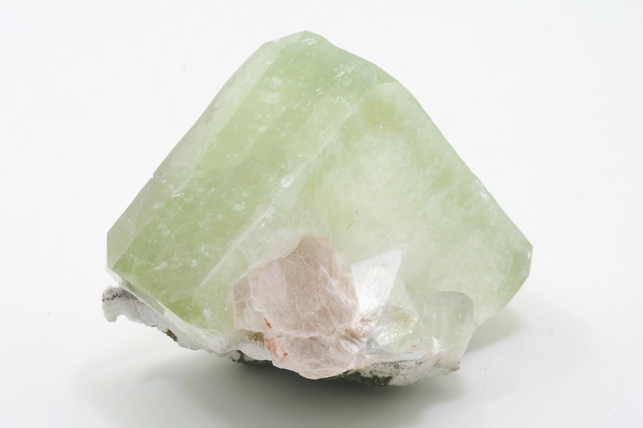 A beautiful large crystal of green apophyllite grown on pinkish stilbite. The edge of the crystal is 58 mm long.