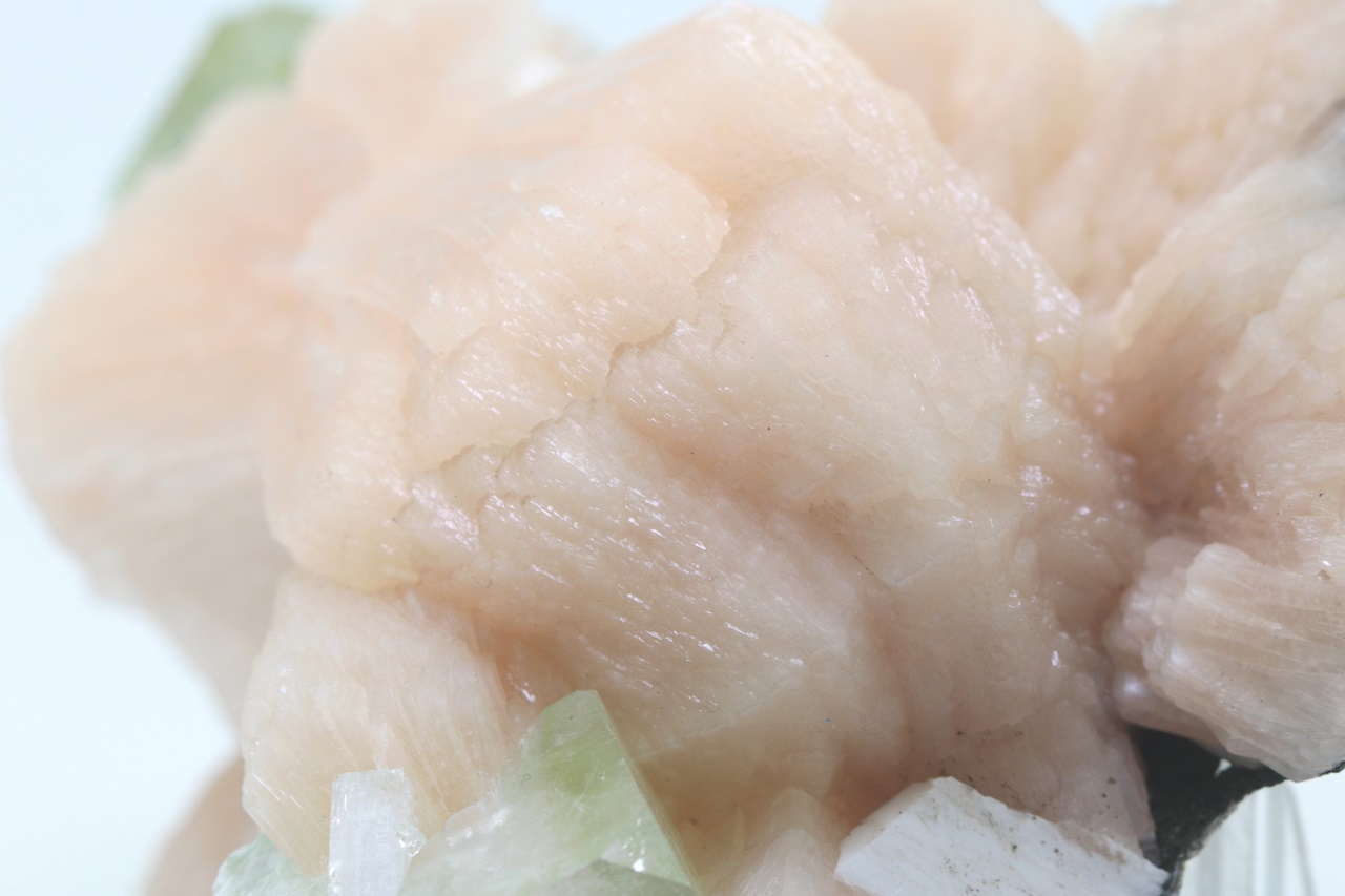 Aesthetic sample of light orange Stilbite growing on a basalt base forming a double-sided “fan” (9 cm long) with green apophyllite pseudo-cubes and white Laumontite.
