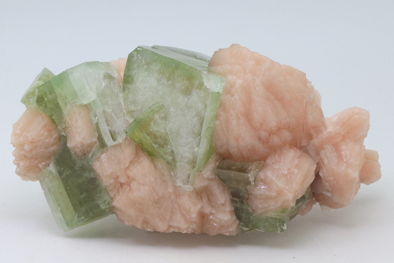 Large (up to 6 cm), highly lustrous crystals of light green apophyllite growing through with light orange stilbite forming characteristic fan-shaped structures. An undamaged specimen of museum quality.