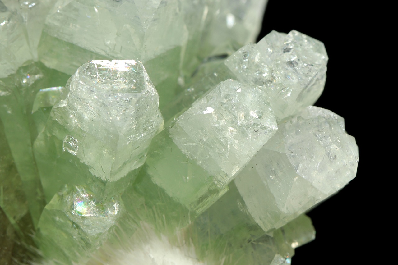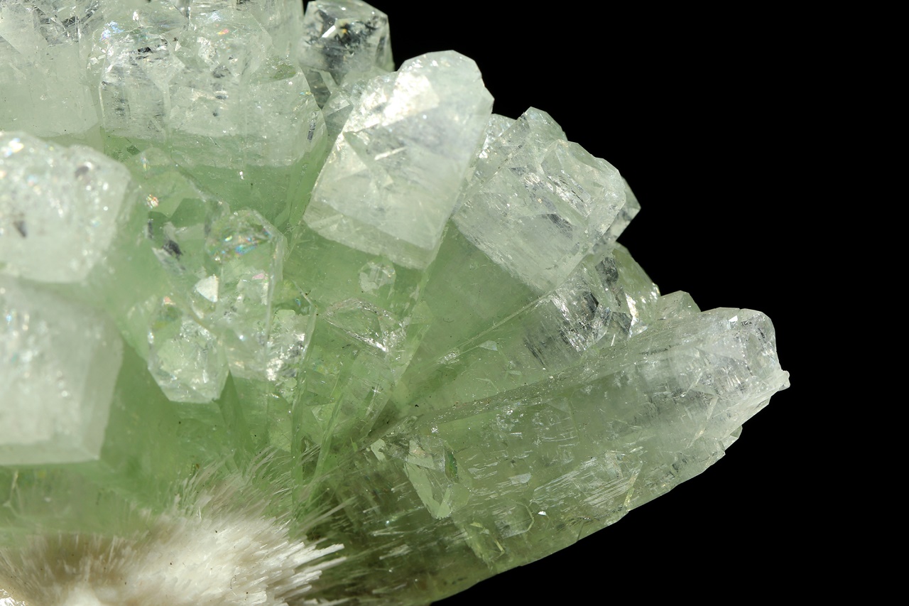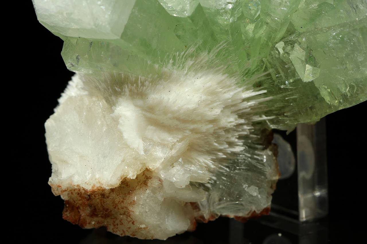 An interesting specimen from a well-known Indian locality. The sample consists of saturated green apophylite, needle-like mesolite crystals, and whitish stilbite. The specimen is very aesthetic and stands on a base without a stand. The columnar crystals of apophylite are perfectly terminated and very shiny.