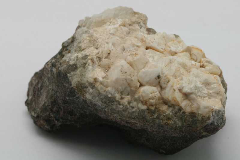 White crystals and grains of apophyllite. The largest crystal is 1 cm.