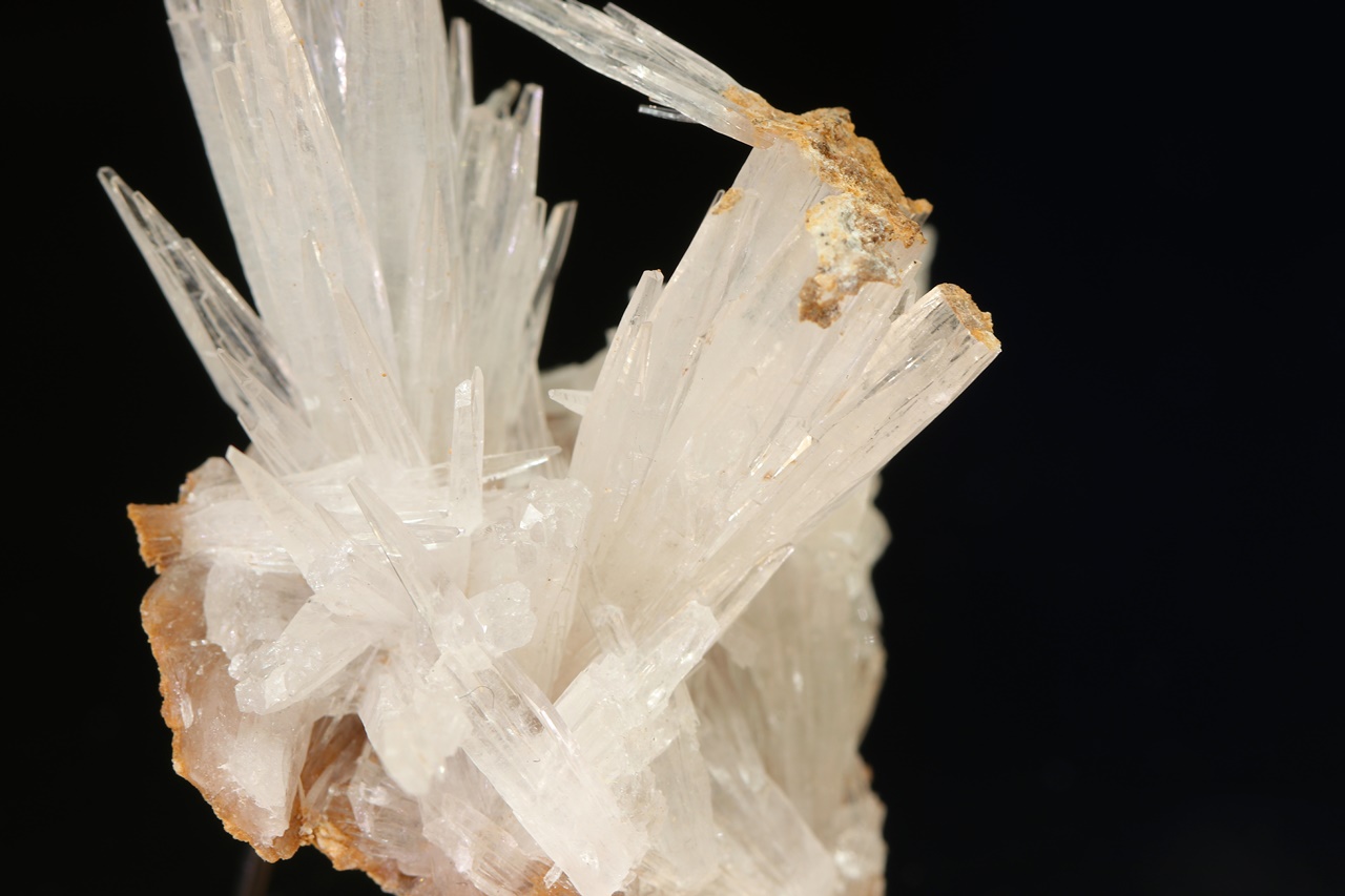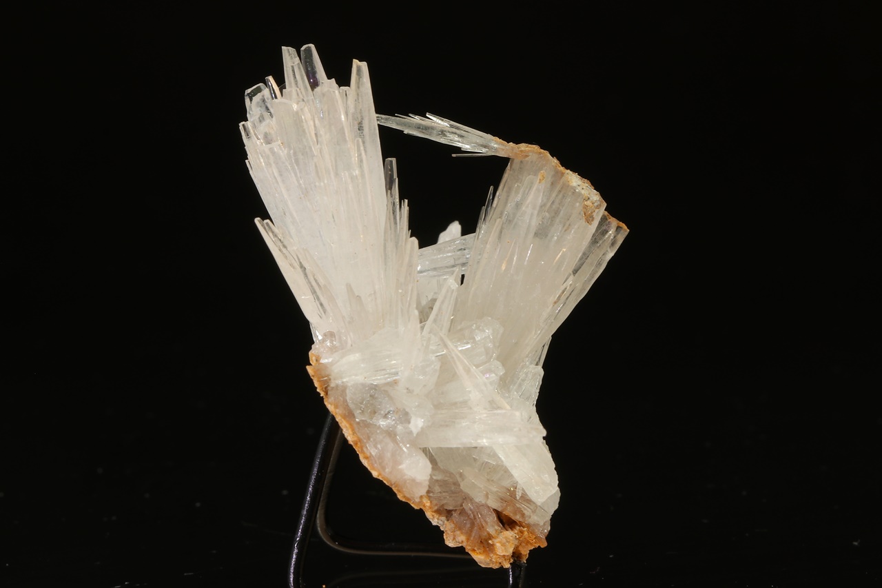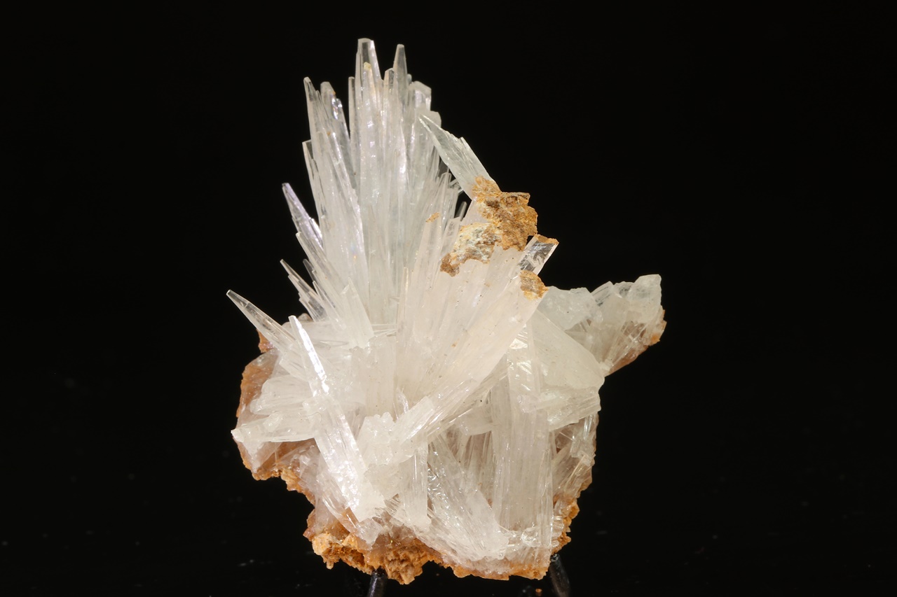 A small sample of several clusters of elongated clear aragonite crystals. The largest crystals are 2.5 cm in size.
