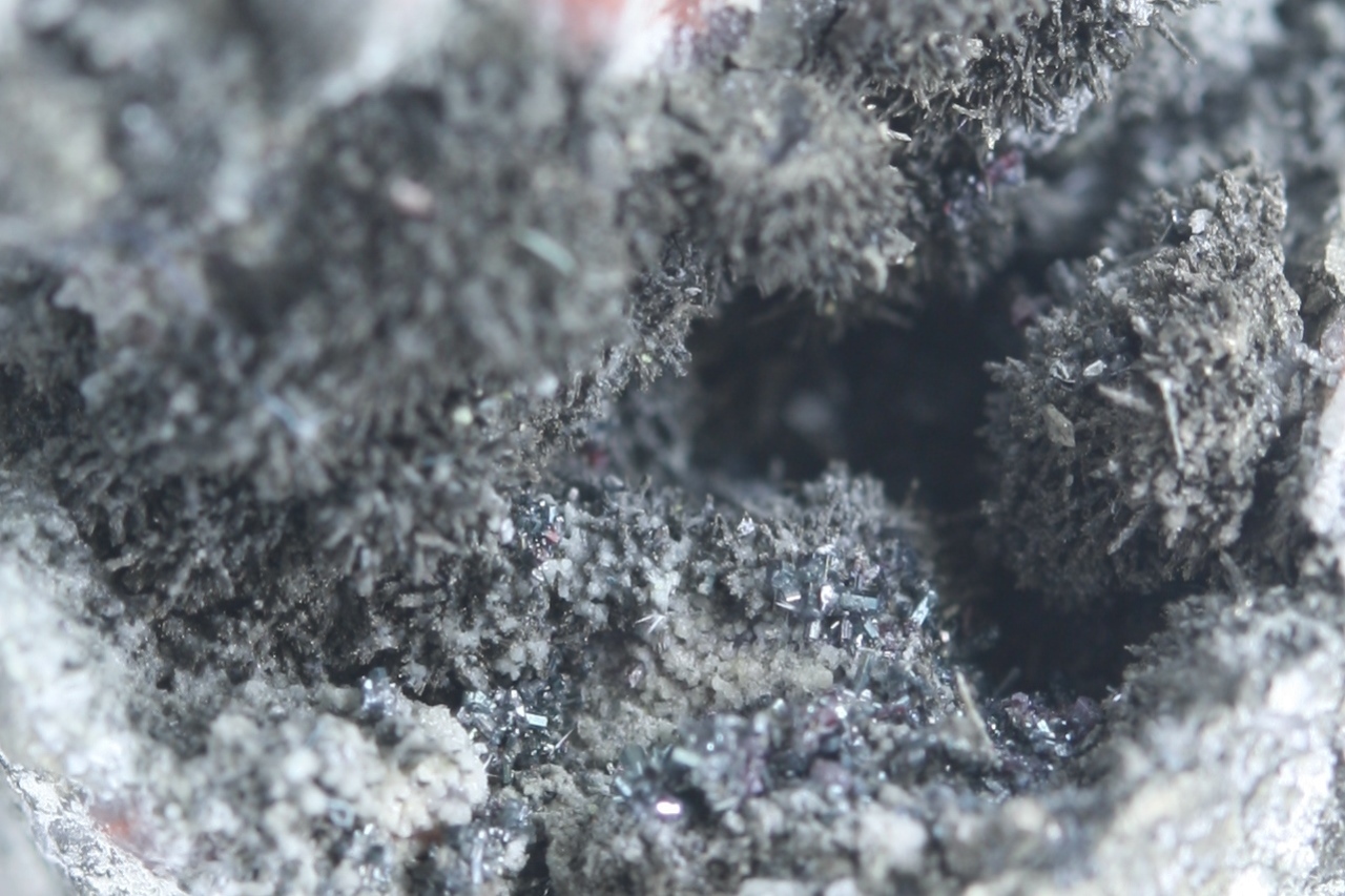A cavity filled with lustrous columnar crystals of Argentopyrit and red crystals of Proustit.【4:1†cz_to_en.json】