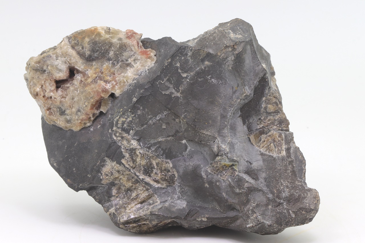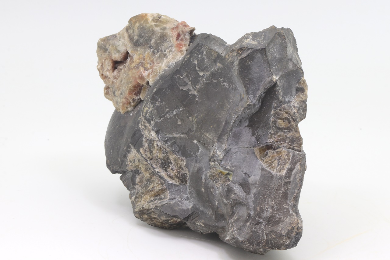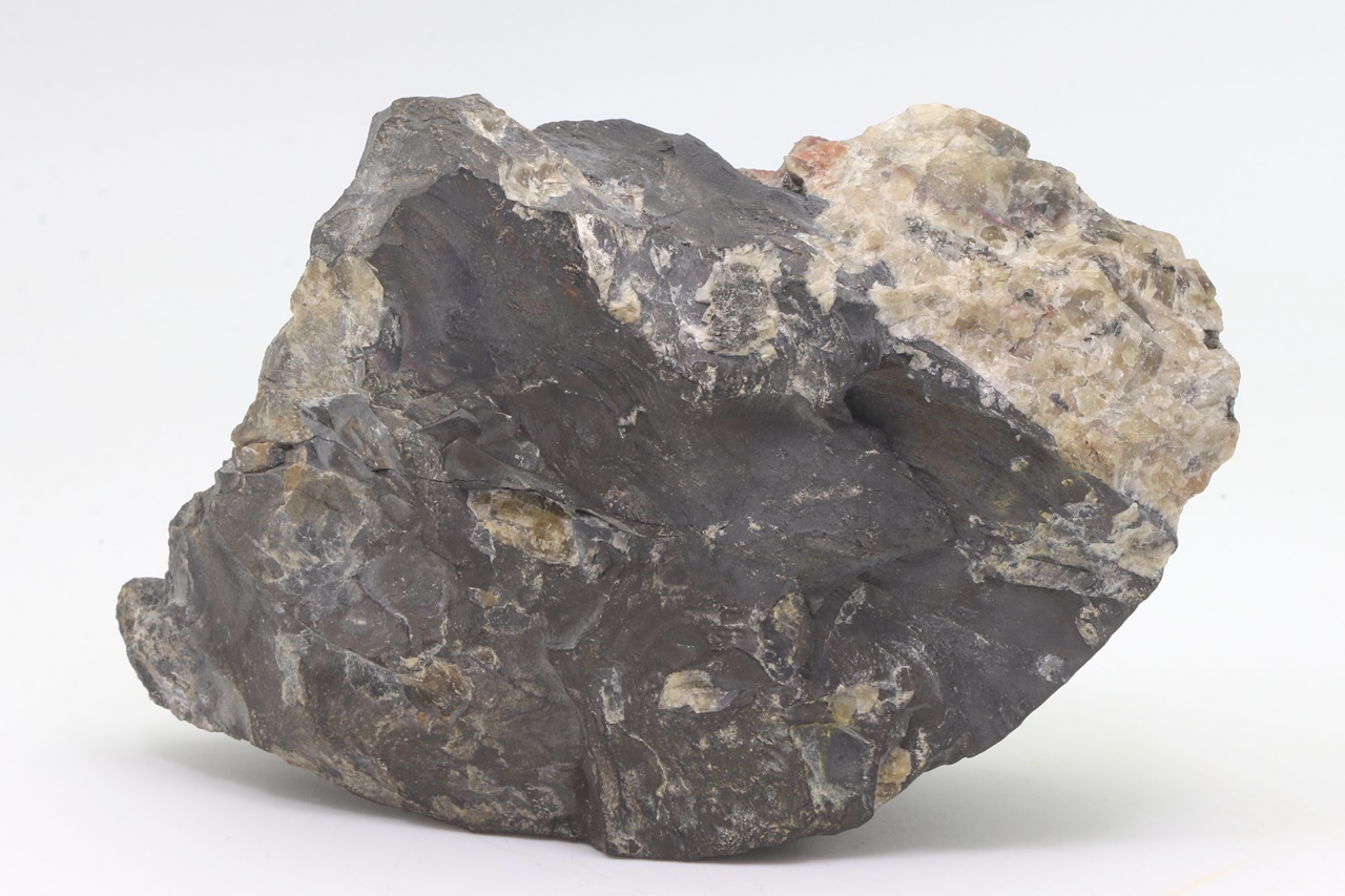 Large sample of massive arsenic, forming on one end a large unetched kidney, intergrow with dark calcite.