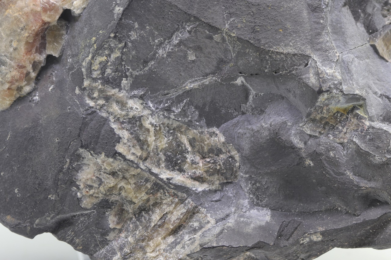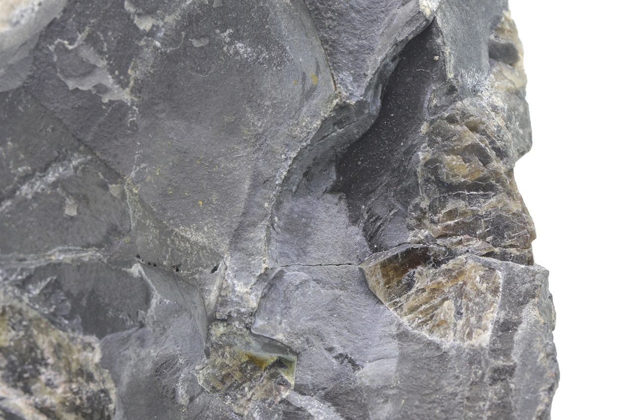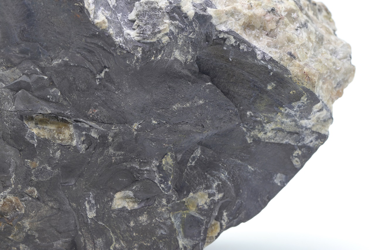 Large sample of massive arsenic, forming on one end a large unetched kidney, intergrow with dark calcite.