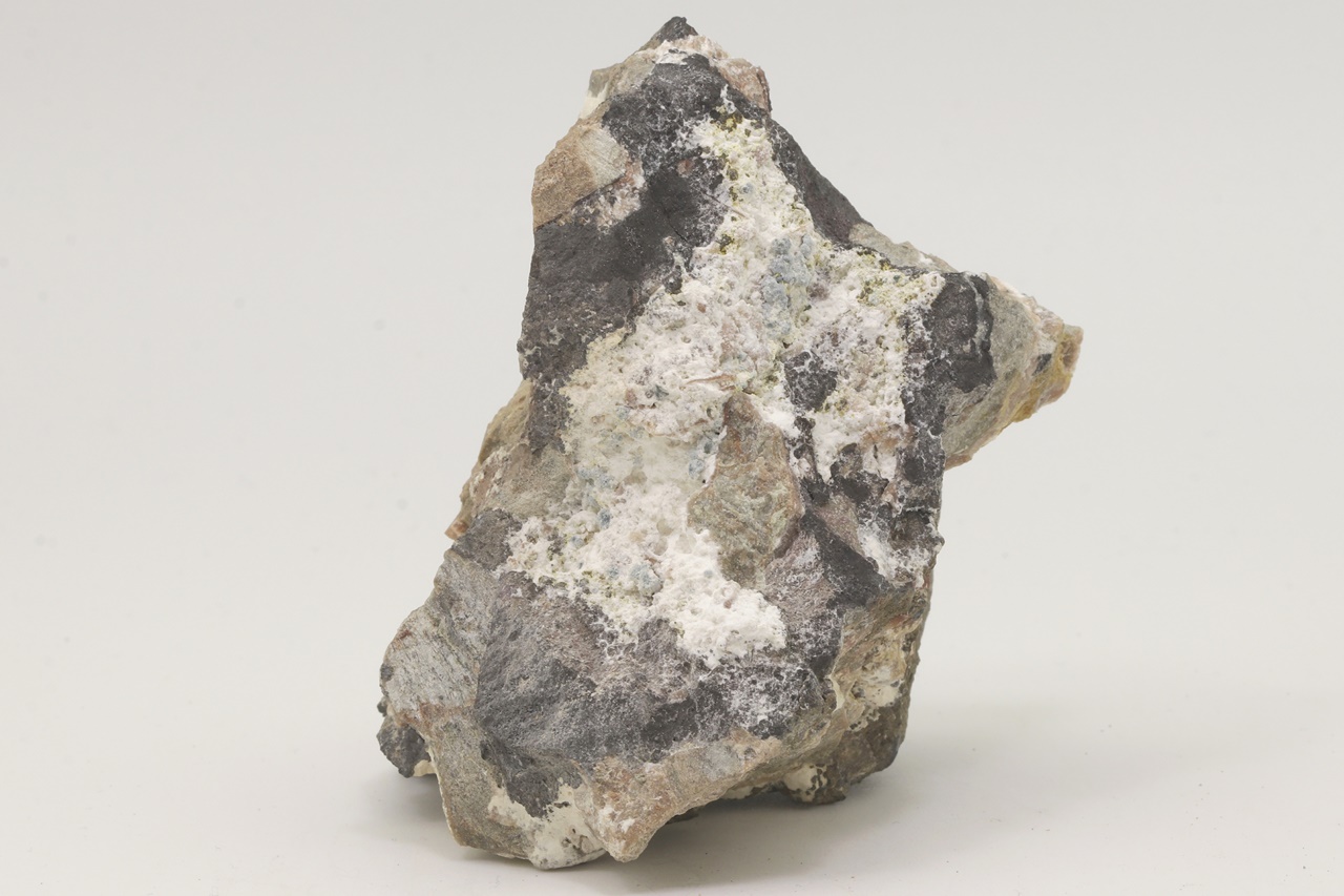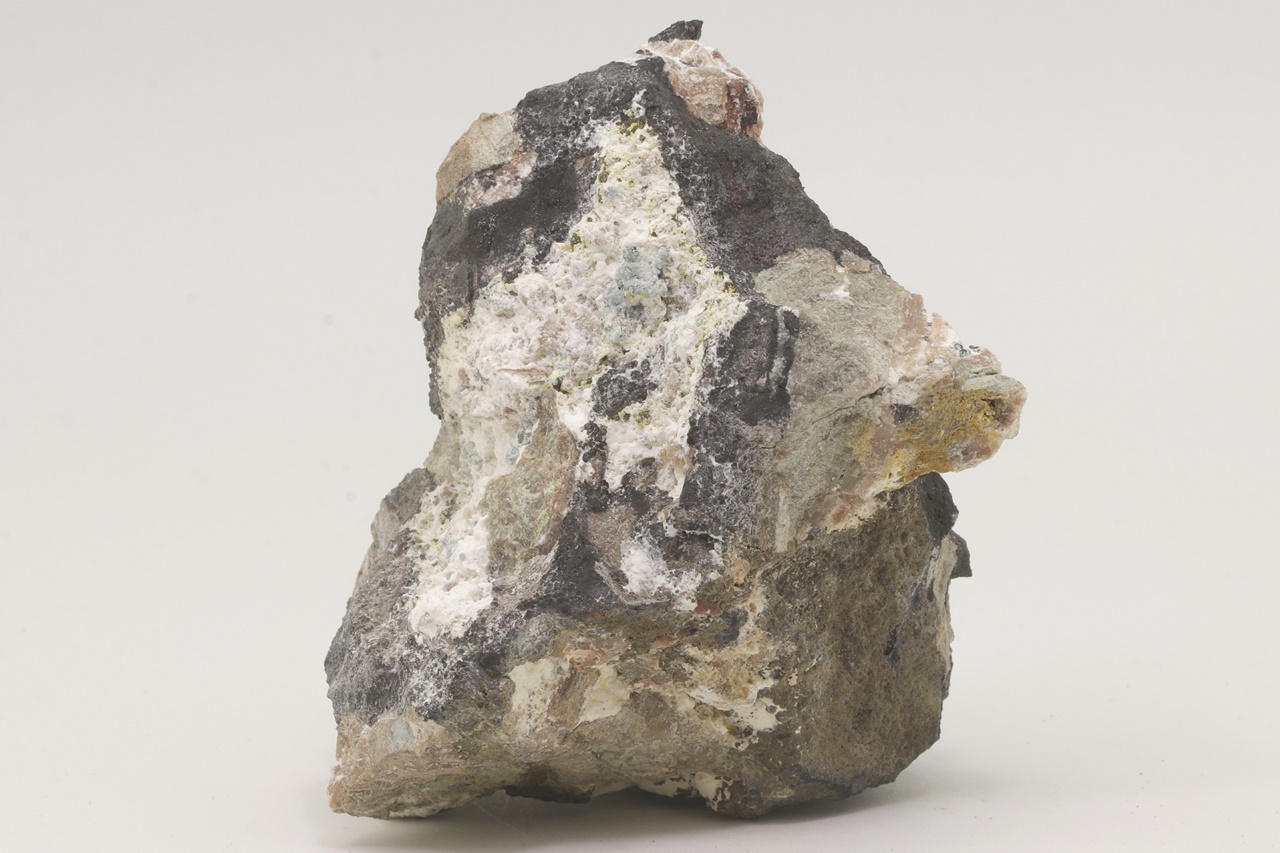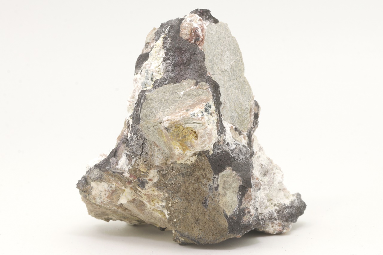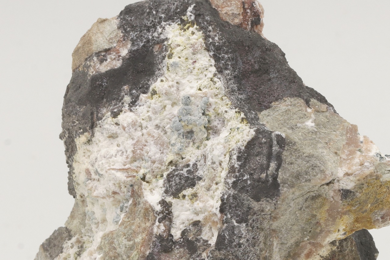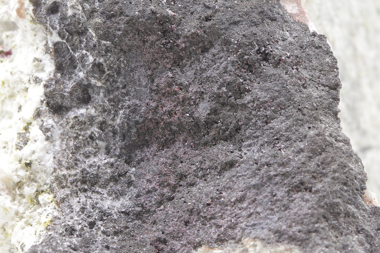 Černý ryzí arsen prorostlý s červenými krystalky proustitu se zelenými kuličkami sekundárního parasymplesitu až 2 mm velkými.