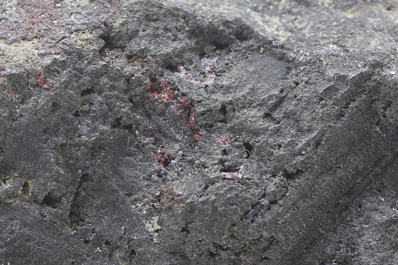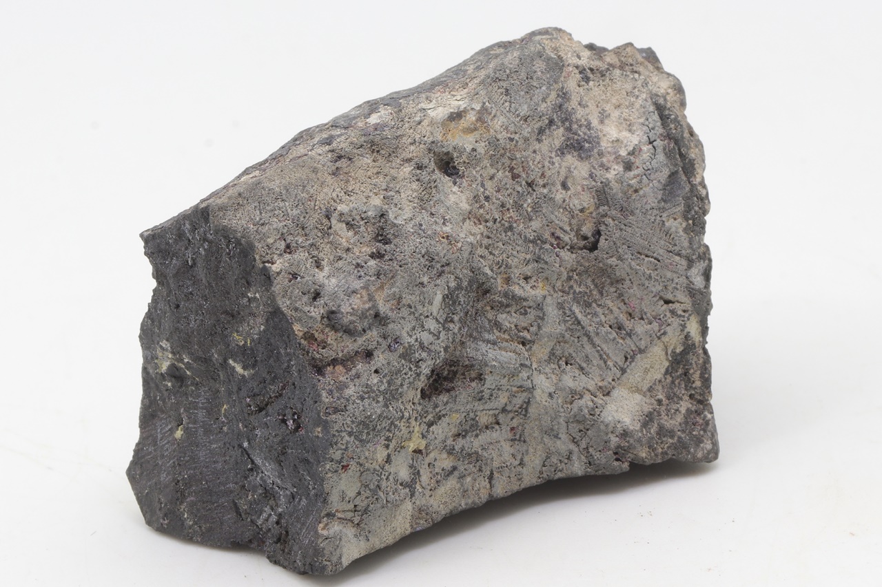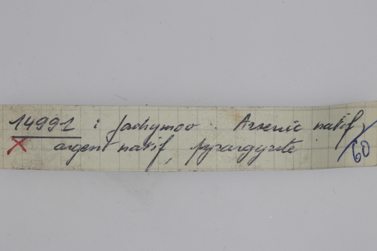 Historical example of perimorphosis in arsenic after dendritic silver filled with crystals of intensely red proustit.