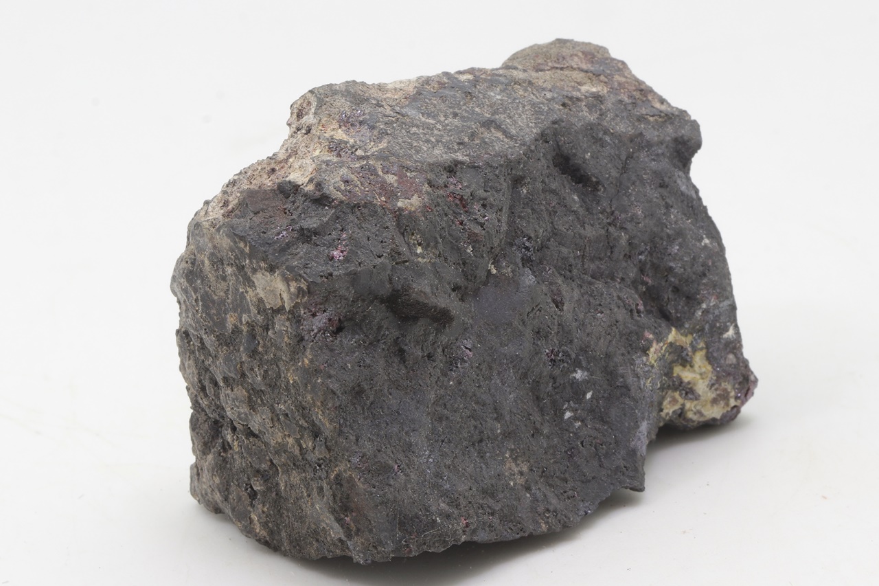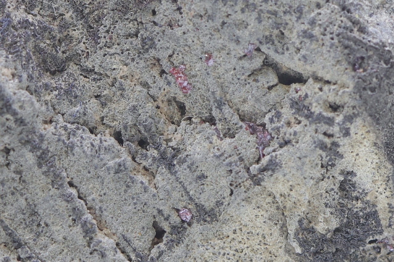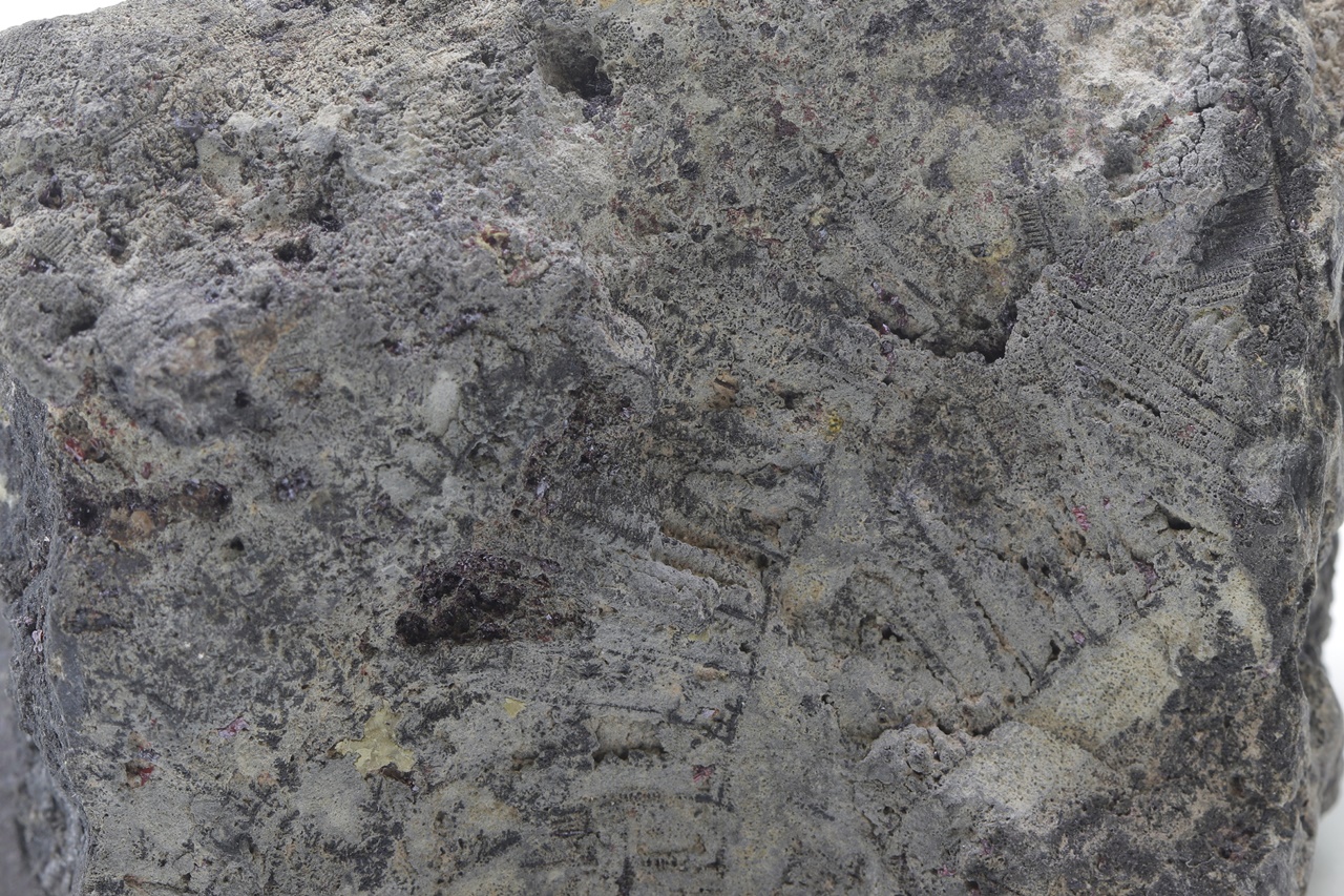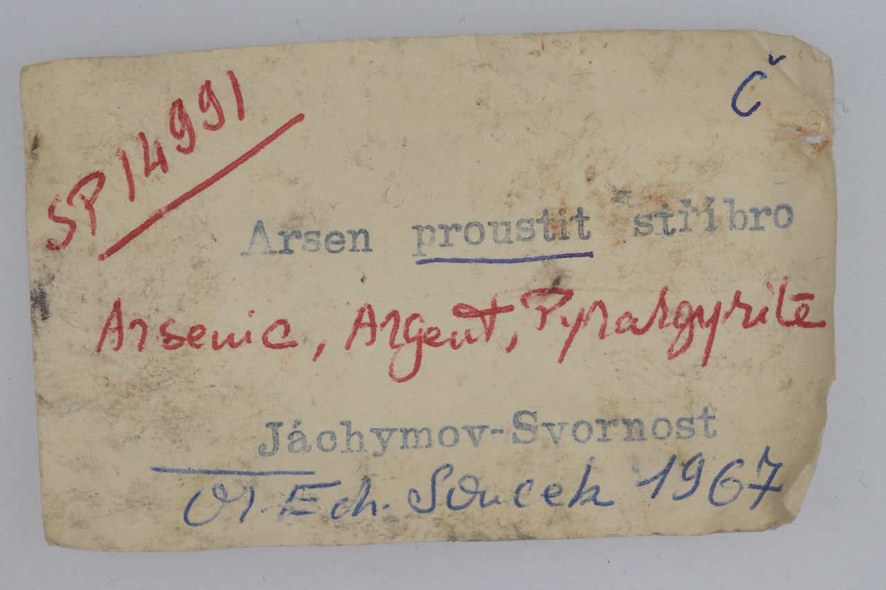 Historical example of perimorphosis in arsenic after dendritic silver filled with crystals of intensely red proustit.