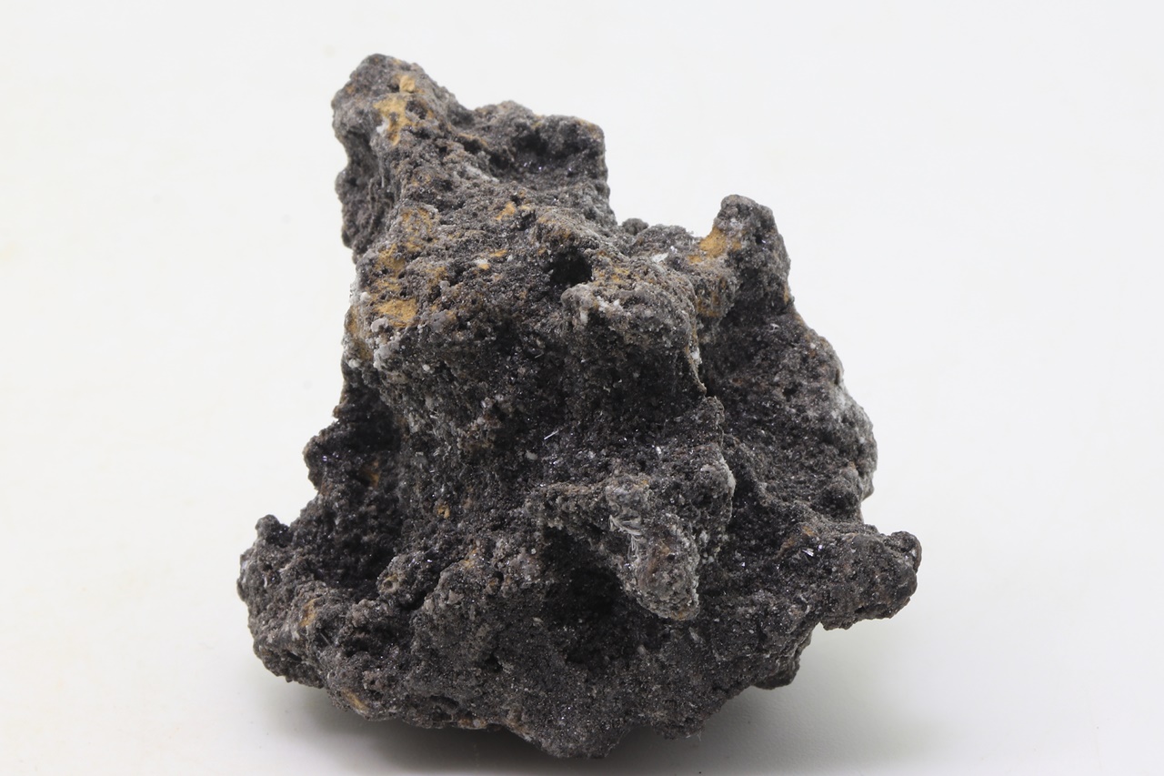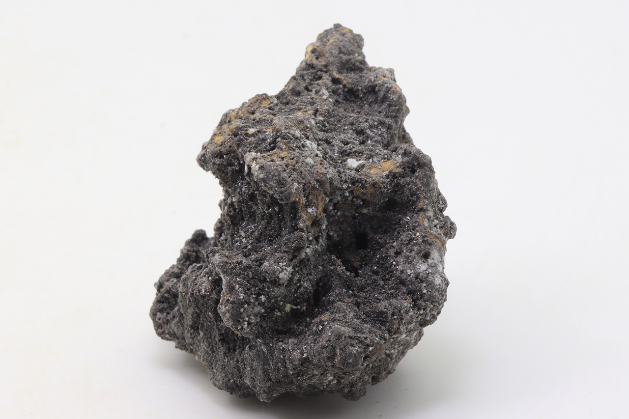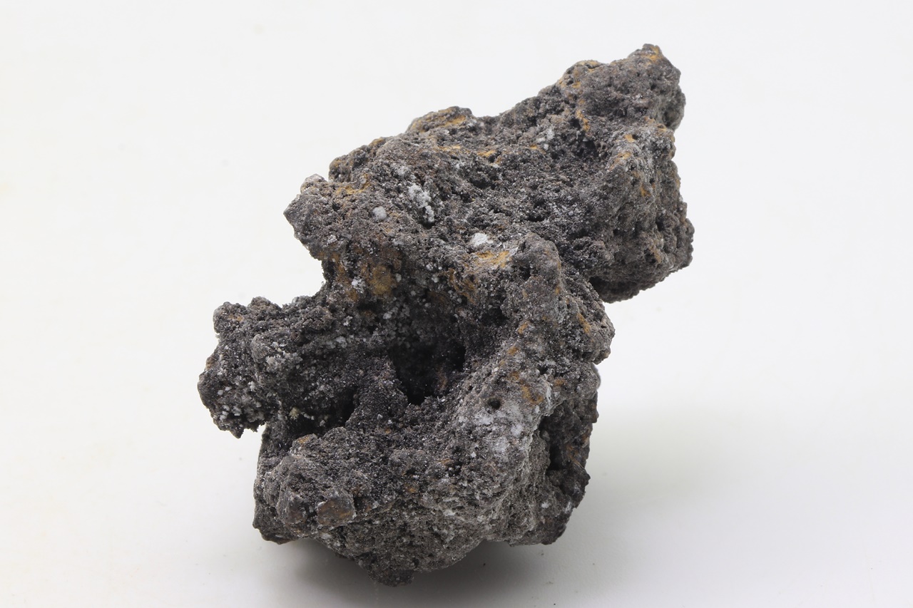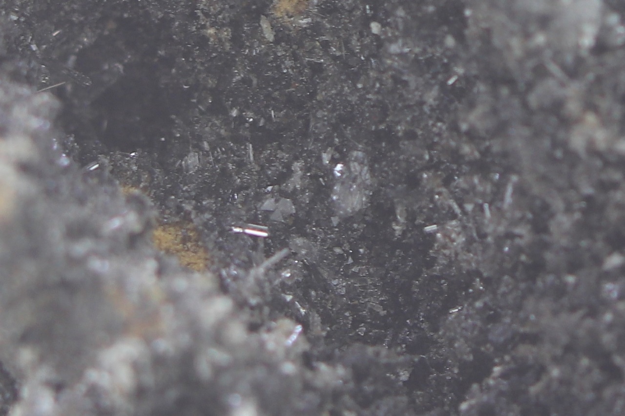 Rich crusts of white columnar crystals of arsenolite and octahedra of claudetite, both dimorphs of As2O3.
