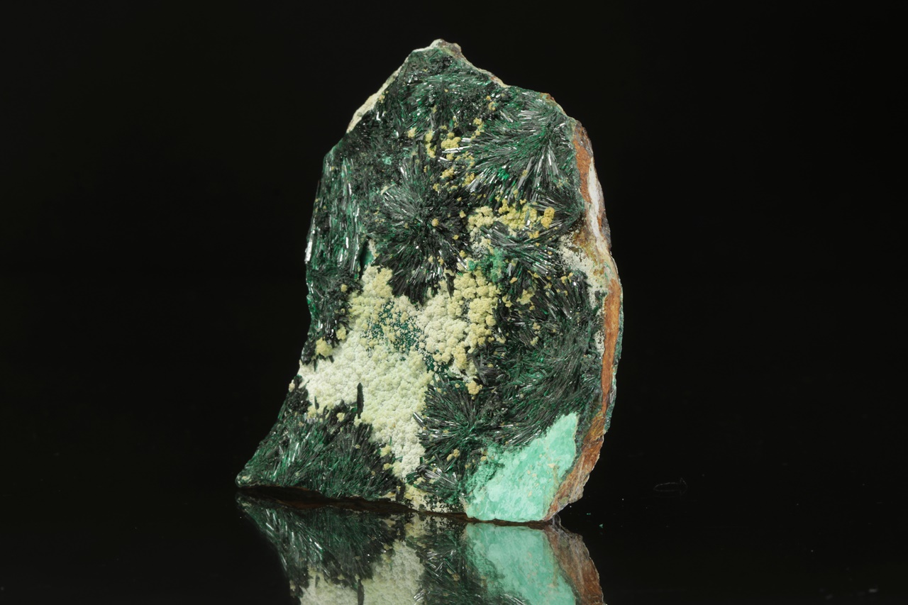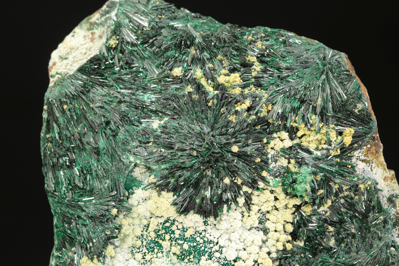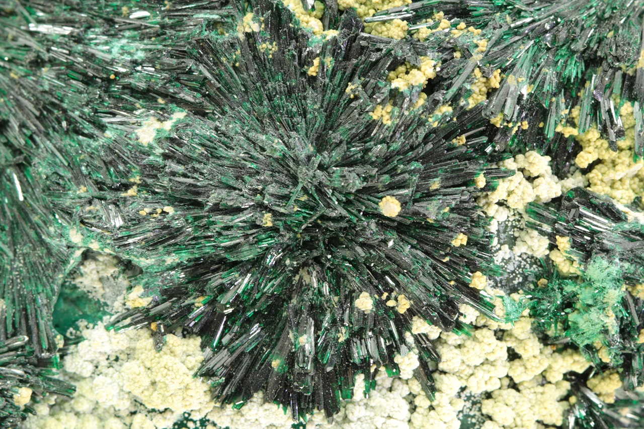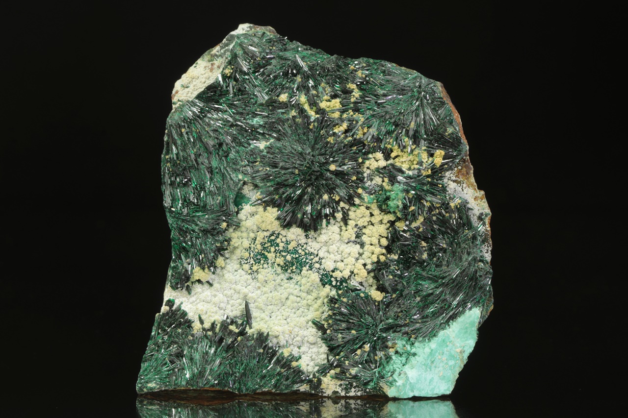 Vyjímečně bohatý vzorek radialních agregátů sytě zeleného atacamitu tvořených diamantově lesklými lištovitými krystaly. Velikost “květu” v prostředku vzorku má průměr 2,5 cm.