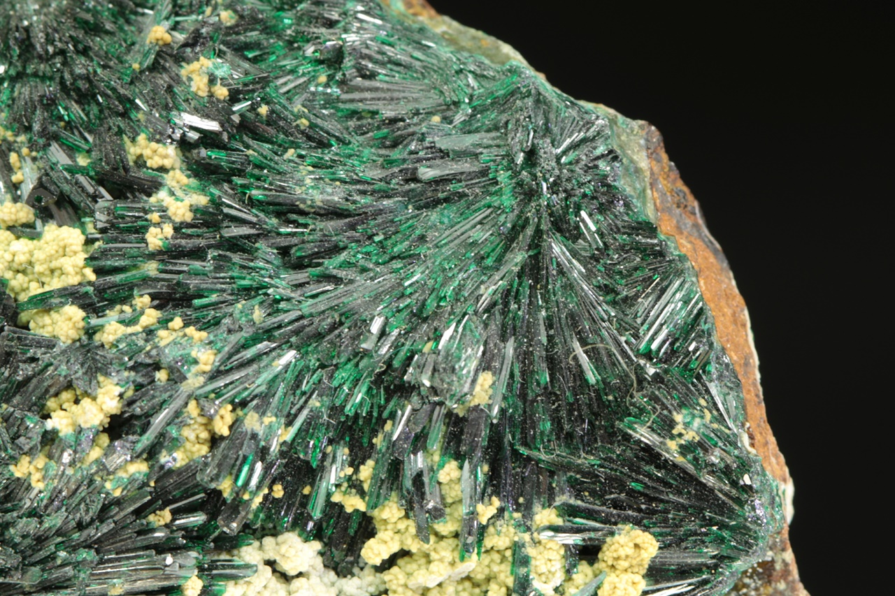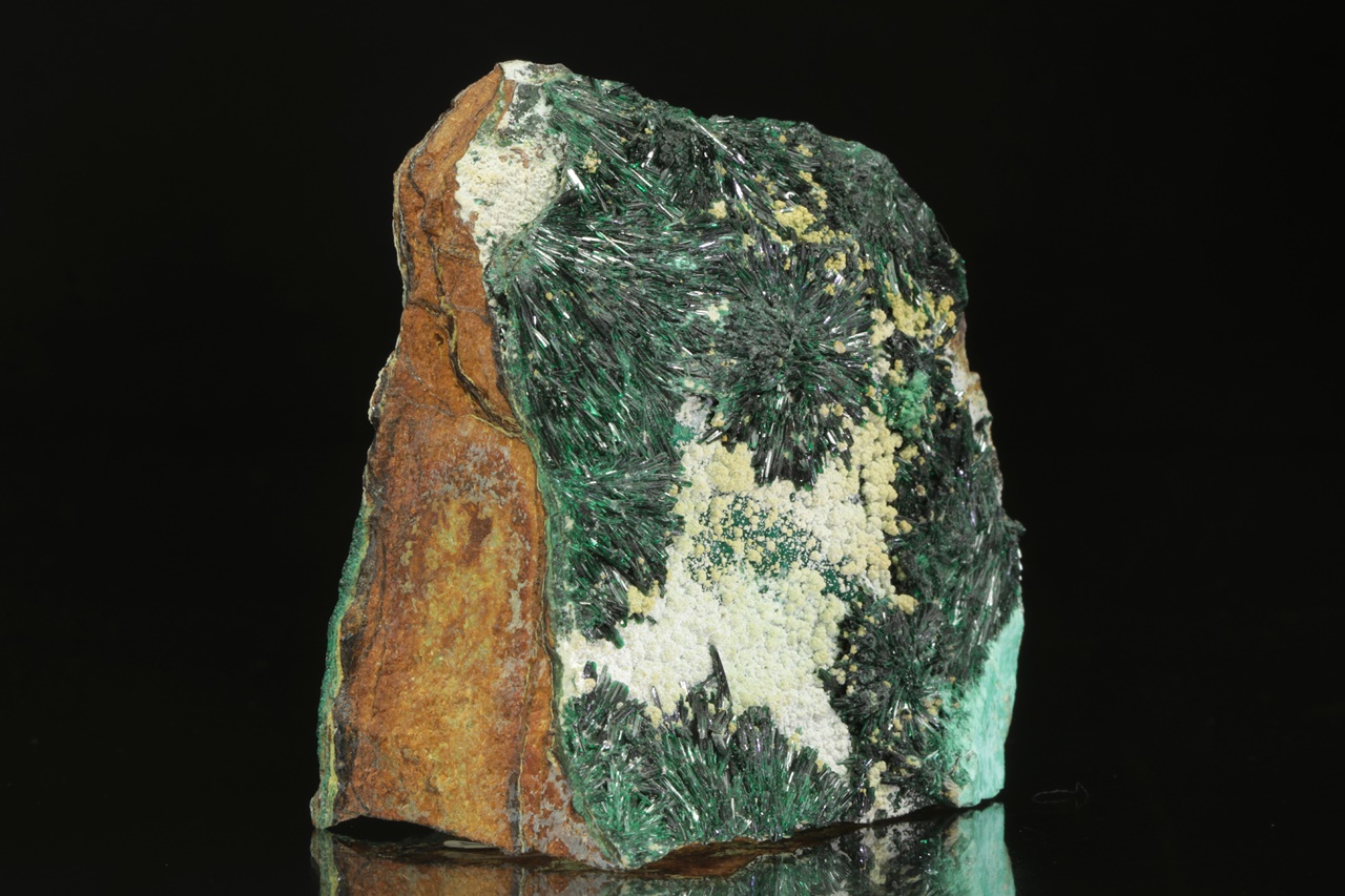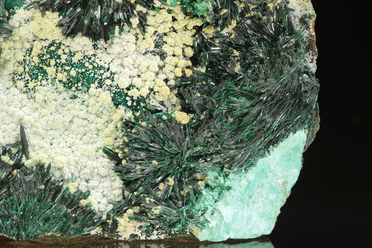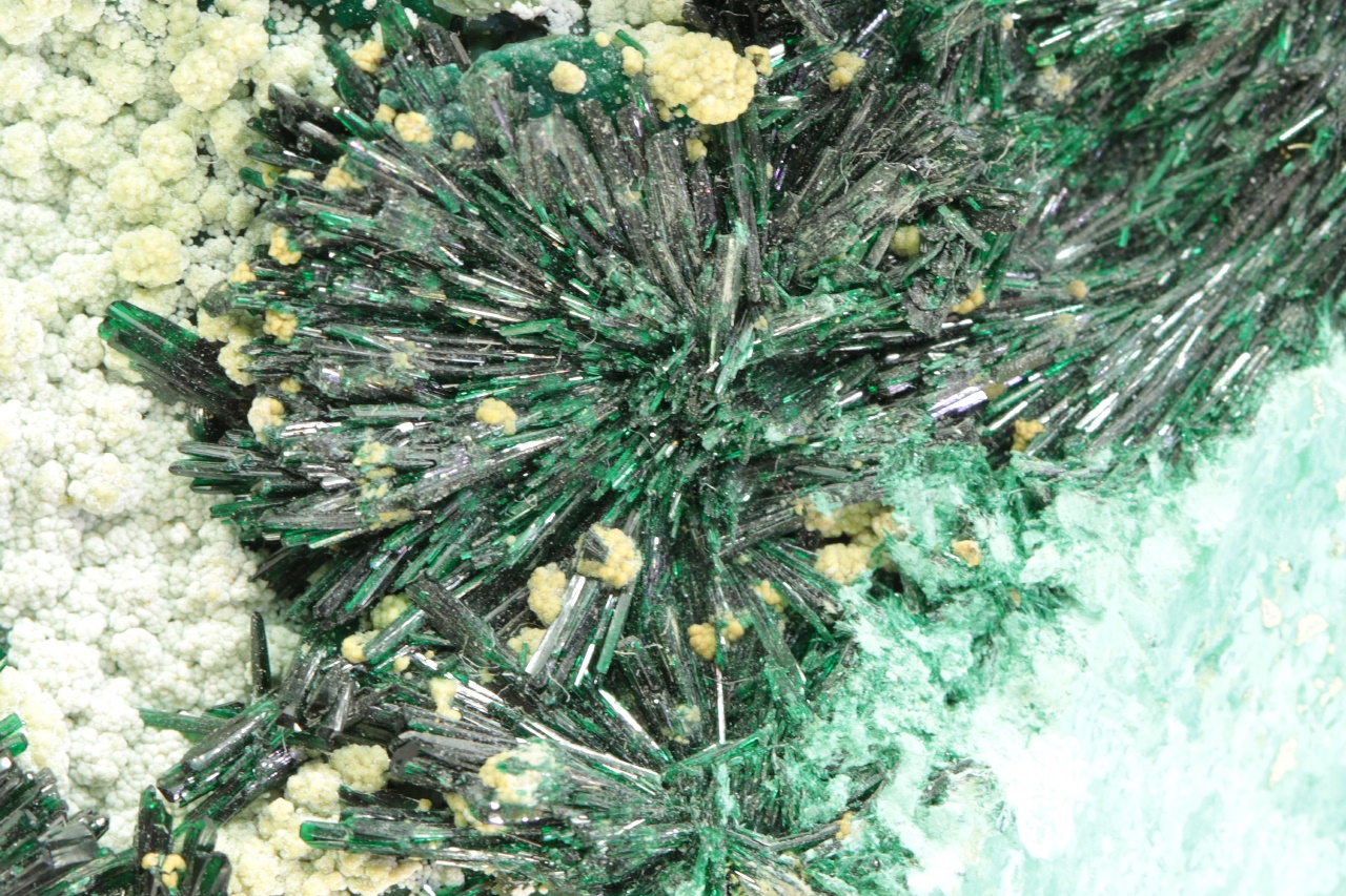 Vyjímečně bohatý vzorek radialních agregátů sytě zeleného atacamitu tvořených diamantově lesklými lištovitými krystaly. Velikost “květu” v prostředku vzorku má průměr 2,5 cm.