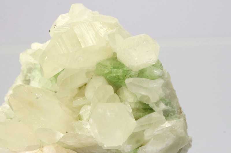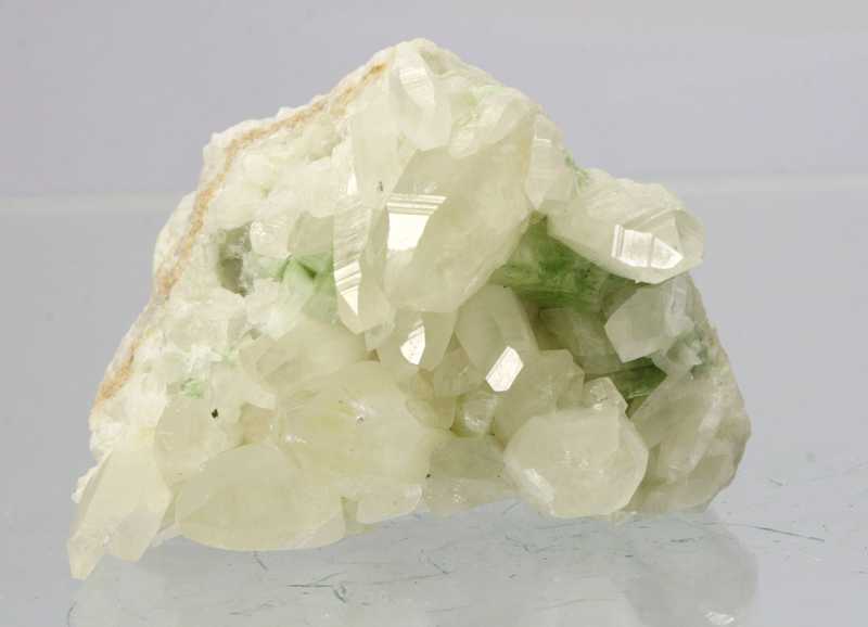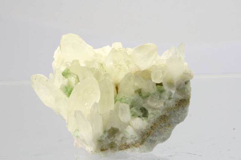 Rich specimen of large aluminum phosphate crystals – augelite from Peru. Green shiny augelite crystals grown on rock crystal crystals.