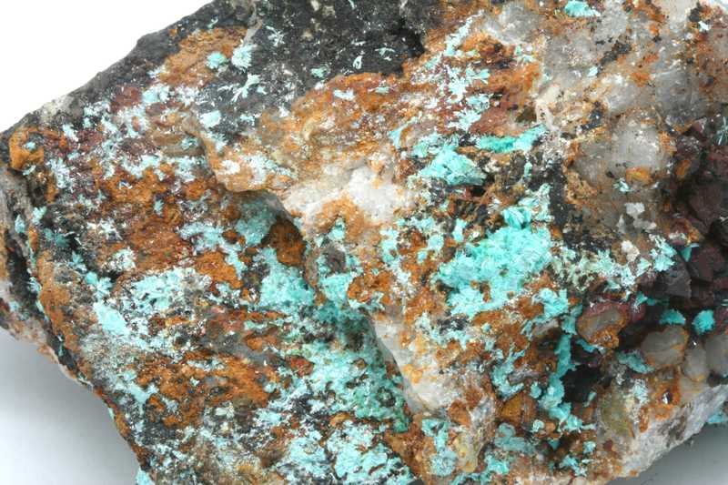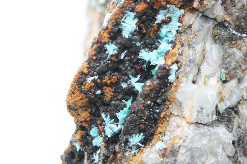 Rich sample of turquoise zinc and copper carbonate aurichalcite from the USA. A very nice specimen of acicular blue-green tufted aggregates of aurichalcite from Arizona.