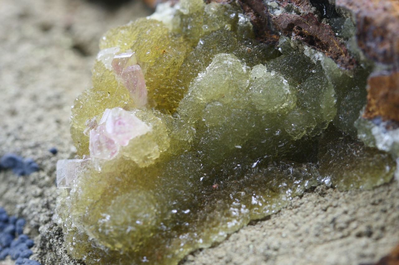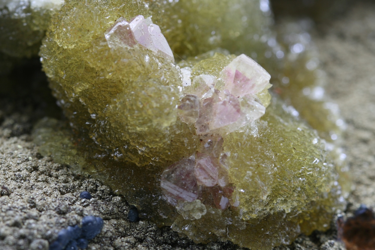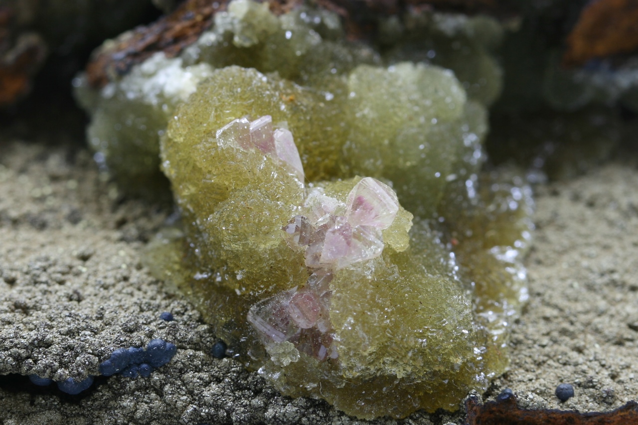 Spherical, yellow-green austenite aggregates with slightly purplish adamite crystals approx. 4 mm in size. Association of zinc arsenate from a Mexican locality.