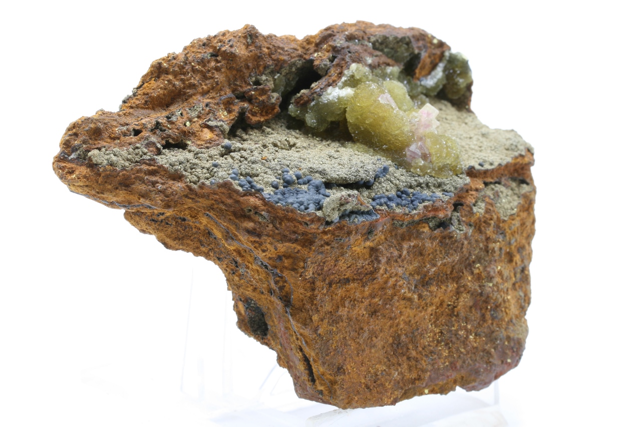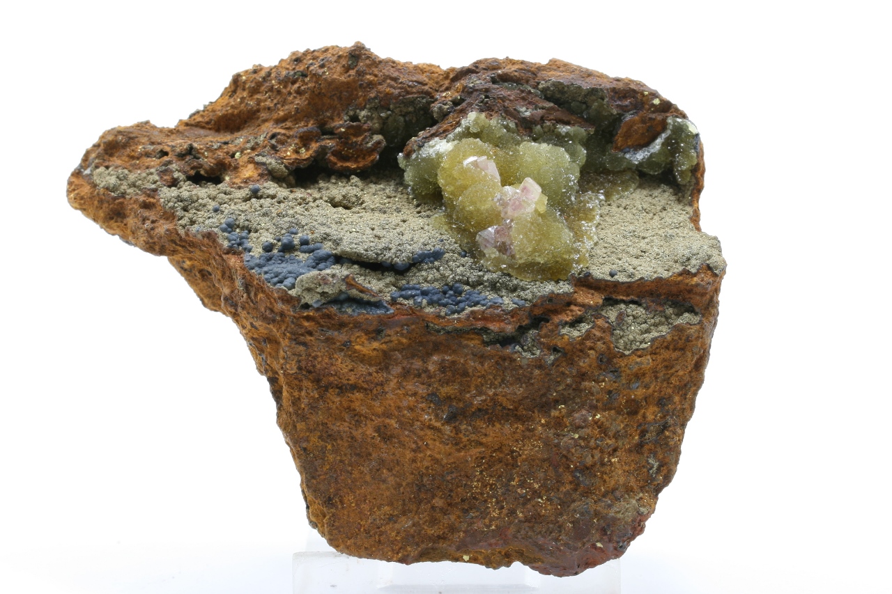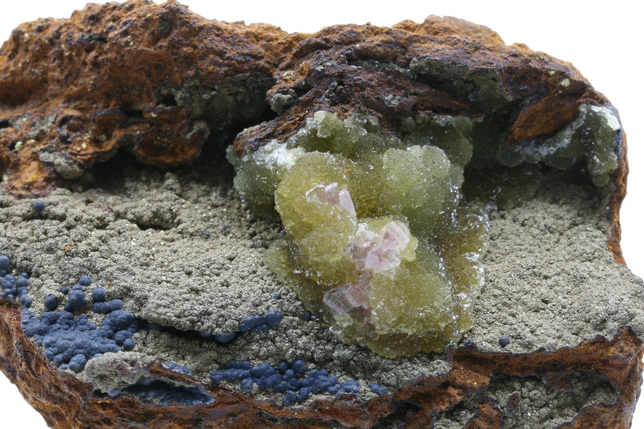 Spherical, yellow-green austenite aggregates with slightly purplish adamite crystals approx. 4 mm in size. Association of zinc arsenate from a Mexican locality.