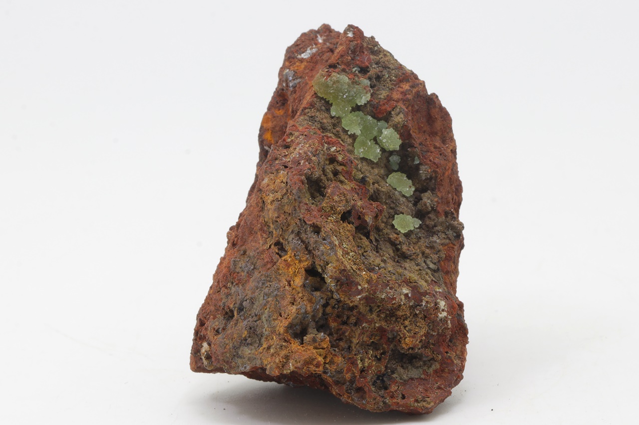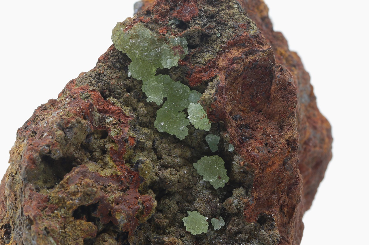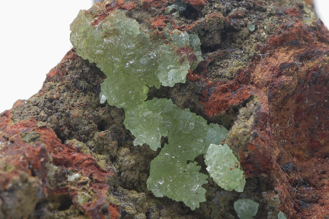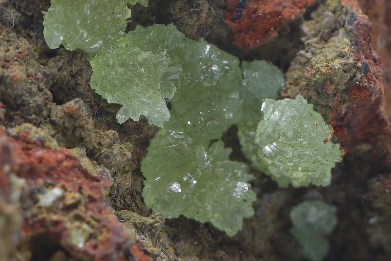 Spherical aggregates of light green calcium and zinc arsenate. The largest aggregate is 5 mm in size.