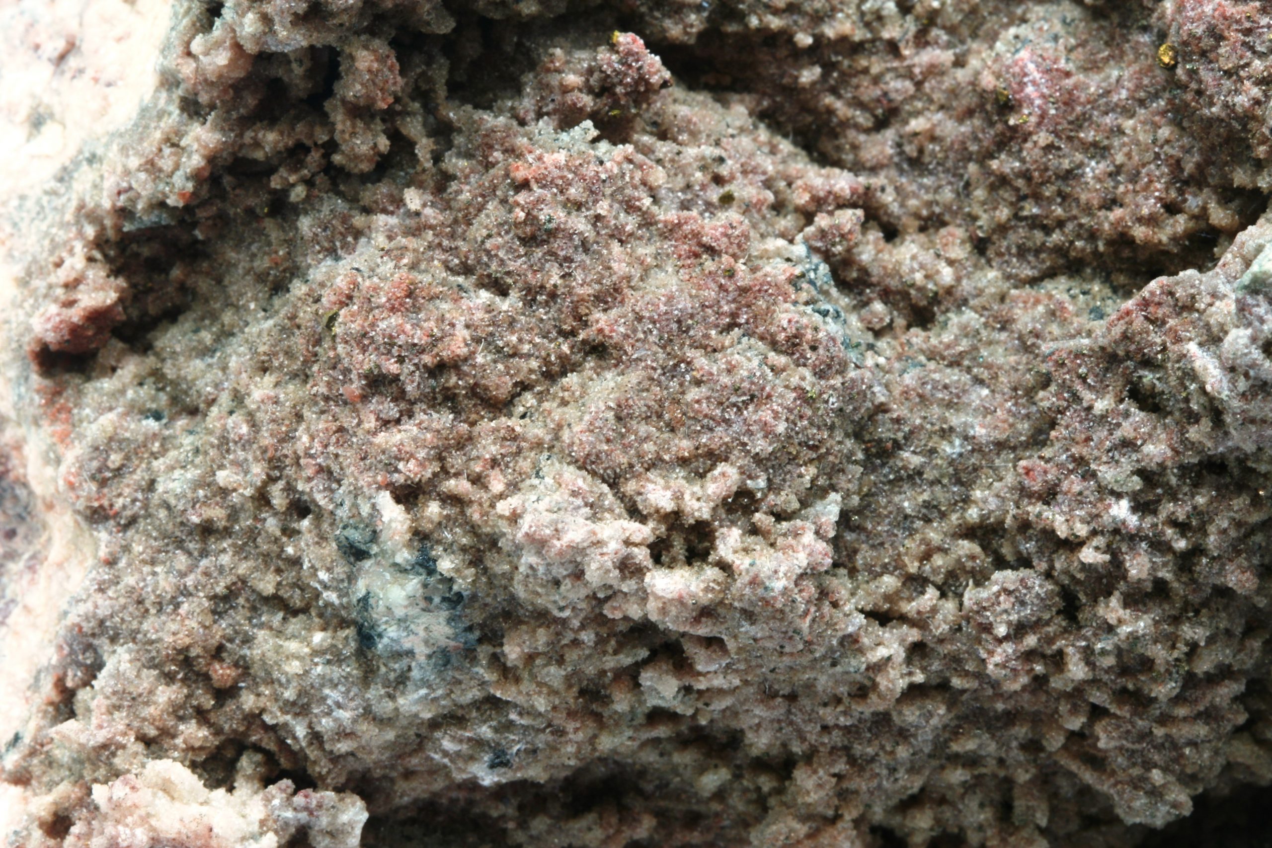 Massive specimen of baryte with small crystals and occasional chalcopyrite crystal.