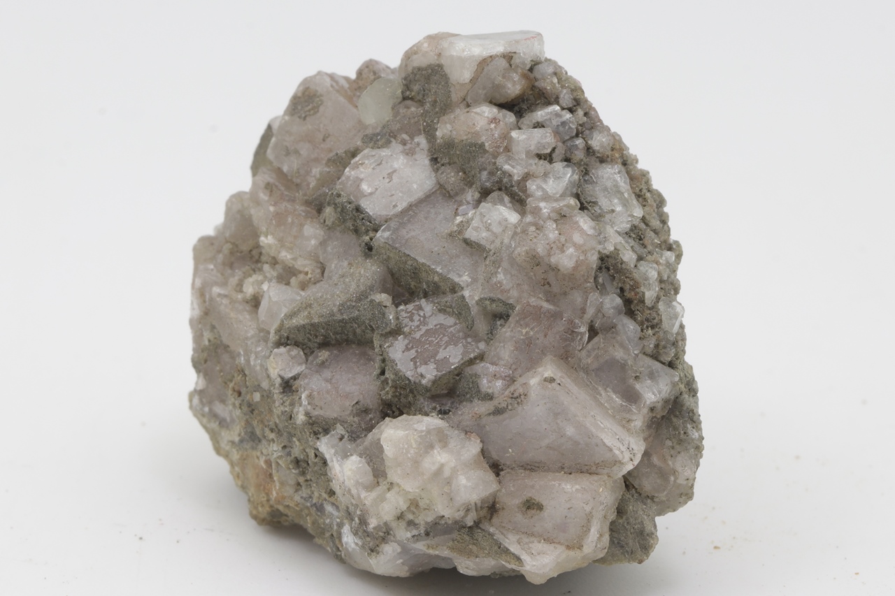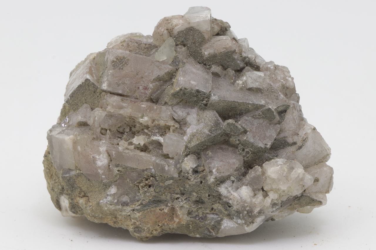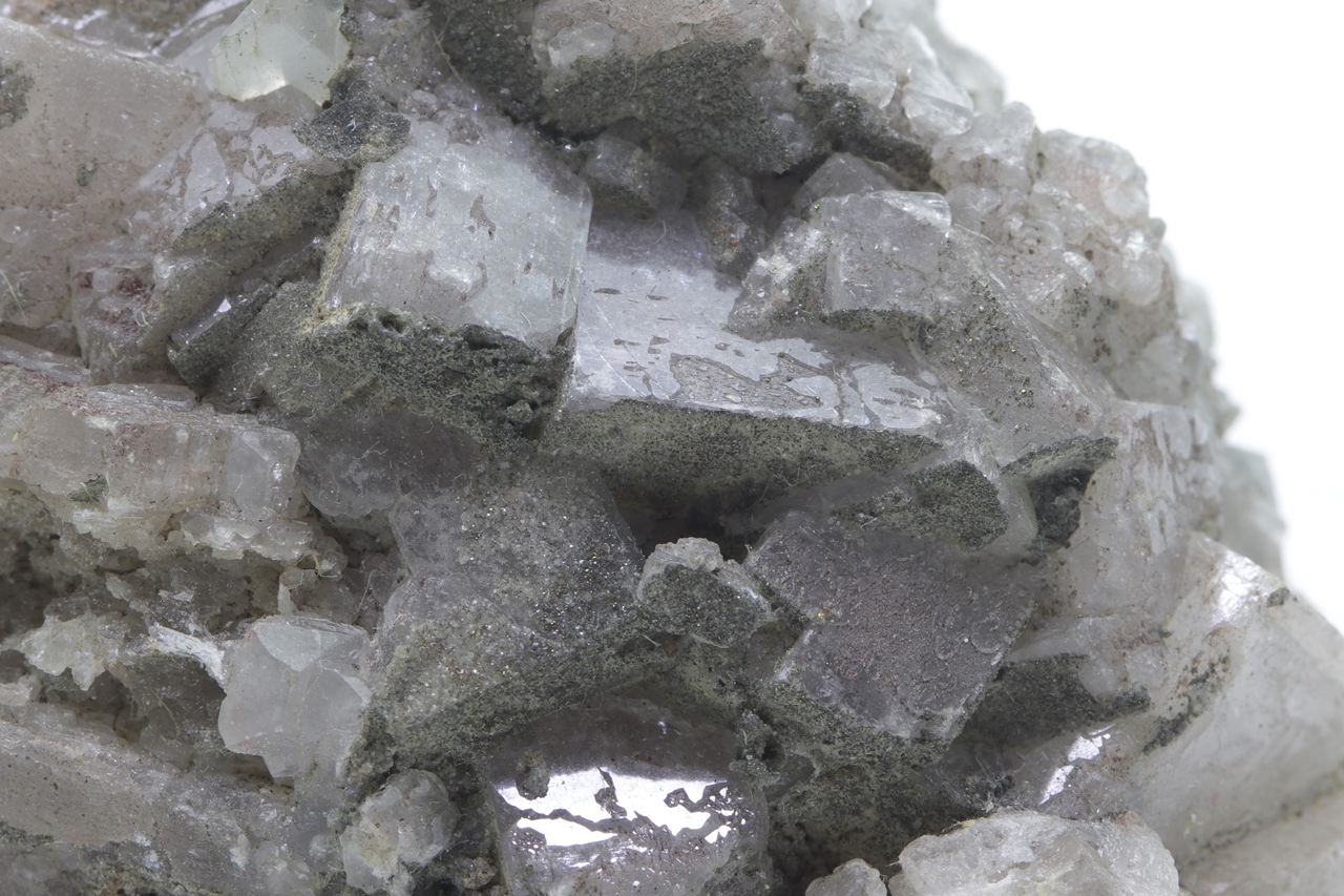 Druse of white, shiny baryte crystals overgrown with small pyrite.