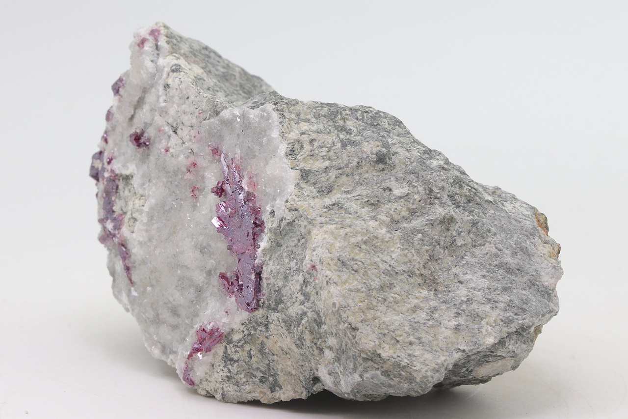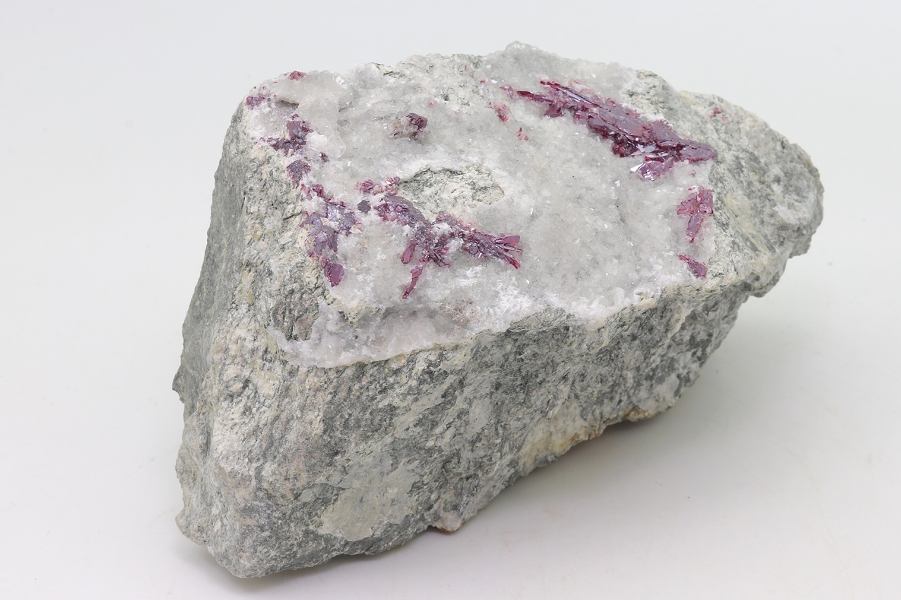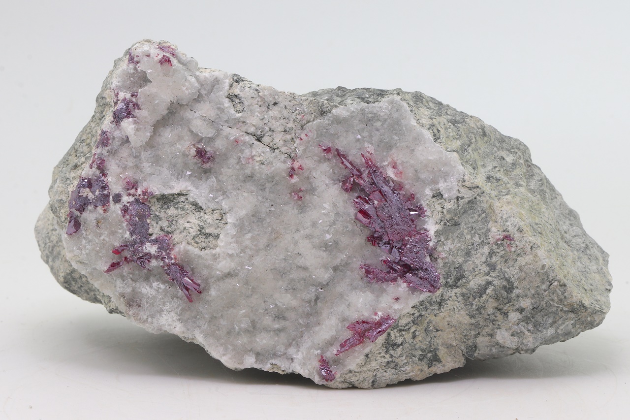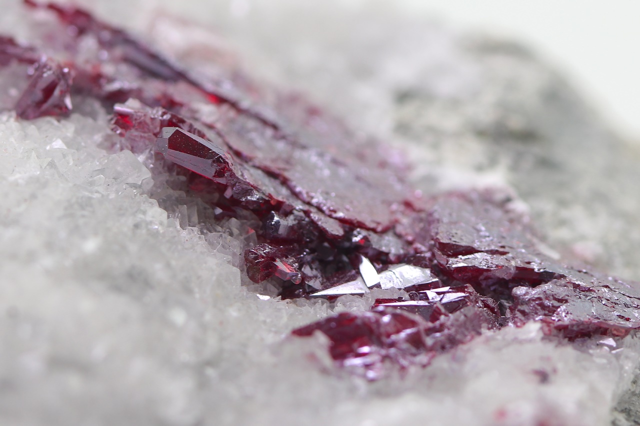 Aesthetic sample of intensely red, terminated Proustit crystals grown into a cavity on a contrasting white Calcite. The larger cluster of Proustit crystals is 4 cm in size.