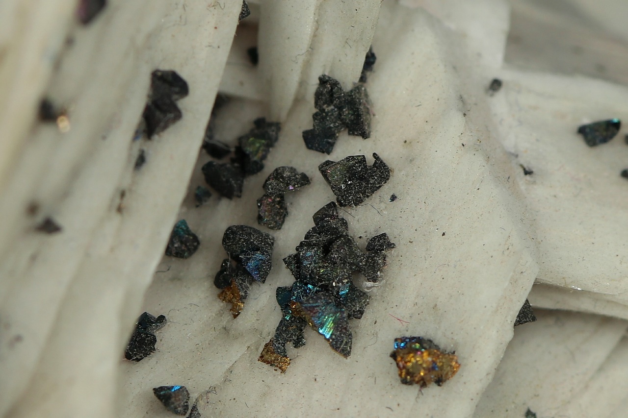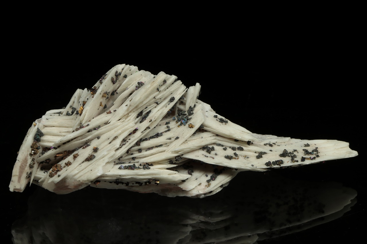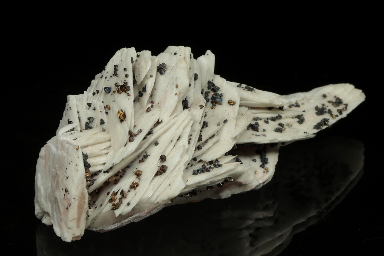 White tabular crystals of baryte sprinkled with aggregates of chalcopyrite.