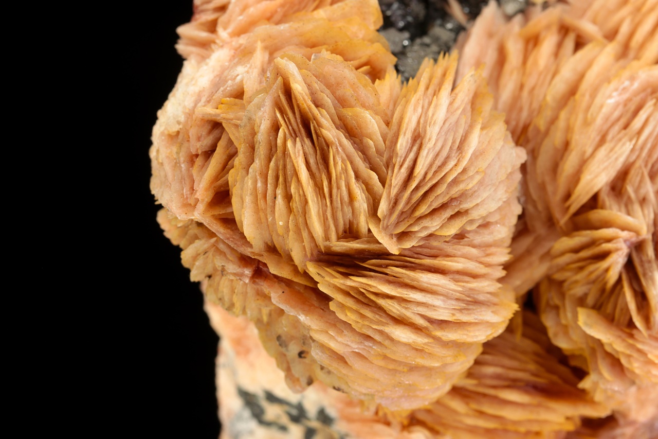 Beautiful rosettes of light pink Baryte grown on dark Galena with clear shiny crystals of Cerussite.