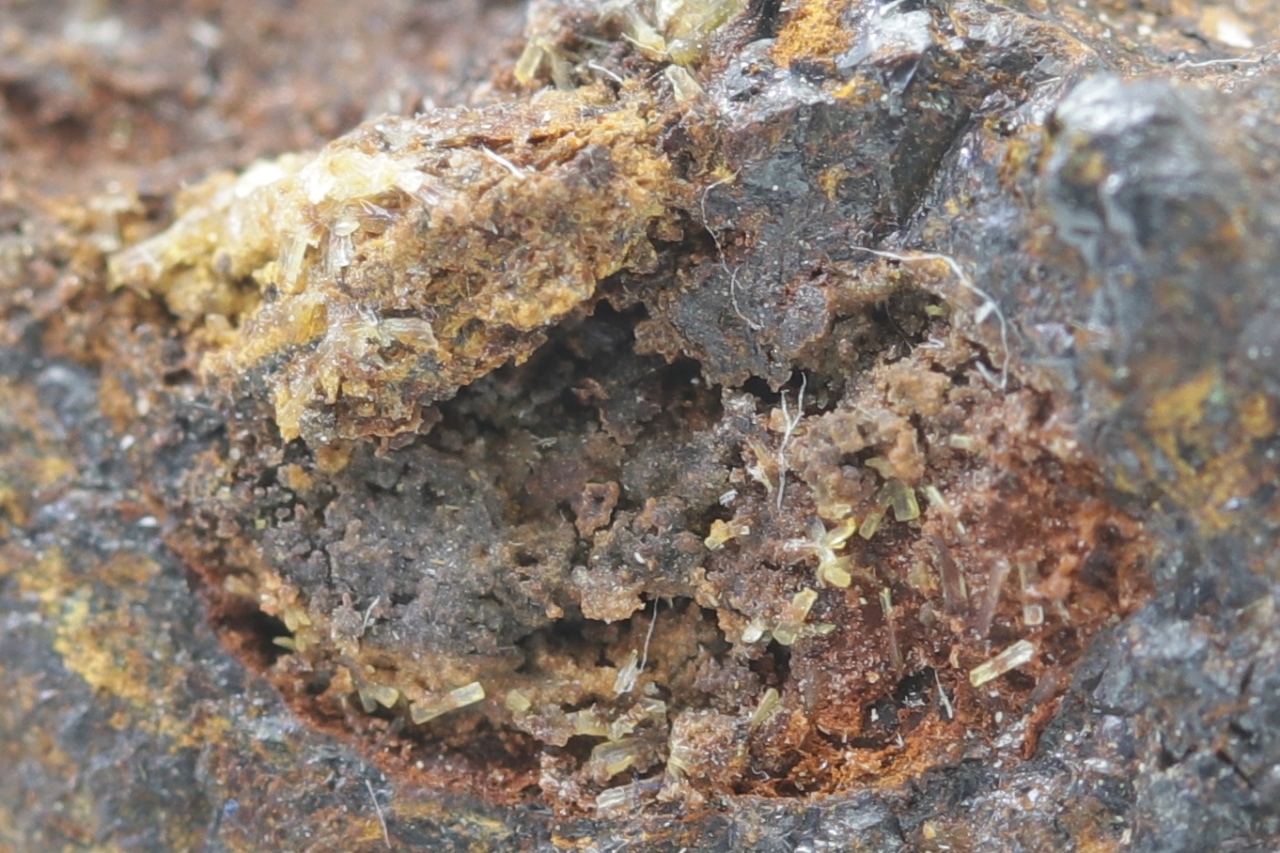 Small columnar crystals of iron phosphate – beraunite occasionally forming fans.