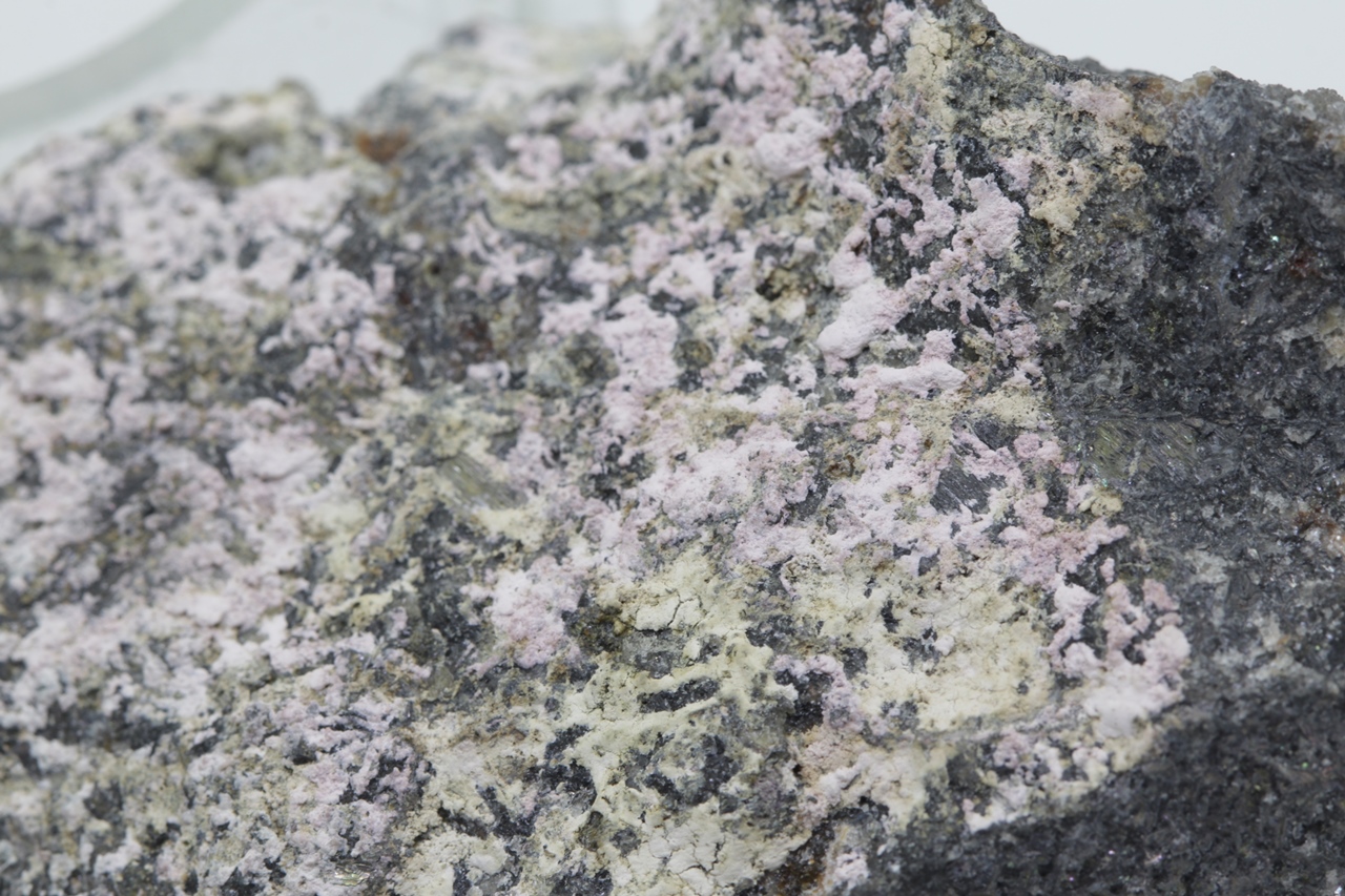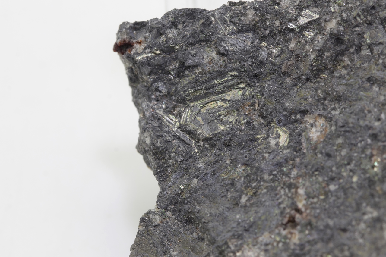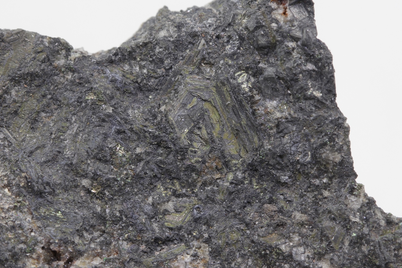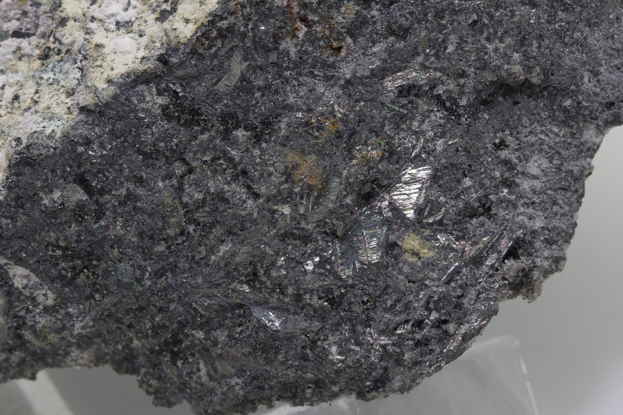 Bismuth forms metallic, brass-colored, skeletal crystals that grow through the entire specimen. There is also one unusually large skeletal habit crystal of size 2.2 cm on the specimen. This sample also contains powdery white-pink aggregates of secondary minerals. It is a very rich specimen of this mineral from Jáchymov.