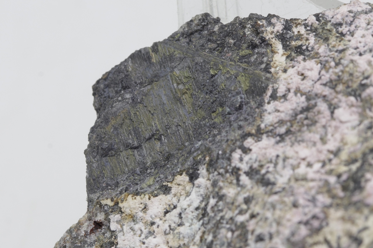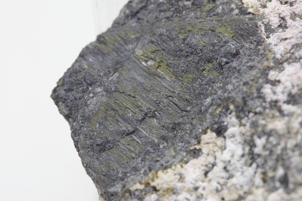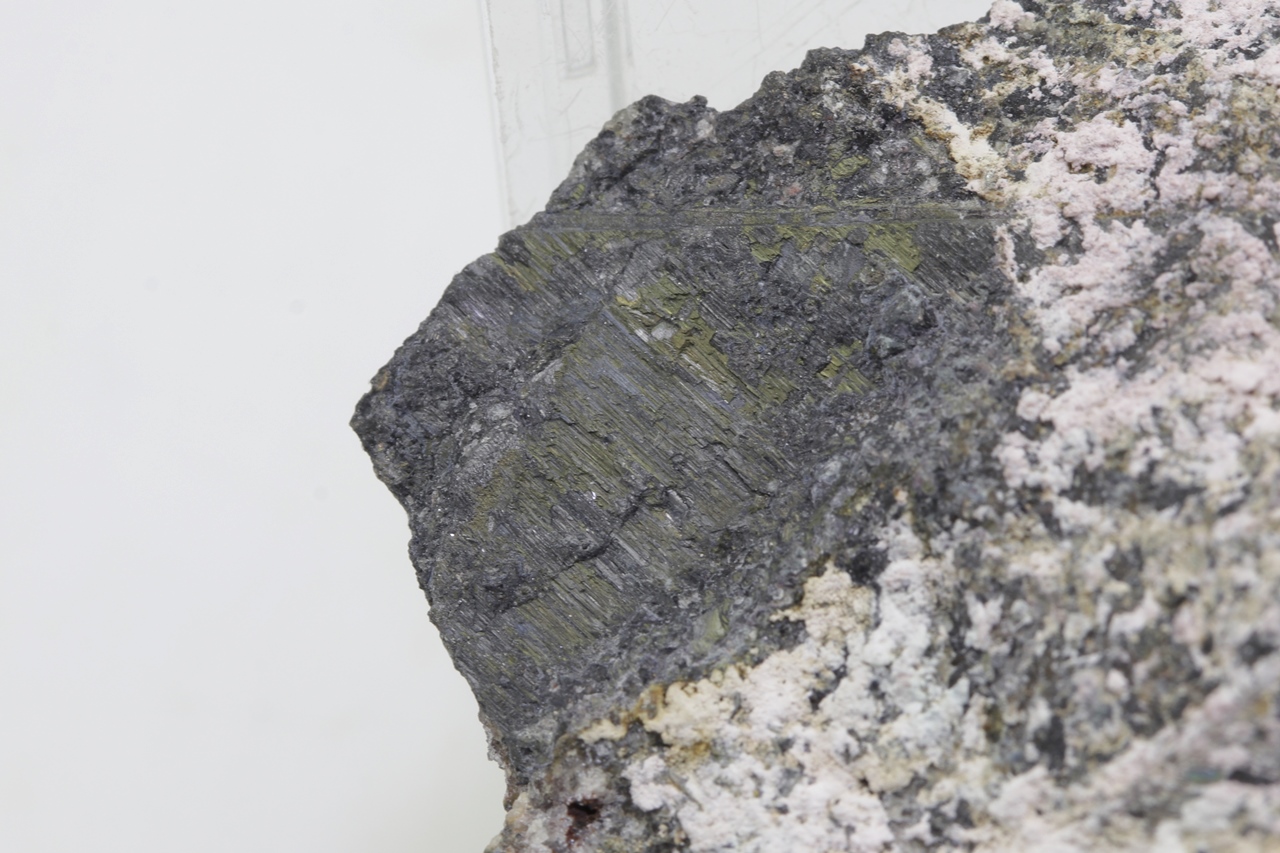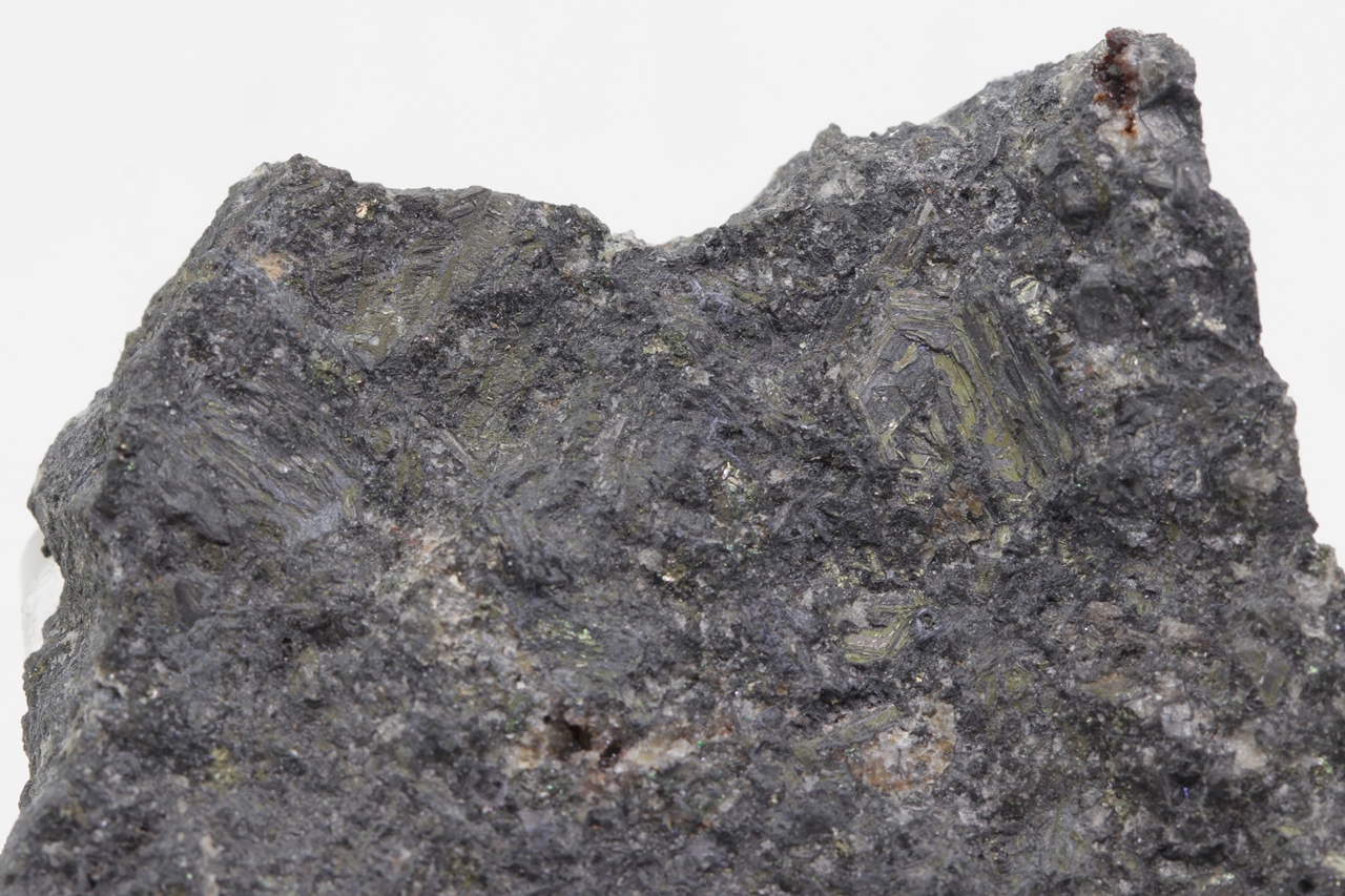 Bismuth forms metallic, brass-colored, skeletal crystals that grow through the entire specimen. There is also one unusually large skeletal habit crystal of size 2.2 cm on the specimen. This sample also contains powdery white-pink aggregates of secondary minerals. It is a very rich specimen of this mineral from Jáchymov.