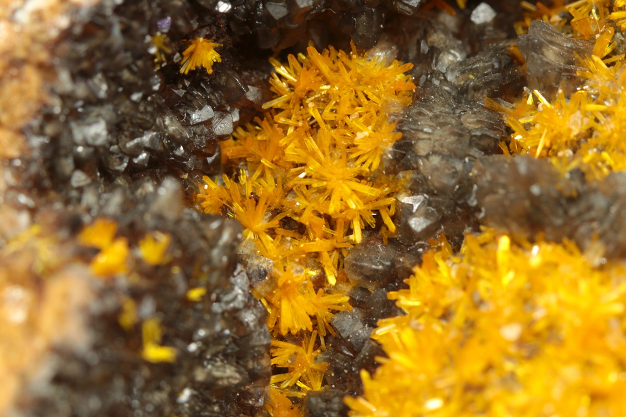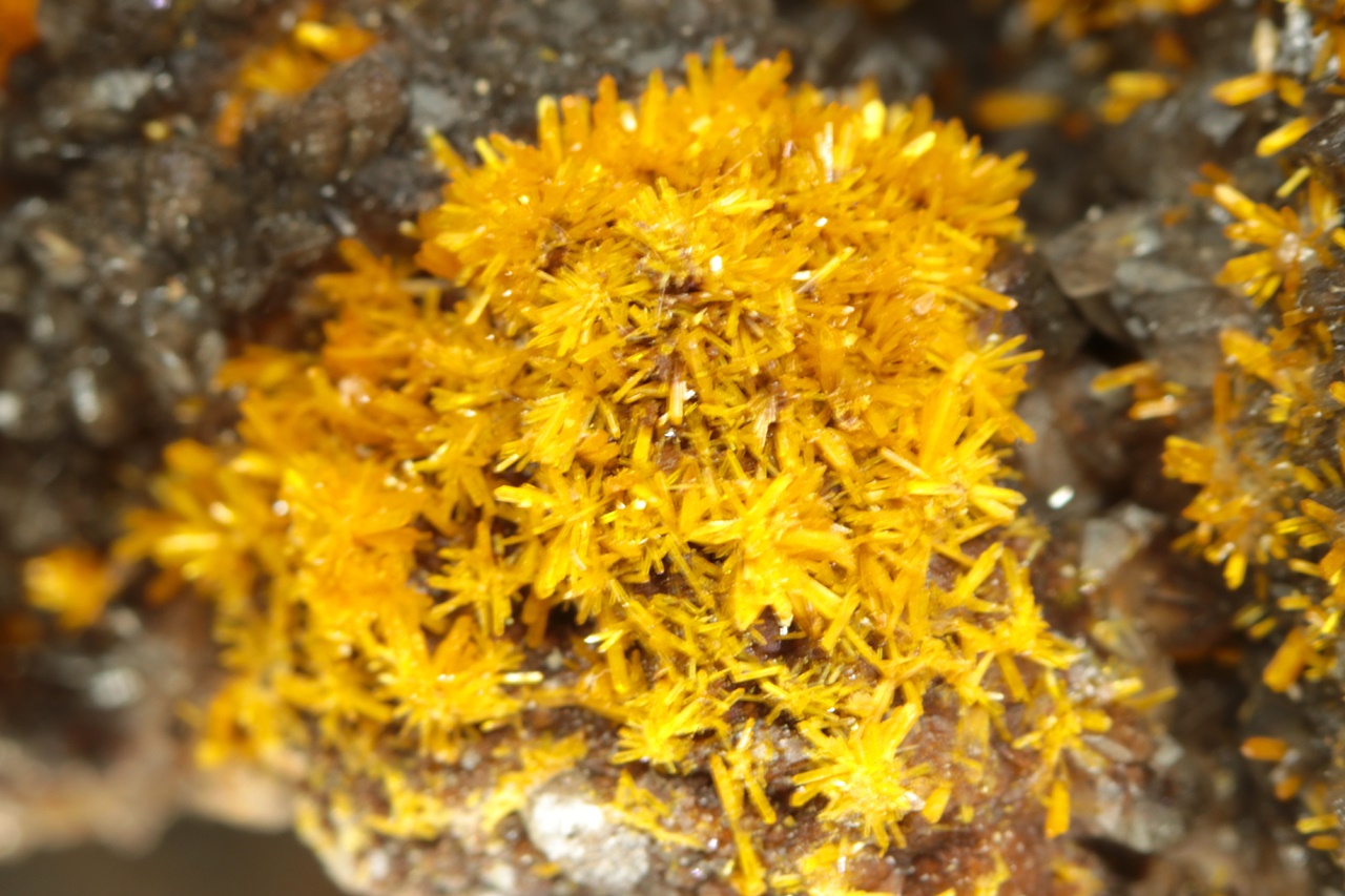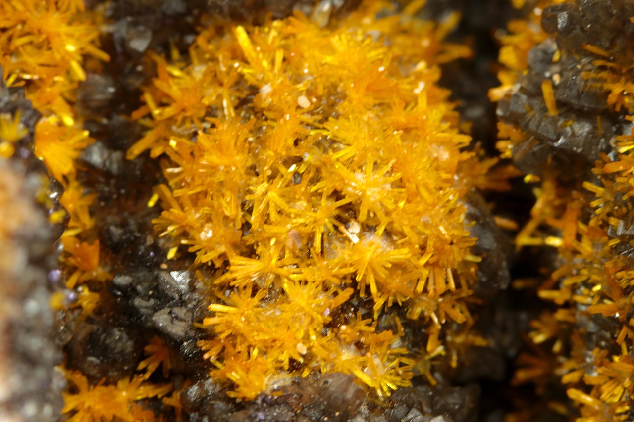 A stunning specimen of richly growing, vividly yellow uranyl silicate crystals on dark calcite. Columnar crystals, up to two millimeters in size, form radial aggregates resembling flowers.