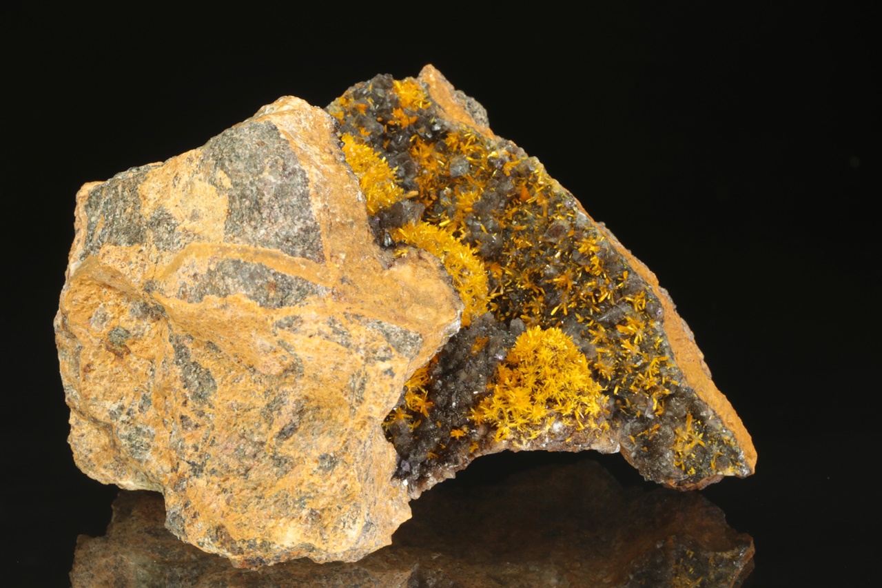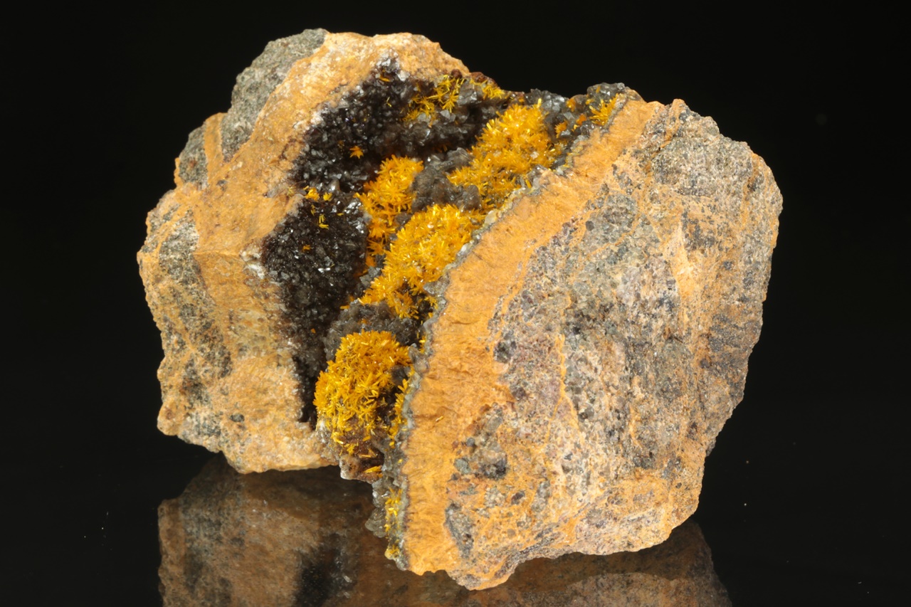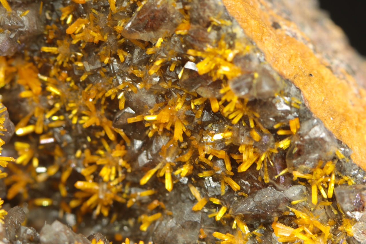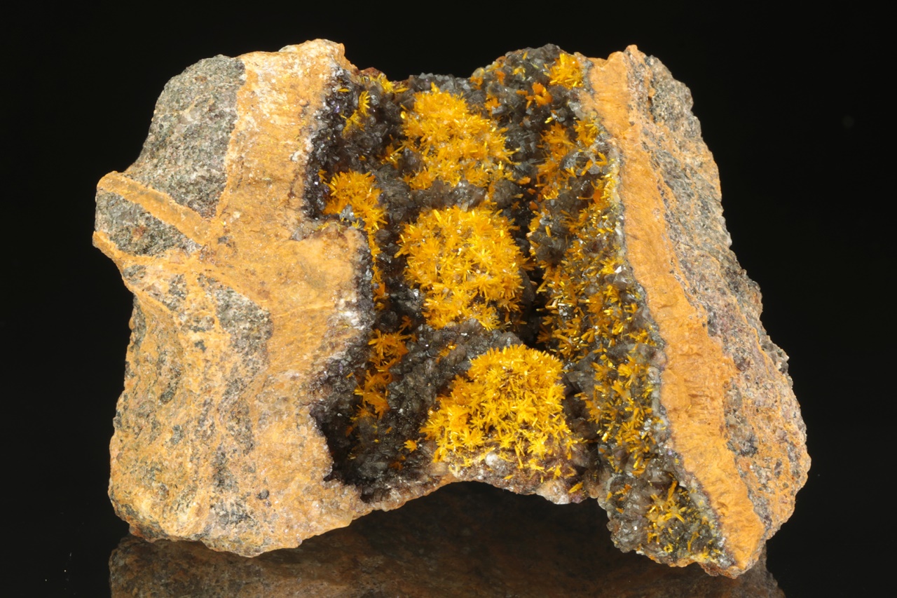 A stunning specimen of richly growing, vividly yellow uranyl silicate crystals on dark calcite. Columnar crystals, up to two millimeters in size, form radial aggregates resembling flowers.