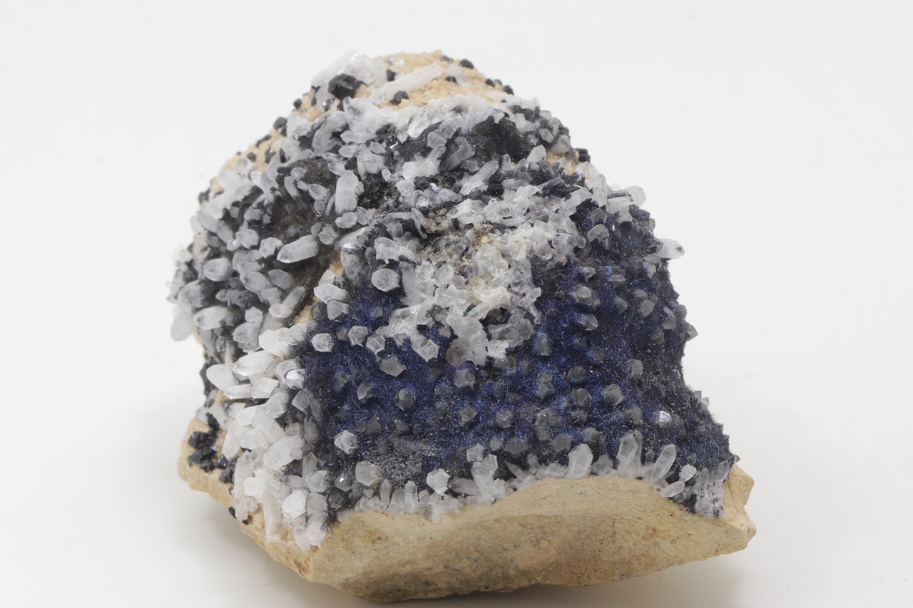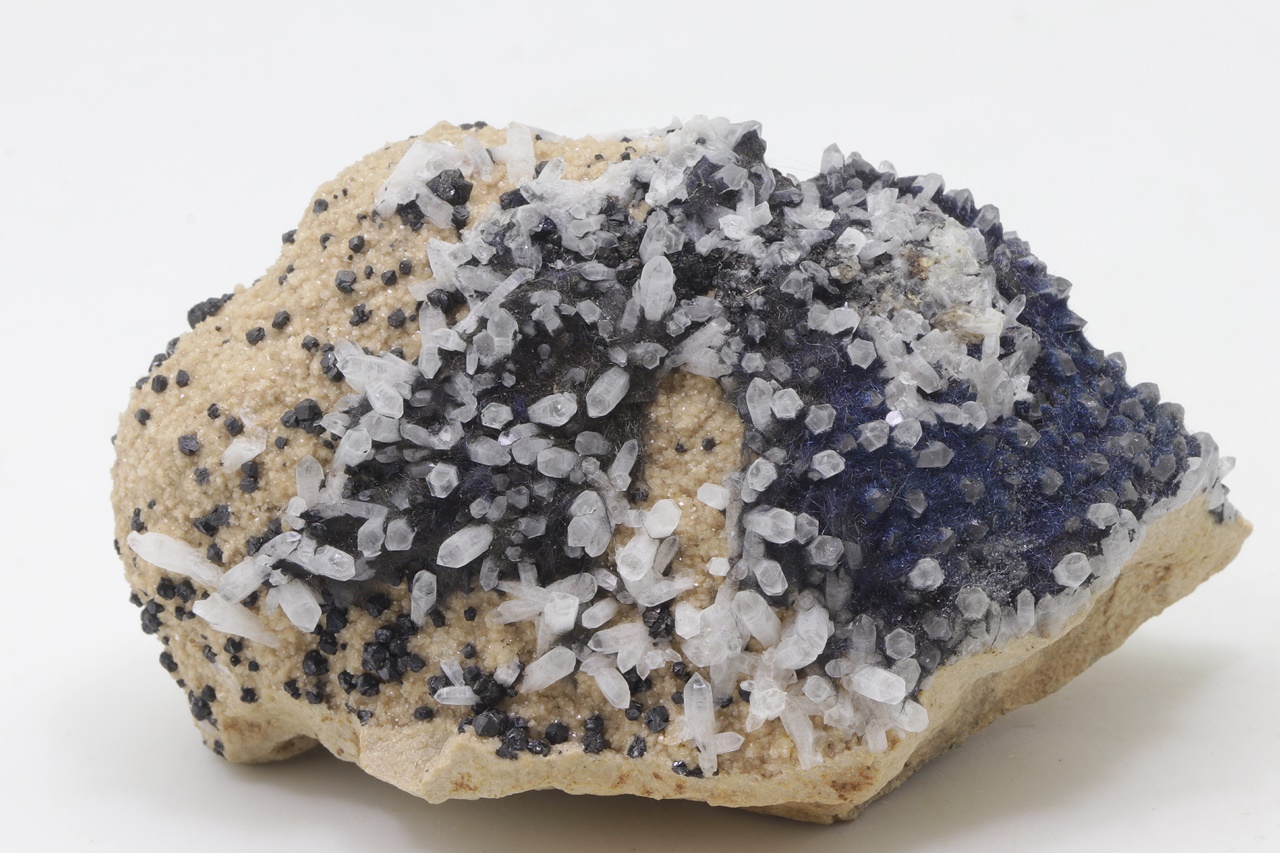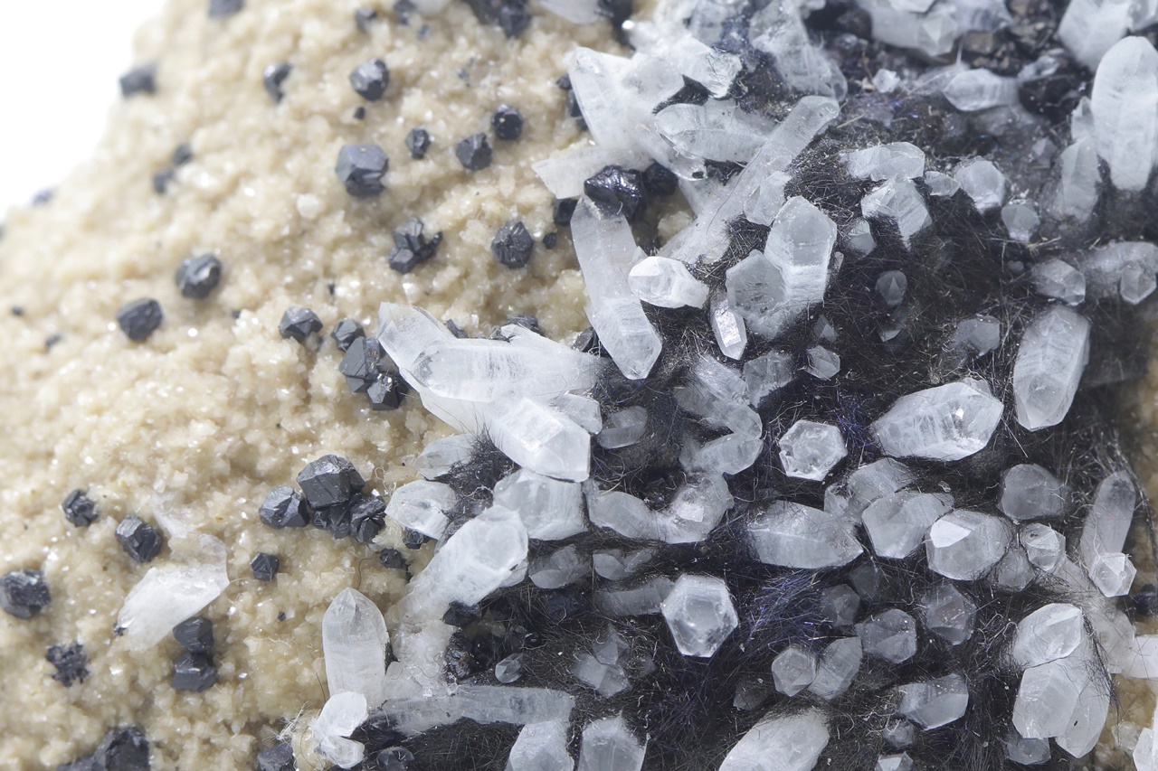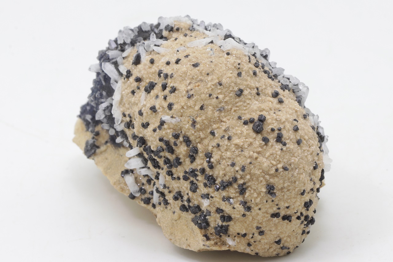 Boulangerite aggregates with black sphalerite crystals and quartz grown on beige dolomite.